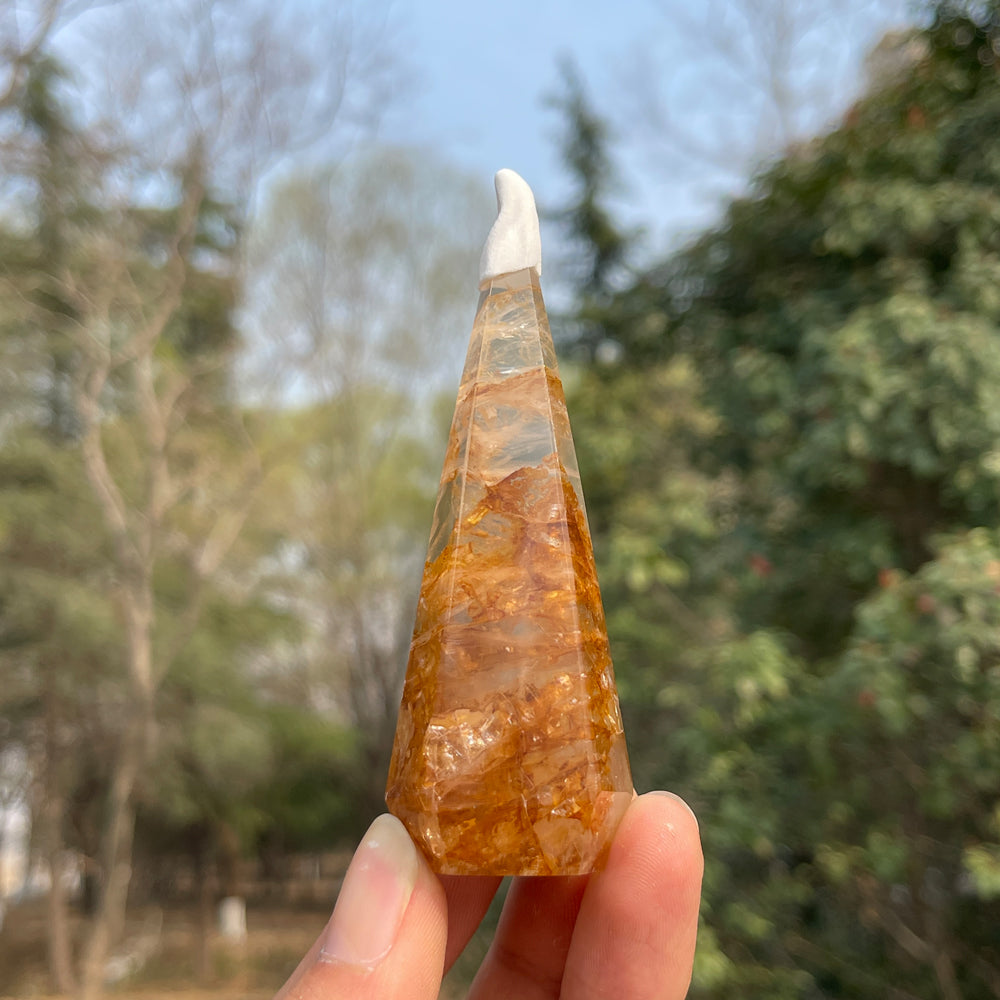 🌟Features:Each piece is carefully shaped into a sleek diamond tower, with a broad, stable base tapering upward to a sharp, precise point. The multi-faceted sides catch and reflect light, enhancing the stone’s golden glow, while the pointed tip directs energy upward, creating a sense of upward movement and focus. The tower’s form amplifies the stone’s natural flow, with the golden hues shifting and changing as light moves across its surface, making it a dynamic and captivating piece to behold.Inspired by the positive symbolism of the diamond tower—representing clarity, focus, and the amplification of energy—this design merges the warm, healing energy of Golden Healer Quartz with the transformative power of the tower. It symbolizes spiritual growth, manifestation, and the courage to turn your intentions into reality, infusing any space with a sense of warmth, clarity, and ancient wisdom.