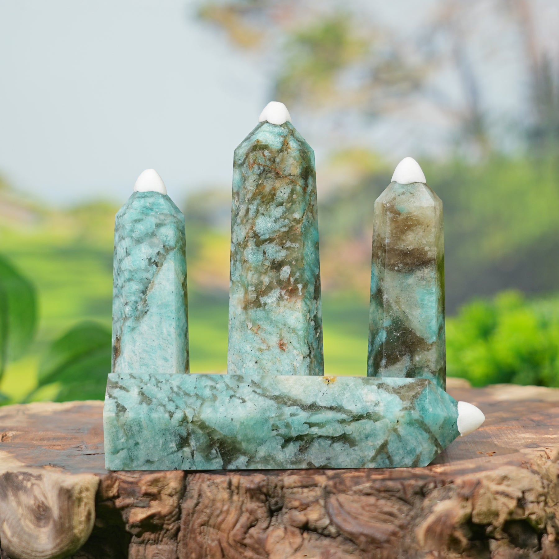 🌟Features:Inspired by the balanced energy of earth’s dual forces—think of a quiet forest where sunlight filters through mist 🌿☀️—these points are crafted from natural Amazonite and Smoky Quartz. Each column boasts soft, swirled hues of turquoise woven with warm, translucent gray-brown, creating a marbled pattern that feels like a tiny slice of a calm, sun-dappled landscape. The column shape mirrors the stone’s inherent balance.