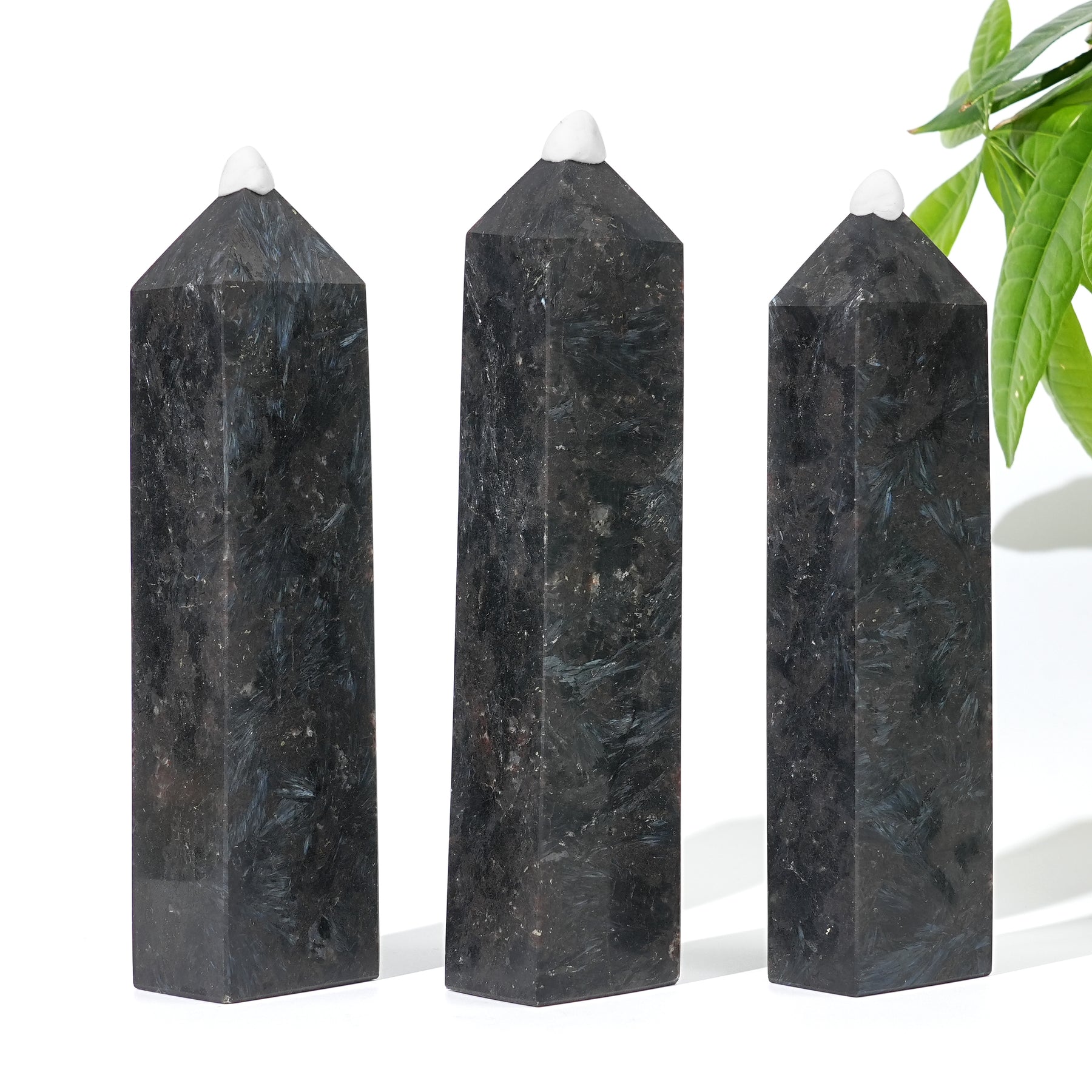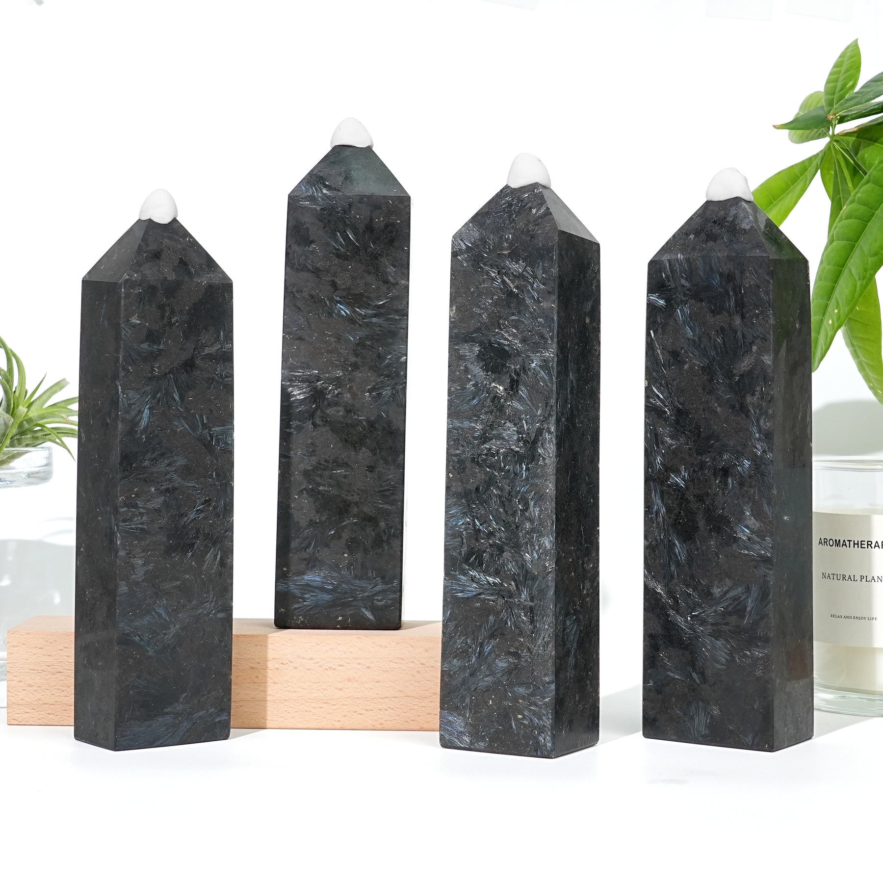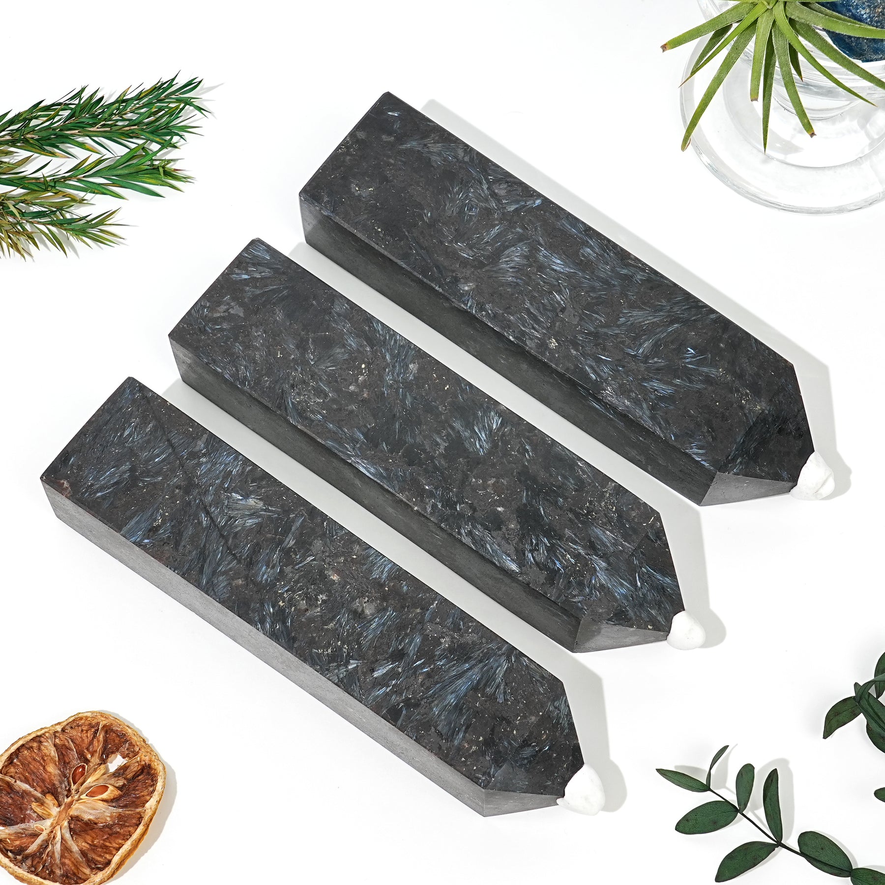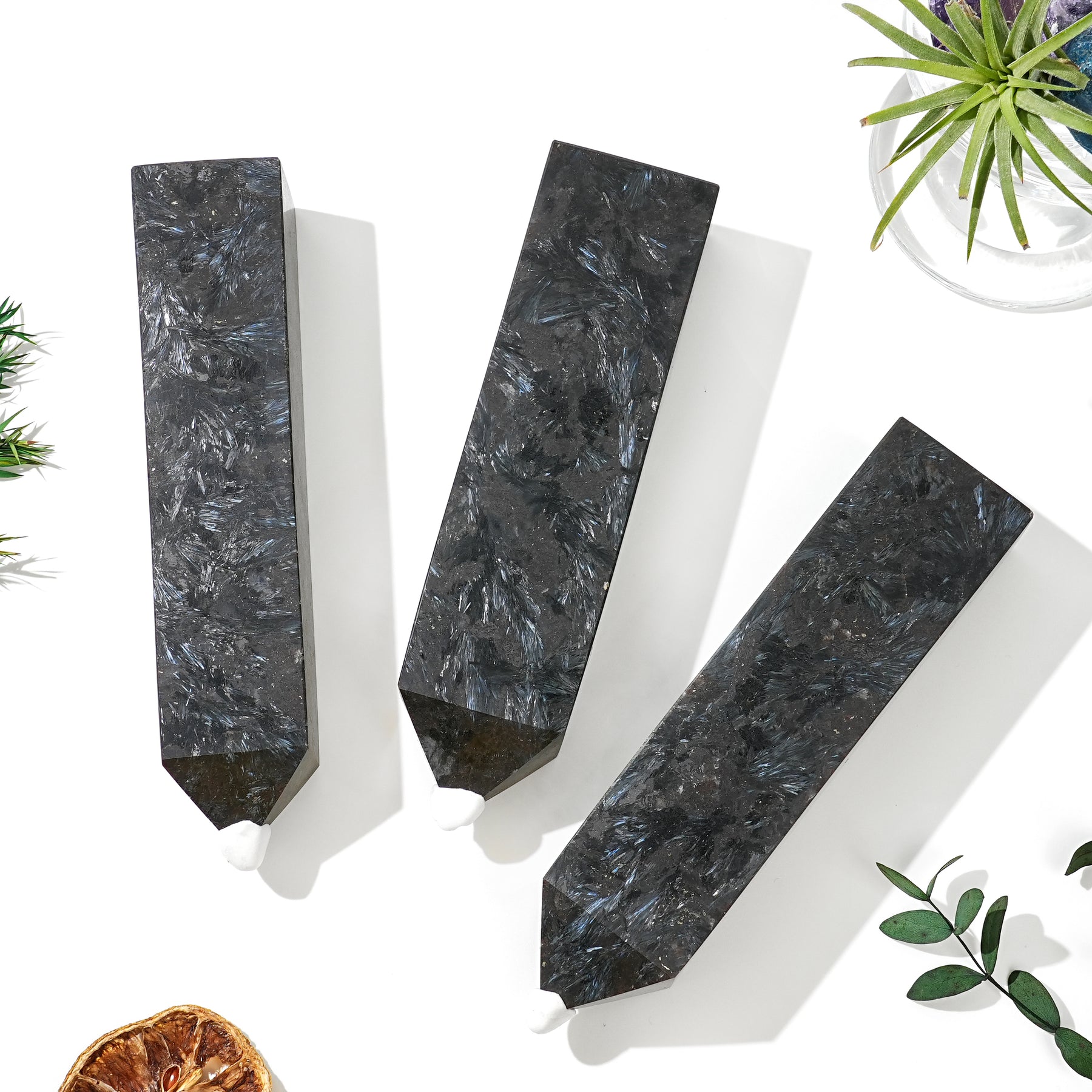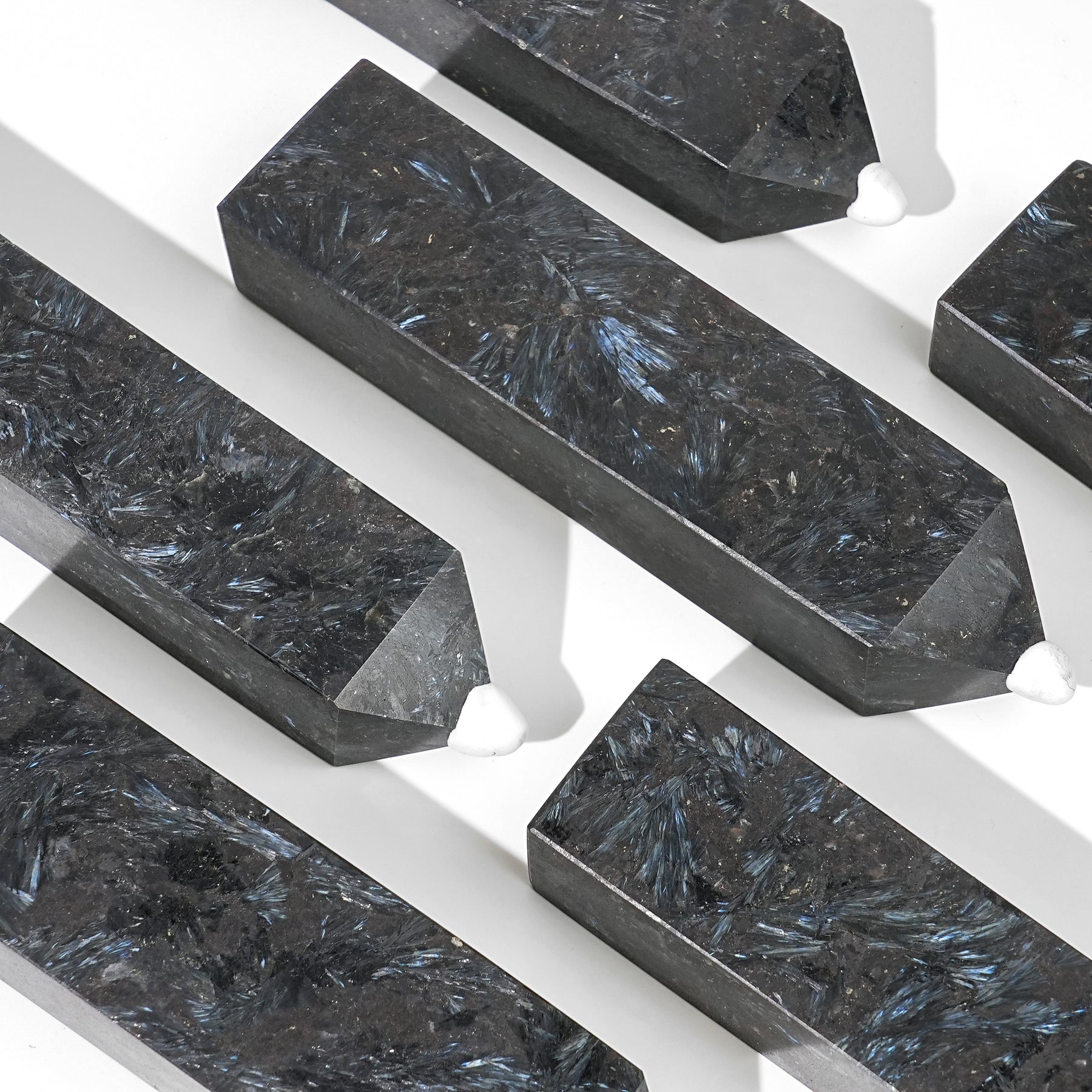 🌟Features:Inspired by the electrifying glow of a night sky fireworks show—where deep darkness bursts with vivid, fleeting light 🎆—these pieces are crafted from natural Arfvedsonite with Garnet Stone.Each sleek, tall point features a rich, inky black base woven with shimmering, needle-like blue and silver streaks , while tiny, warm red garnet flecks peek through like scattered embers. The point shape feels both steady and dynamic.