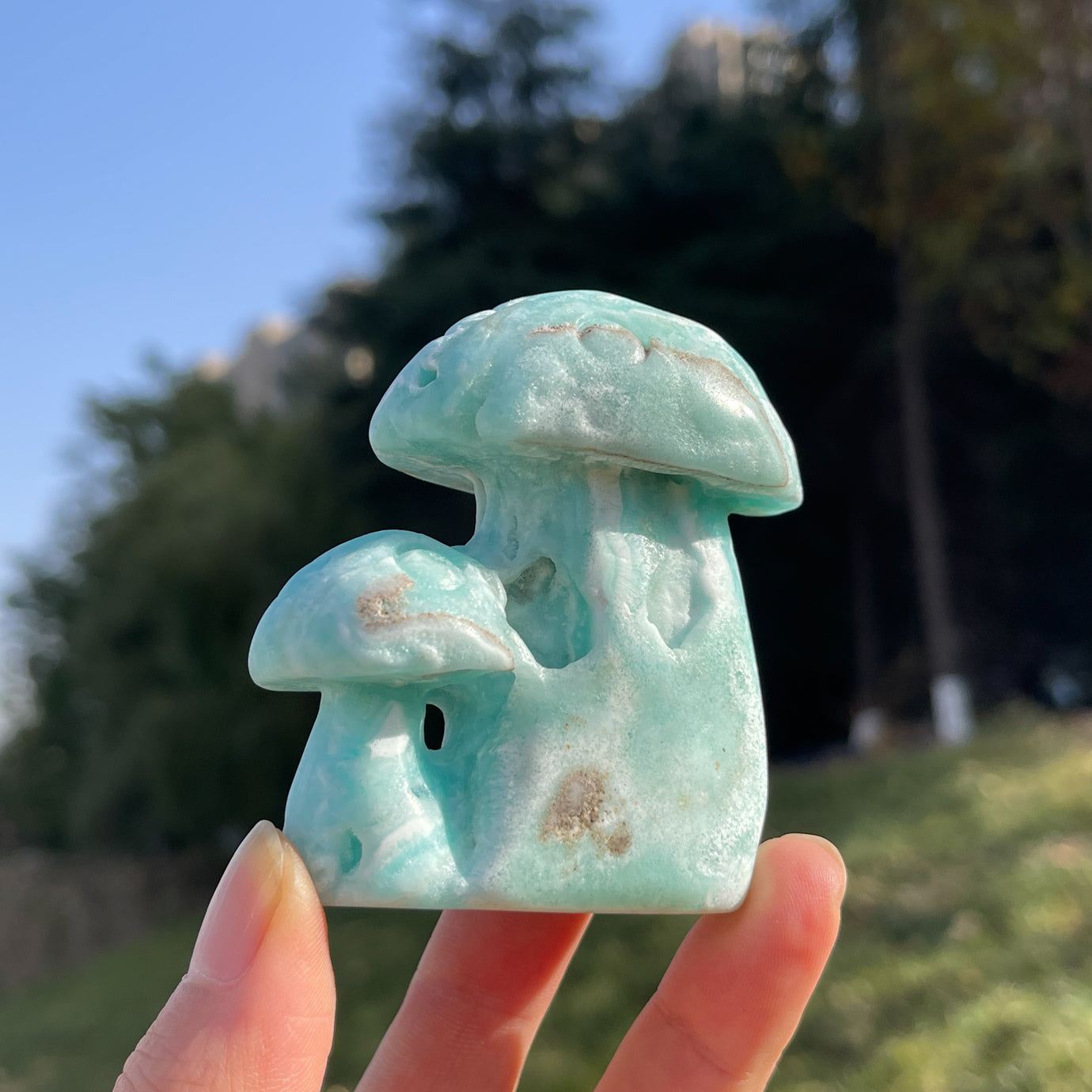 🌟Features:Inspired by growth + gentle abundance: Mushrooms symbolize new growth, connection to nature, and quiet prosperity—we paired this meaning with Hemimorphite to create a piece that feels like a cozy nod to the natural world🍄.Each piece features a charming "parent-and-baby" mushroom pair: rounded caps with delicate texture details, smooth stems, and a compact, palm-sized form.