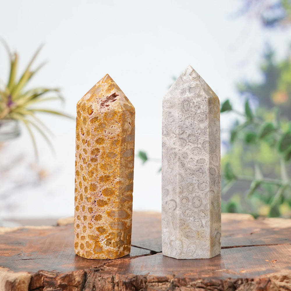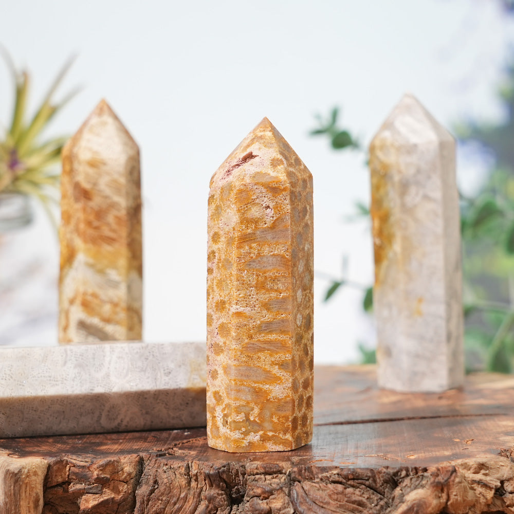 🌟Features:These are natural Coral Fossil Point pieces shaped into sleek—boasting earthy hues of warm gold, soft cream, and pale gray, with intricate fossilized coral patterns tiny “flower-like” or “honeycomb” textures, like a snapshot of ancient ocean life 🌊. Each point has sharp, clean edges and unique fossil details, with a smooth, organic surface that highlights the stone’s million-year-old geological story. Inspired by Coral Fossil’s link to “ancient wisdom” and the point’s symbolism of focused energy: this piece feels like a tiny, portable relic of the ocean’s past, perfect for display on desks, altars, or as a tactile connection to earth’s timeless history.