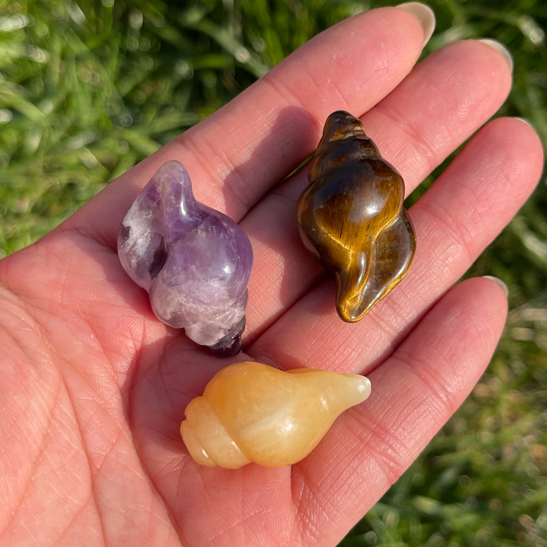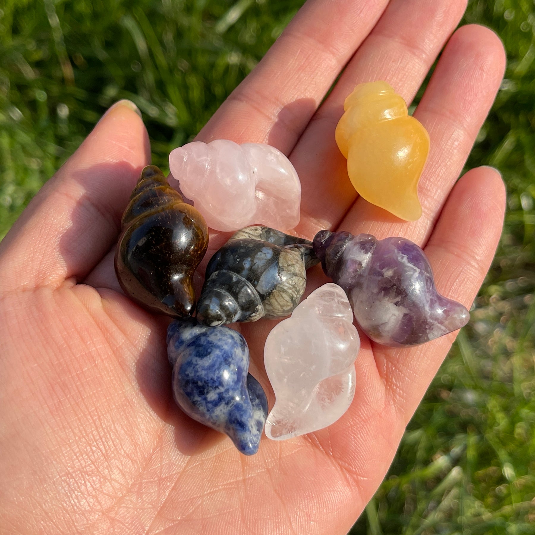 🌟Features:These tiny conch-shaped treasures are crafted from natural crystals, each shaped into the delicate, swirling curve of a sea conch—think the soft, spiral lines of ocean shells, condensed into a palm-sized, smooth companion 🌊.Every piece carries its own unique color and texture (from blushing pink to deep navy, warm amber to luminous clear) that glows gently in light. The conch shape draws inspiration from the sea’s calm, timeless energy: in many traditions, conchs symbolize connection to nature’s rhythm and quiet, steady strength—so holding one feels like tucking a little piece of the shore into your pocket.