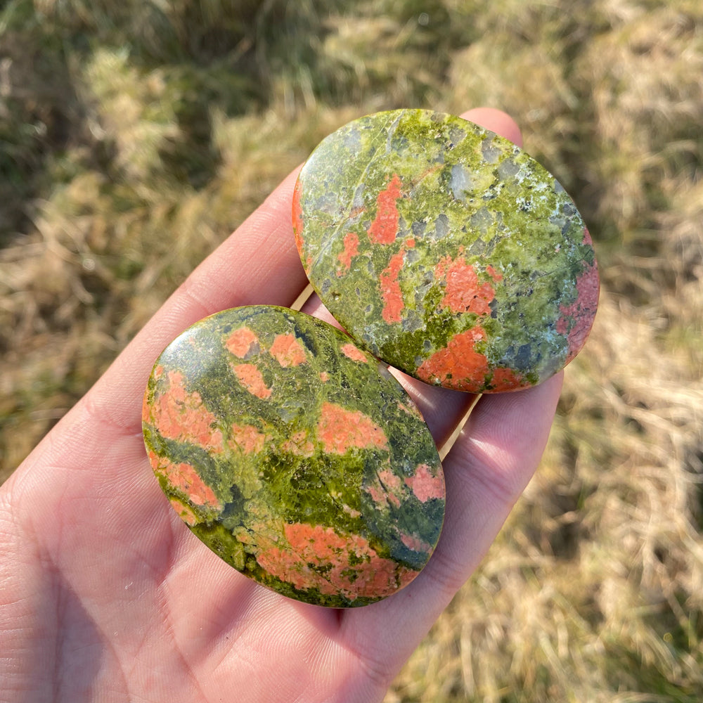 🌟Features:These tactile, grounding pieces are crafted from natural Unakite—a mineral with a vibrant blend of forest-green epidote and salmon-pink orthoclase feldspar, dotted with subtle gray veins, like a sunset over a mossy forest 🌄. They are shaped into smooth, oval palm stones that fit perfectly in the palm, with a gently curved surface designed for holding and fidgeting. Each piece has unique color patterns, making every palm stone one-of-a-kind.Inspired by the palm stone’s symbolism of grounding, comfort, and mindful presence (paired with Unakite’s reputation as a "stone of balance and emotional healing"), this design blends earthy energy with gentle practicality: the green epidote evokes growth and stability, while the pink feldspar mirrors warmth and compassion, creating a piece that feels both rooted and nurturing.
