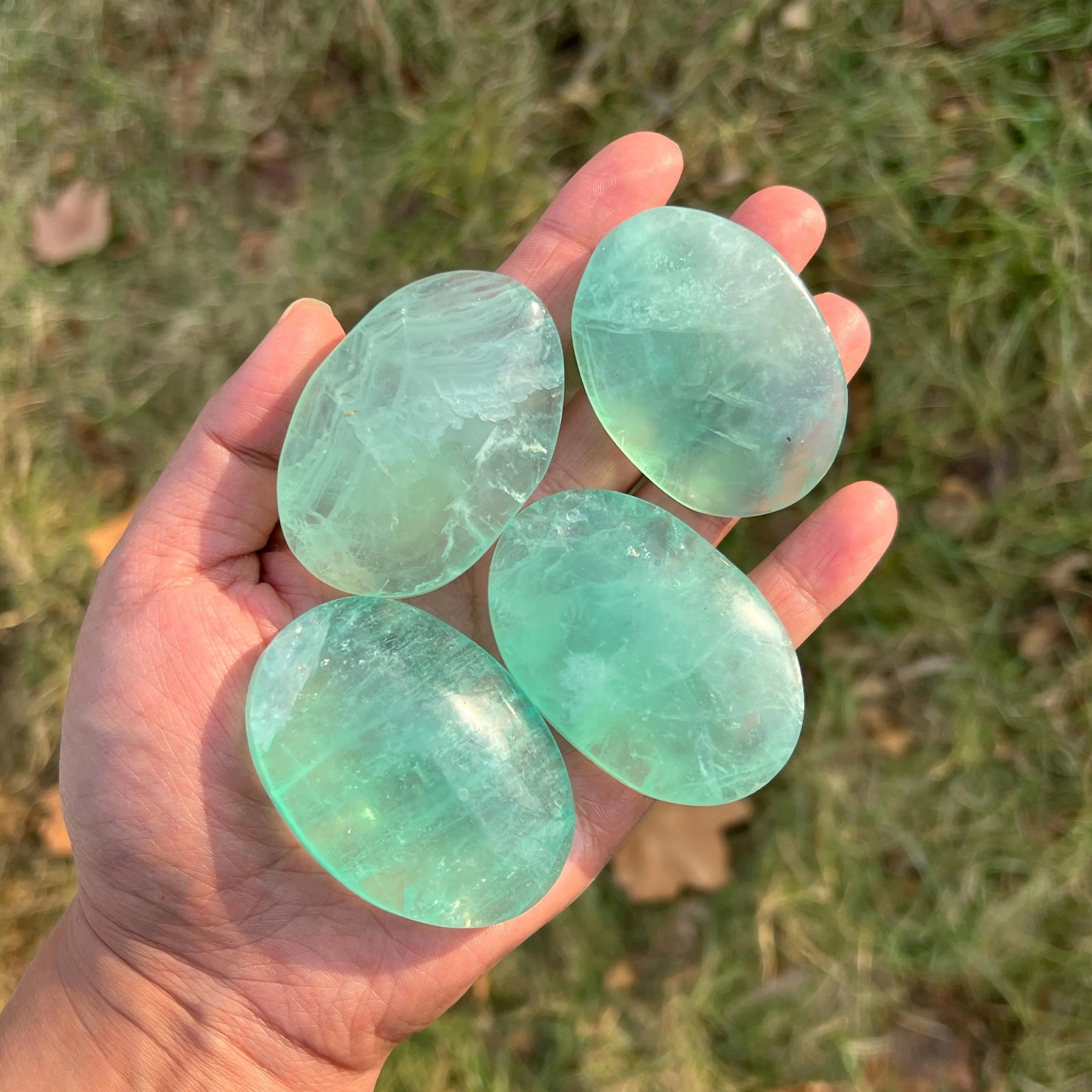 🌟Features:Crafted from natural Neon Blue Fluorite—a stone with a vivid, glowing turquoise hue (like sunlight filtering through a clear, tropical lagoon 🌊)—these palm stones are shaped into smooth, oval forms that fit perfectly in the curve of your hand.Each piece carries subtle, wispy internal patterns that catch light softly, and its rounded, ergonomic shape is designed for easy holding—drawing inspiration from the "palm stone" tradition of keeping calming energy within reach. The neon blue shade of the fluorite adds a bright, uplifting vibe, making it feel like a tiny piece of fresh, open sky you can tuck into your pocket.