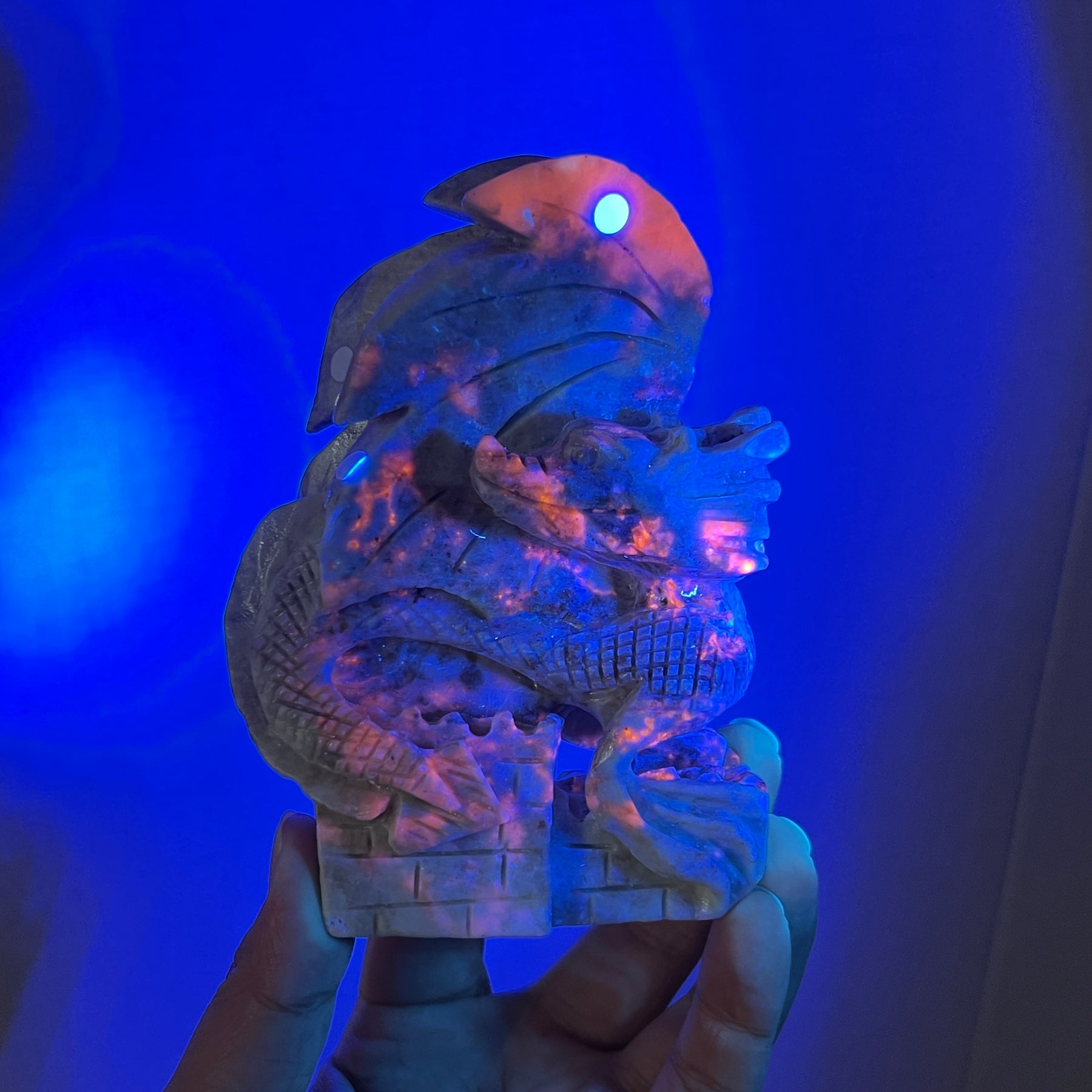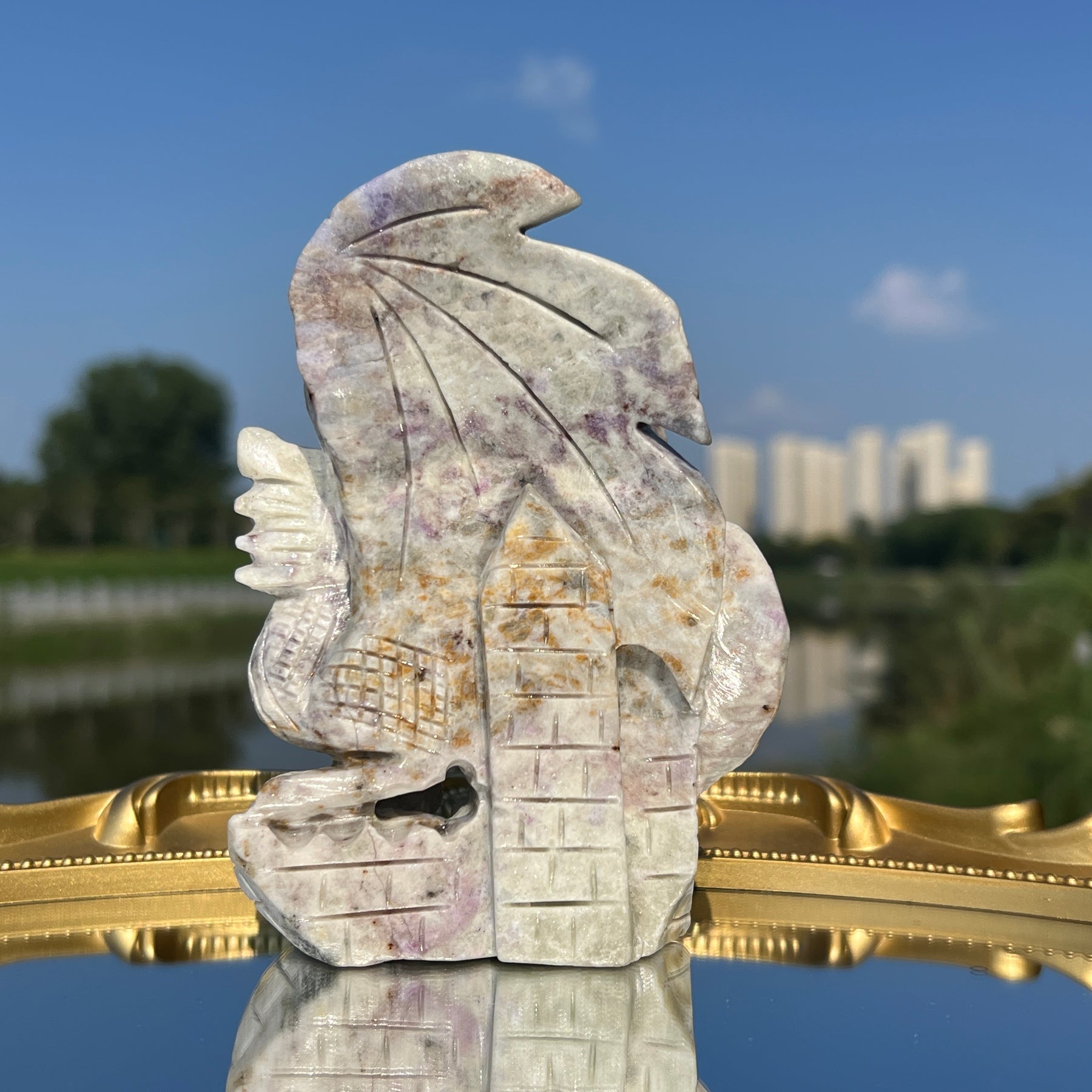 Carved from natural hackmanite, this dragon features a mix of light tones with purple hues, looking like a mythical beast from ancient legends 🐉. Its detailed wings, scales, and the little base it rests on make it charming.