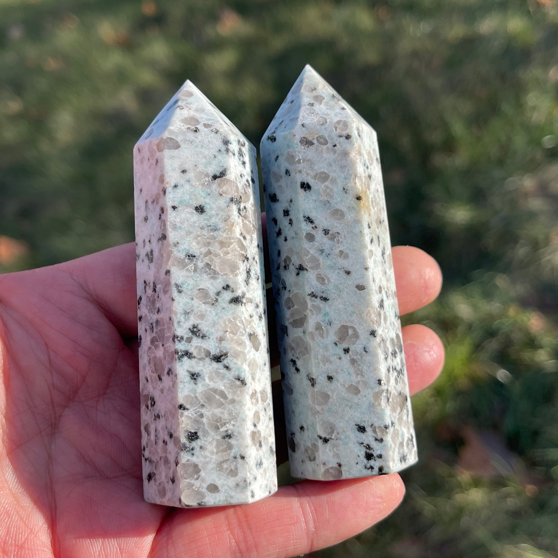 🌟Features:These are natural Kiwi Jasper pieces shaped into sleek—boasting a soft off-white base dotted with tiny gray, black, and pale green flecks like the textured skin of a fresh kiwi fruit 🥝. Each point has sharp, clean edges and unique speckle patterns , with a smooth, earthy surface that highlights the stone’s organic, nature-woven appearance. Inspired by Kiwi Jasper’s fresh, lively aesthetic and the point’s symbolism of focused energy: this piece feels like a tiny, portable slice of a sunlit orchard, perfect for display on desks, altars, or as a tactile companion for daily moments.