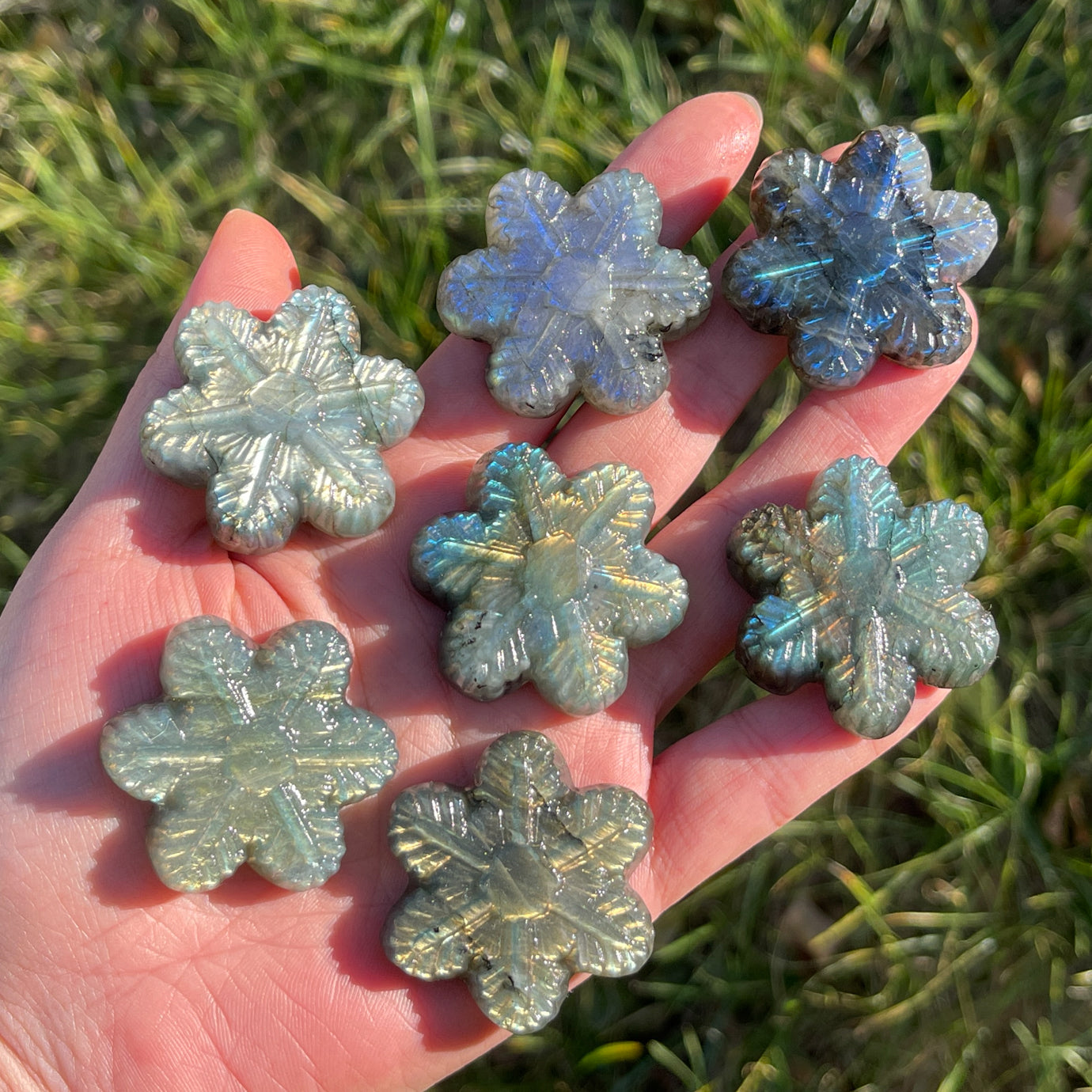 🌟Features:Inspired by the quiet magic of winter snowflakes symbols of uniqueness and gentle transformation ❄️and the ethereal glow of Labradorite, these are crafted from natural Labradorite. Each snowflake shape boasts delicate, layered “petals” that mirror the intricate pattern of real snowflakes—all brought to life by the stone’s deep, smoky gray base. When light hits, the surface shimmers like sunlight on fresh snow, with every tiny angle catching a new hue; no two snowflakes are identical, making each one a one-of-a-kind blend of earthy depth and celestial sparkle.