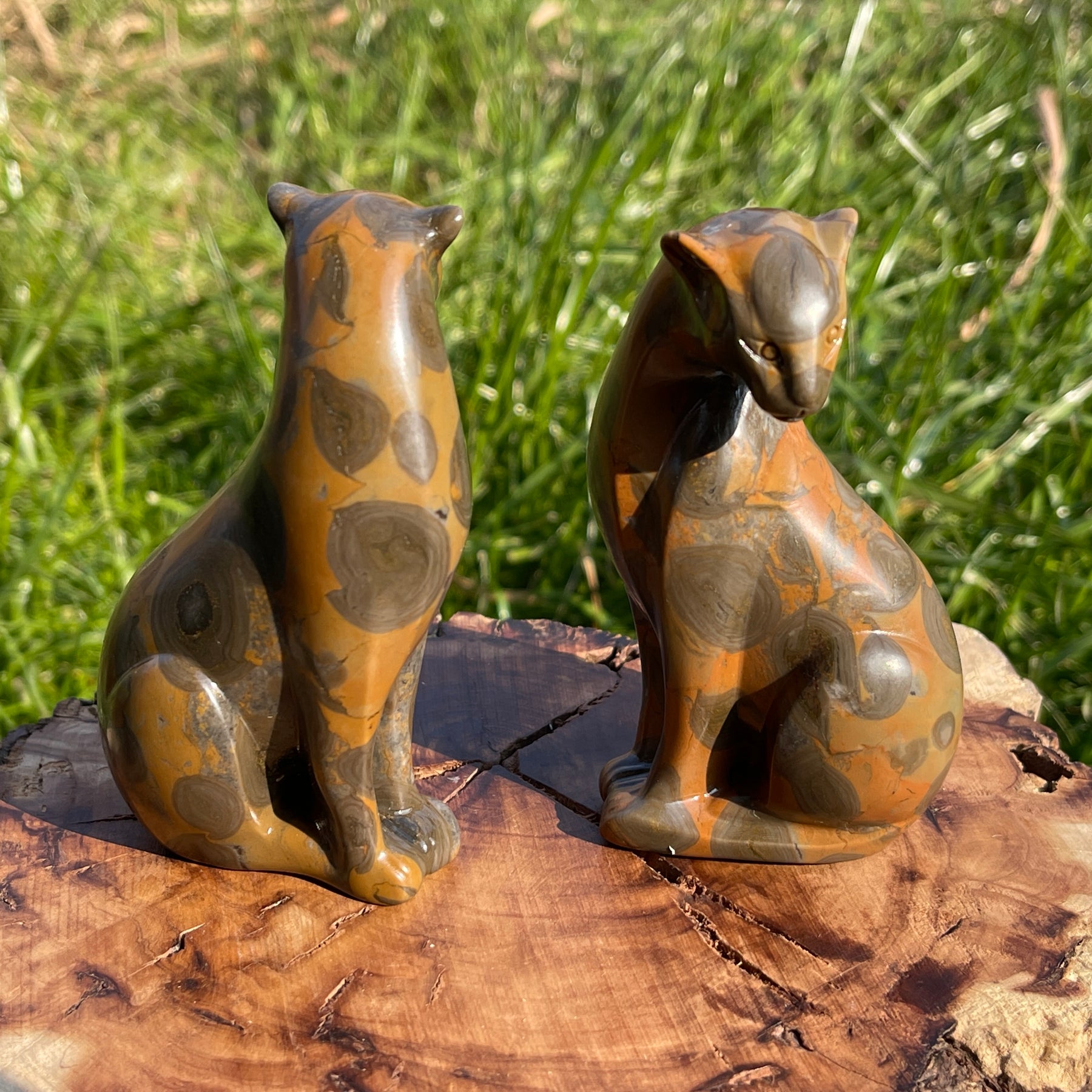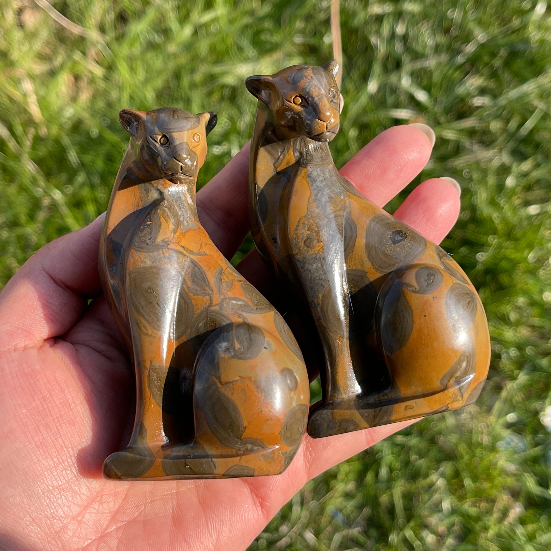 🌟Features:This striking piece is crafted from natural Leopard Skin Jasper—a mineral with bold, swirled bands of warm amber, deep charcoal, and soft tan like the dappled coat of a wild leopard, with organic, circular patterns that catch light like sun on savanna grass 🌾!Shaped into a "looking back" leopard with a sleek, curved body, alert facial details, and a smooth, tactile surface, each carving carries the stone’s signature wild charm: it feels solid yet graceful to the touch, like holding a tiny fragment of the jungle’s quiet strength.Inspired by the "looking back" leopard’s symbolism of "awareness & reflection", this design blends untamed beauty with intentional energy: the leopard’s turned posture evokes mindfulness pausing to notice the journey so far, while the jasper’s dappled pattern mirrors the balance of boldness and calm in nature. No two carvings are identical each has unique pattern placements and subtle shape details,making your piece a one-of-a-kind accent for shelves, desks, or any space that needs a dose of wild wisdom.