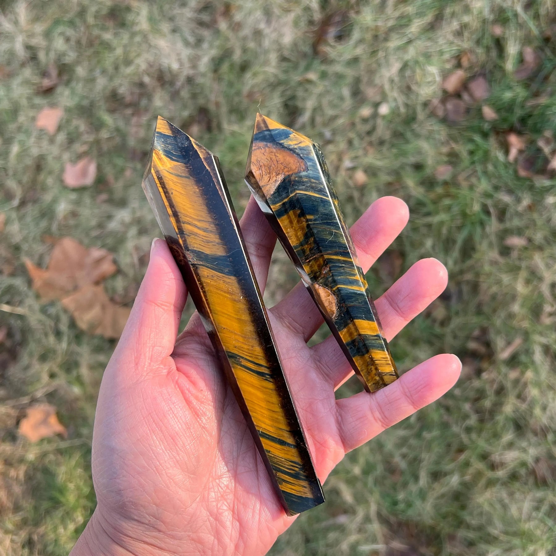 🌟Features:This crafted from natural Blue and Yellow Tiger's Eye—a mineral that blazes with bold, striped hues of deep blue and golden yellow like a sunset over a wild savanna 🌅!Shaped into a sleek wand with an elongated, smooth body and a sharp, focused tip that fits comfortably in the hand,each one carries the stone’s signature "tiger-like" charm: light catches its layered, wavy stripes to create a shimmering, dynamic glow, as if holding a fragment of untamed natural energy.Inspired by the wand’s symbolism of "directed courage"paired with Tiger's Eye’s reputation as a "stone of strength",this design blends wild vibrancy with intentional purpose: the wand’s slender form acts as a channel for focused, confident energy, while the blue-and-yellow stripes evoke the balance of calm and bold action.