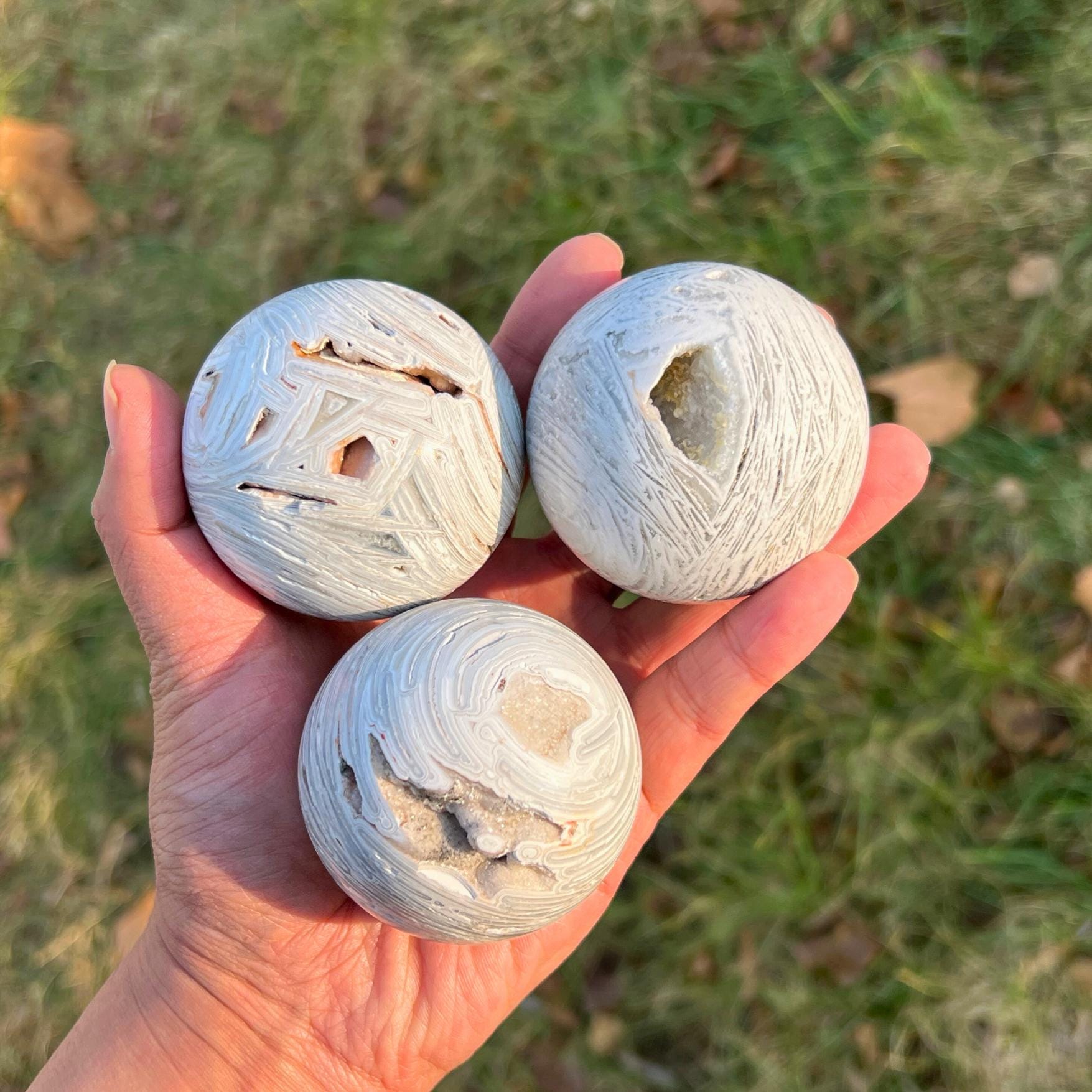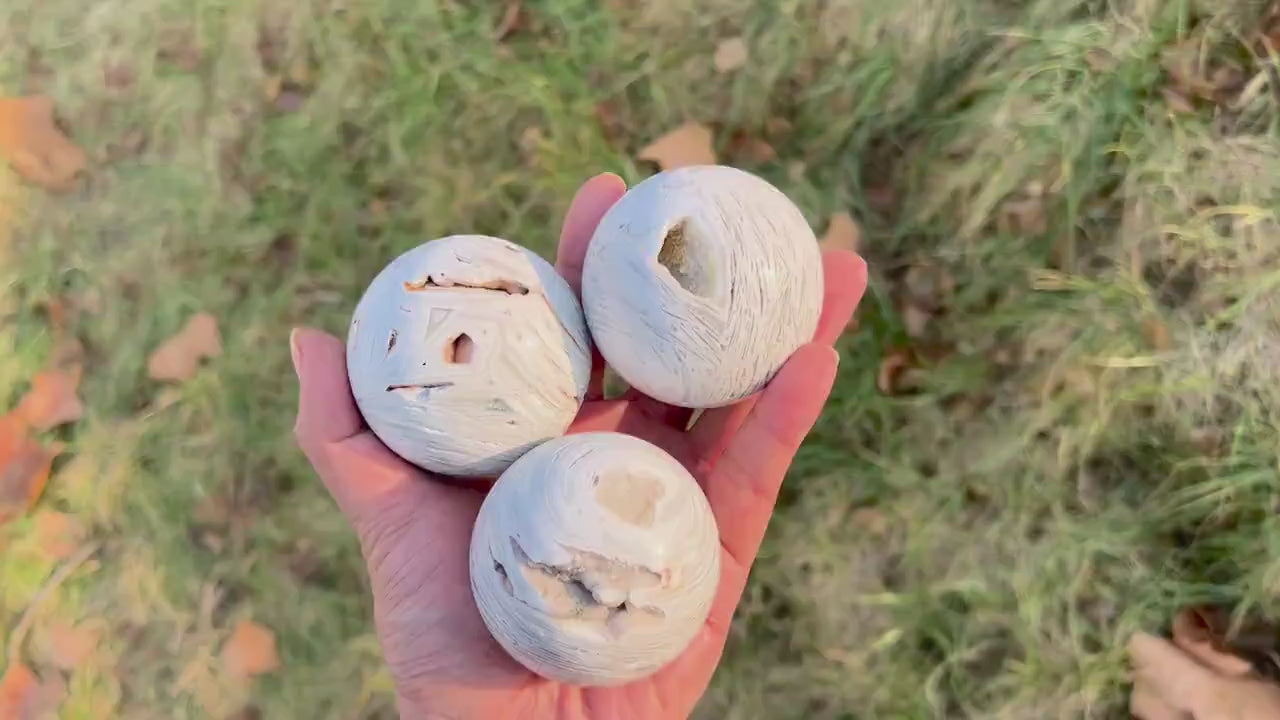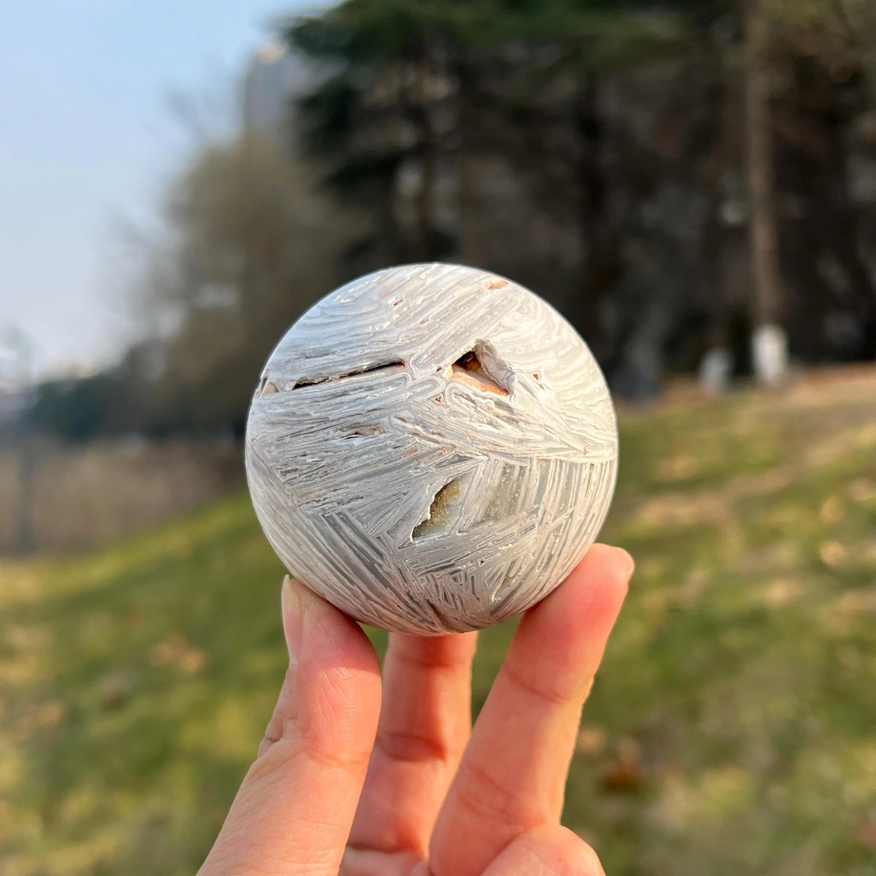 🌟Features:This ethereal piece is crafted from natural White Mexican Agate—a mineral with soft, swirling bands of pale gray and milky white (like misty clouds woven into stone 🌥️!). Shaped into a smooth sphere (with a rounded, tactile form that fits perfectly in the palm), each one carries the stone’s signature calm charm: light catches its layered, wavy patterns to create a subtle, dreamy glow, and the sphere’s open "geode-like" pockets add a touch of wild, natural beauty.Inspired by the sphere’s symbolism of "wholeness & balance" (paired with White Mexican Agate’s reputation as a "stone of quiet calm"), this design blends gentle elegance with earthy warmth: the sphere’s rounded shape evokes completeness, while the agate’s misty bands feel like a breath of fresh, morning air. No two spheres are identical (each has unique wave patterns and pocket details), making your piece a one-of-a-kind accent for desks, bedside tables, or any space that needs a dose of soft serenity.