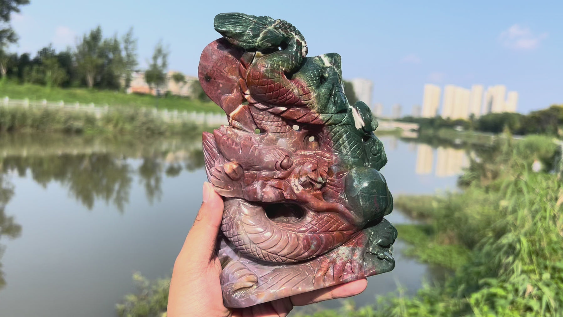 Carved from natural Ocean Jasper, this dragon showcases a stunning blend of green and reddish hues, looking like a mythical beast from the depths of the sea 🐉. Its detailed scales, winding body, and dynamic posture make it vivid and charming.