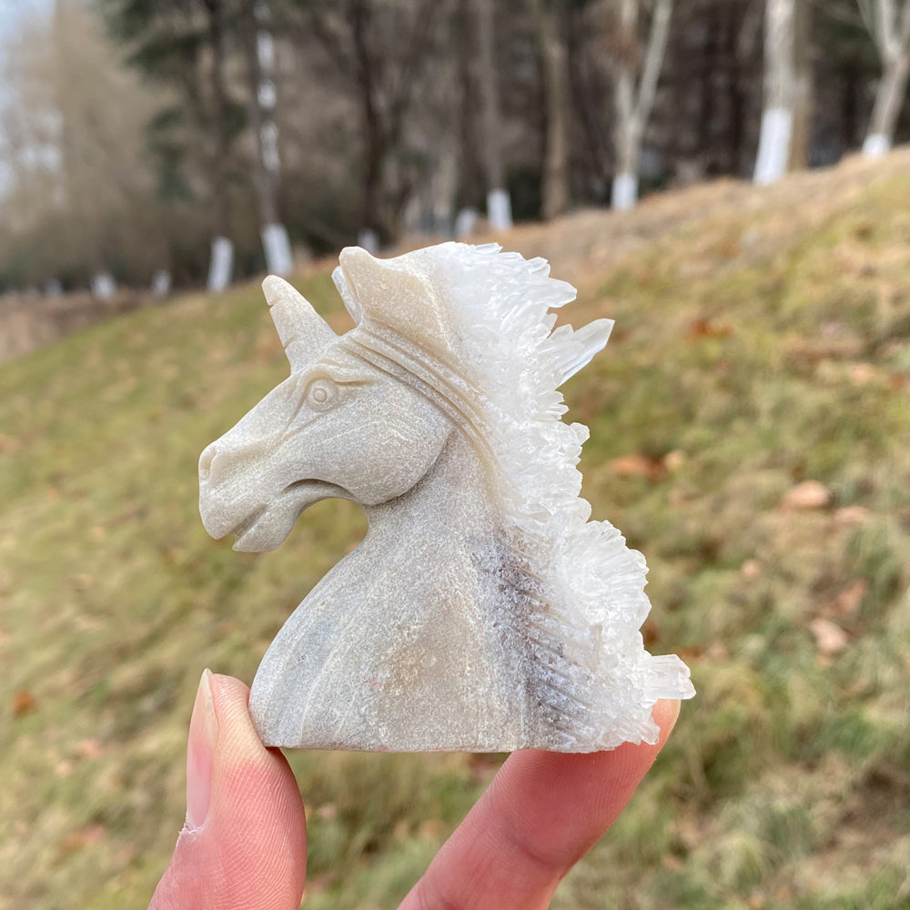 🌟Features:These magical, tactile pieces are carved from natural stone, with a mane made of sparkling Clear Quartz clusters—crystal points that shimmer like frozen starlight ✨. The unicorn’s head is shaped from smooth, earthy-toned stone, featuring detailed facial features, a pointed horn, and a flowing, crystalline mane that catches light from every angle. Each piece is unique, with natural variations in stone color and quartz cluster density, making every unicorn a one-of-a-kind treasure.Inspired by the unicorn’s symbolism of magic, purity, and hope (paired with Clear Quartz’s reputation as a "master healer" and energy amplifier), this design blends whimsical charm with powerful energy. The earthy stone base evokes grounding stability, while the quartz mane mirrors the magic of spiritual clarity and light, creating a piece that feels both rooted and ethereal.