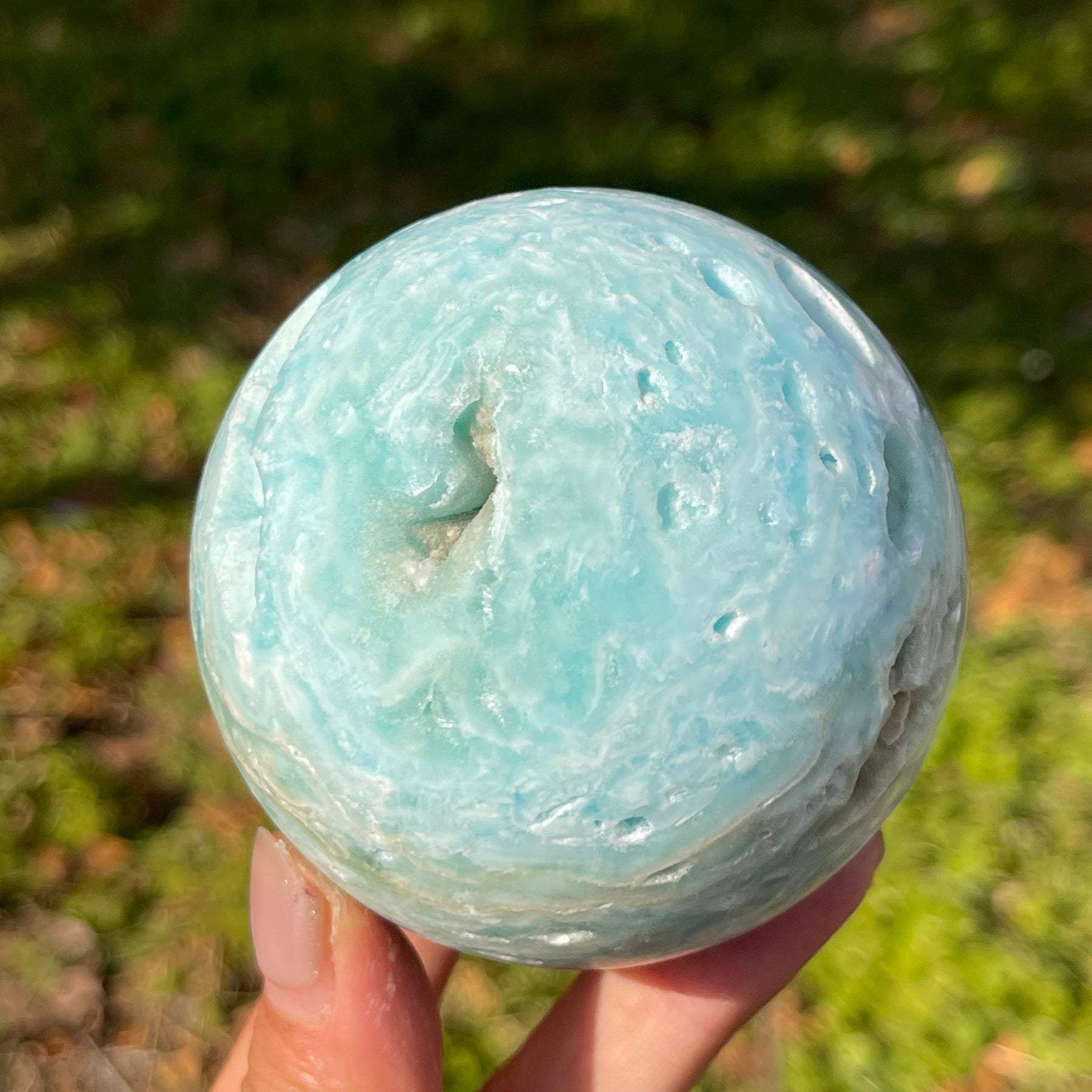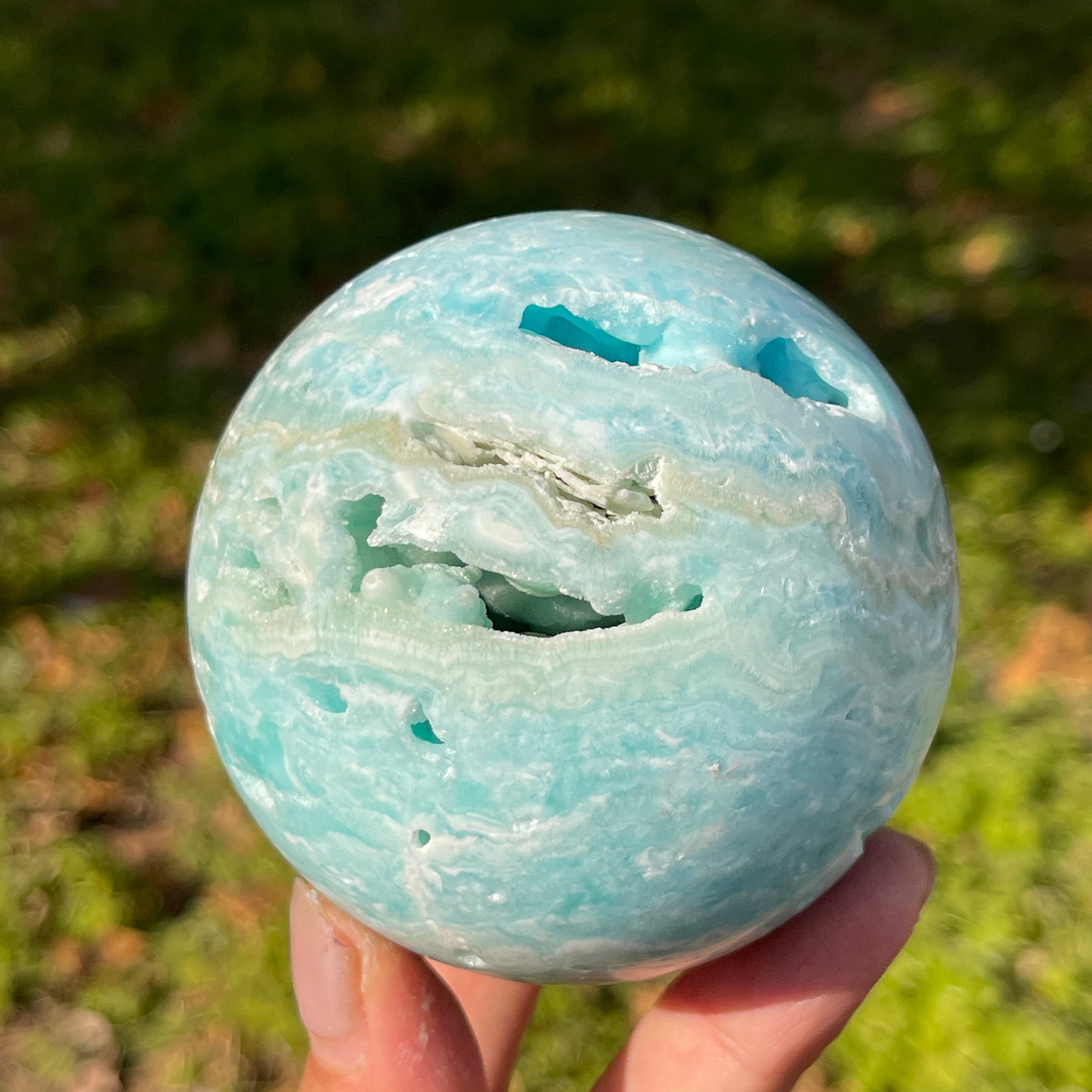 🌟Features:Each piece is carefully shaped into a perfect sphere, with a smooth, rounded surface that highlights the stone’s soft color gradients and internal textures. The sphere’s form amplifies the stone’s natural flow, with the wavy banding wrapping around the ball like gentle ocean currents, while the open geodes offer a glimpse into the stone’s hidden beauty. The smooth, organic curves of the sphere complement the natural patterns of the Hemimorphite, creating a piece that feels both delicate and grounded.Inspired by the positive symbolism of the sphere—representing wholeness, unity, and the infinite flow of energy—this design merges the calming, oceanic energy of Hemimorphite with the transformative power of the sphere. It symbolizes emotional healing, gentle growth, and the beauty of embracing life’s fullness, infusing any space with a sense of calm, warmth, and natural elegance.