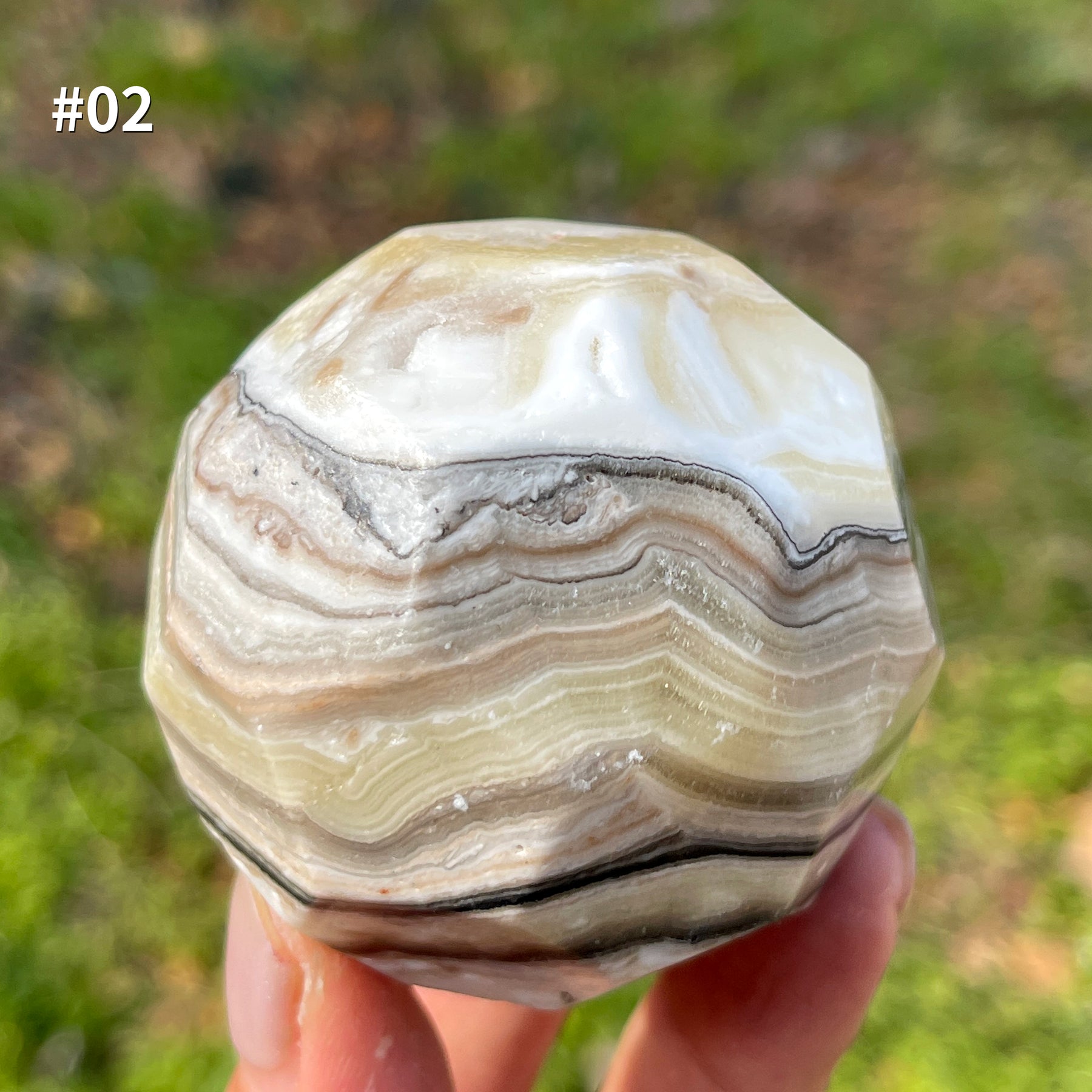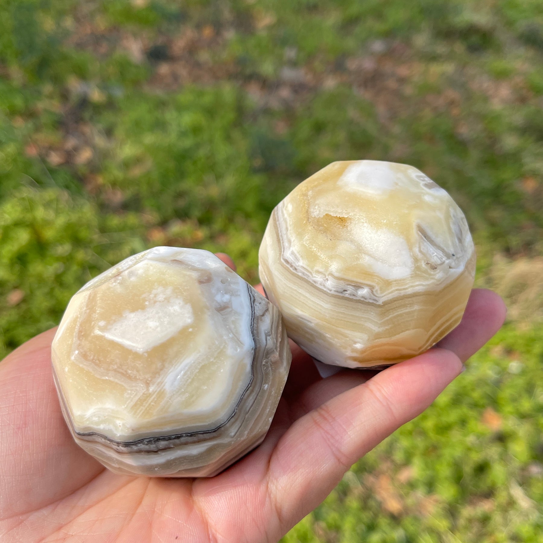 🌟Features:Each piece is carefully formed into a faceted sphere, with multiple neat, symmetrical flat geometric surfaces that combine the full roundness of a crystal ball with the modern minimalist beauty of faceted cutting. The faceted structure enhances light refraction across the surface, making the soft yellow and white layers glow gently and highlighting the unique layered beauty of Mexican Calcite. The overall shape is balanced, smooth, and full of gentle advanced aesthetic, perfectly integrating the natural warmth of Mexican Calcite with the harmonious energy of a spherical form.Inspired by the positive symbolic meaning of faceted sphere — representing wholeness, energy balance, inner peace, warmth gathering, positive resonance and spiritual comfort, paired with the mild, nurturing energy of natural Mexican Calcite, this creation draws inspiration from the soft warmth of natural minerals and the geometric harmony of faceted design. It symbolizes embracing calmness, gathering gentle energy, soothing the soul, and bringing a warm, peaceful and cozy atmosphere to any space.