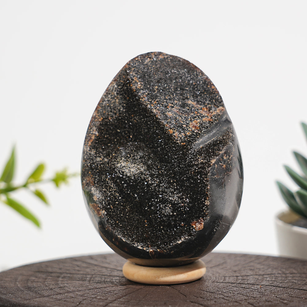 🌟 Features:The surface is a study in contrast: the outer shell is smooth and rounded, shaped into a classic egg form, while the interior is opened to reveal a dense, sparkling cavity lined with tiny, dark brown to black crystals, often dotted with larger, translucent calcite crystals that catch light like hidden treasures.Inspired by the meaning of the egg—potential, rebirth, and the quiet magic of creation—this design merges the grounding, protective energy of Septarian with the egg’s spirit of new beginnings. The egg is a symbol of life’s infinite potential, of something small and precious holding the promise of something great, and this carving captures that essence, infusing any space with a sense of mystery, hope, and ancient wisdom.