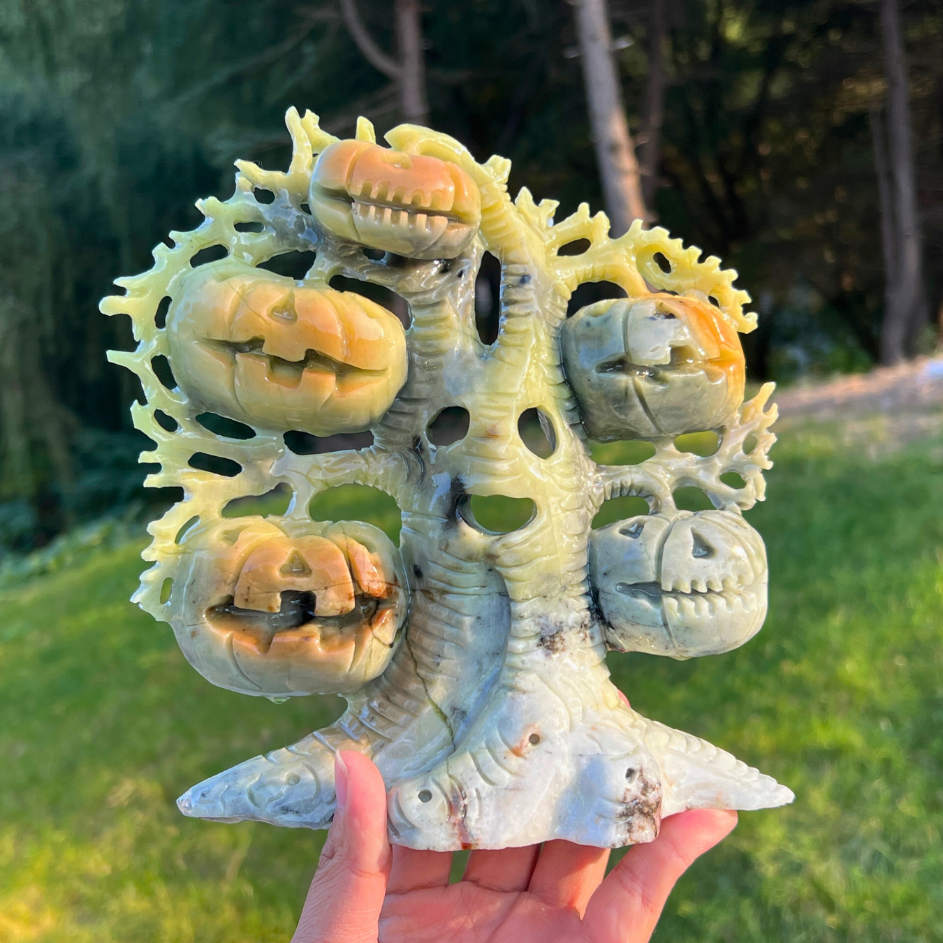 Handcrafted from natural Serpentine, this carving features a whimsical tree adorned with detailed pumpkin faces—boasting earthy green hues and intricate openwork design, each piece is one-of-a-kind, perfect for Halloween vibes 🎃🌳✨.