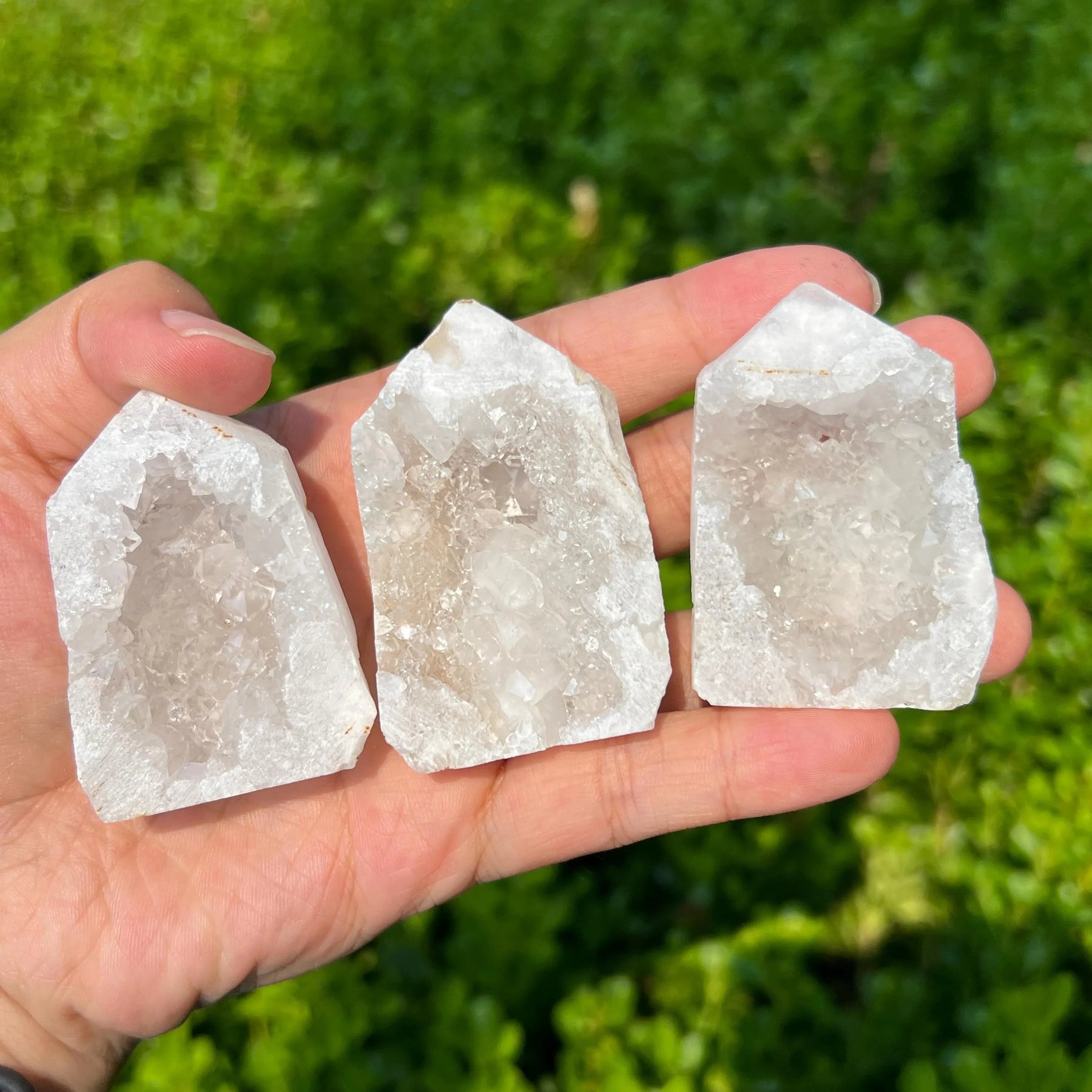 Carved from natural Moroccan agate geode, this point features a white, crystalline interior with a rugged outer surface, like a mini crystal cave ✨. Its pointed shape and unique geode design make it eye - catching.