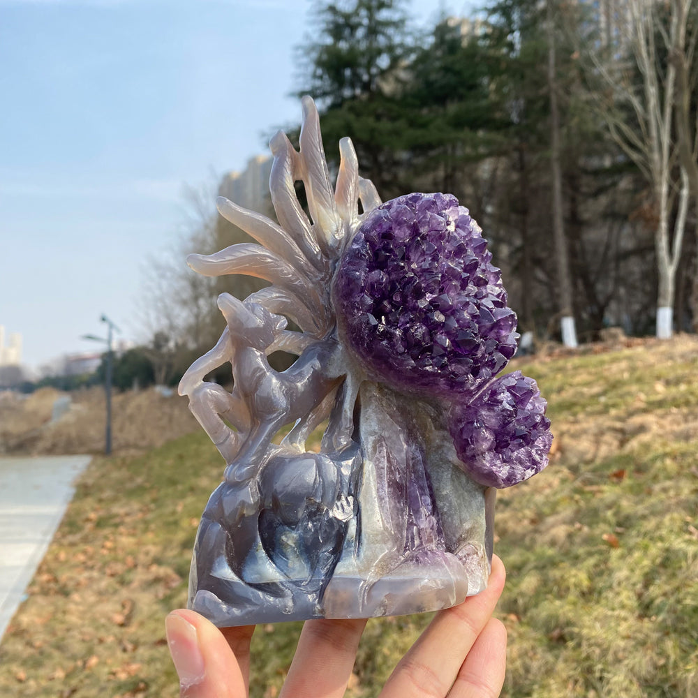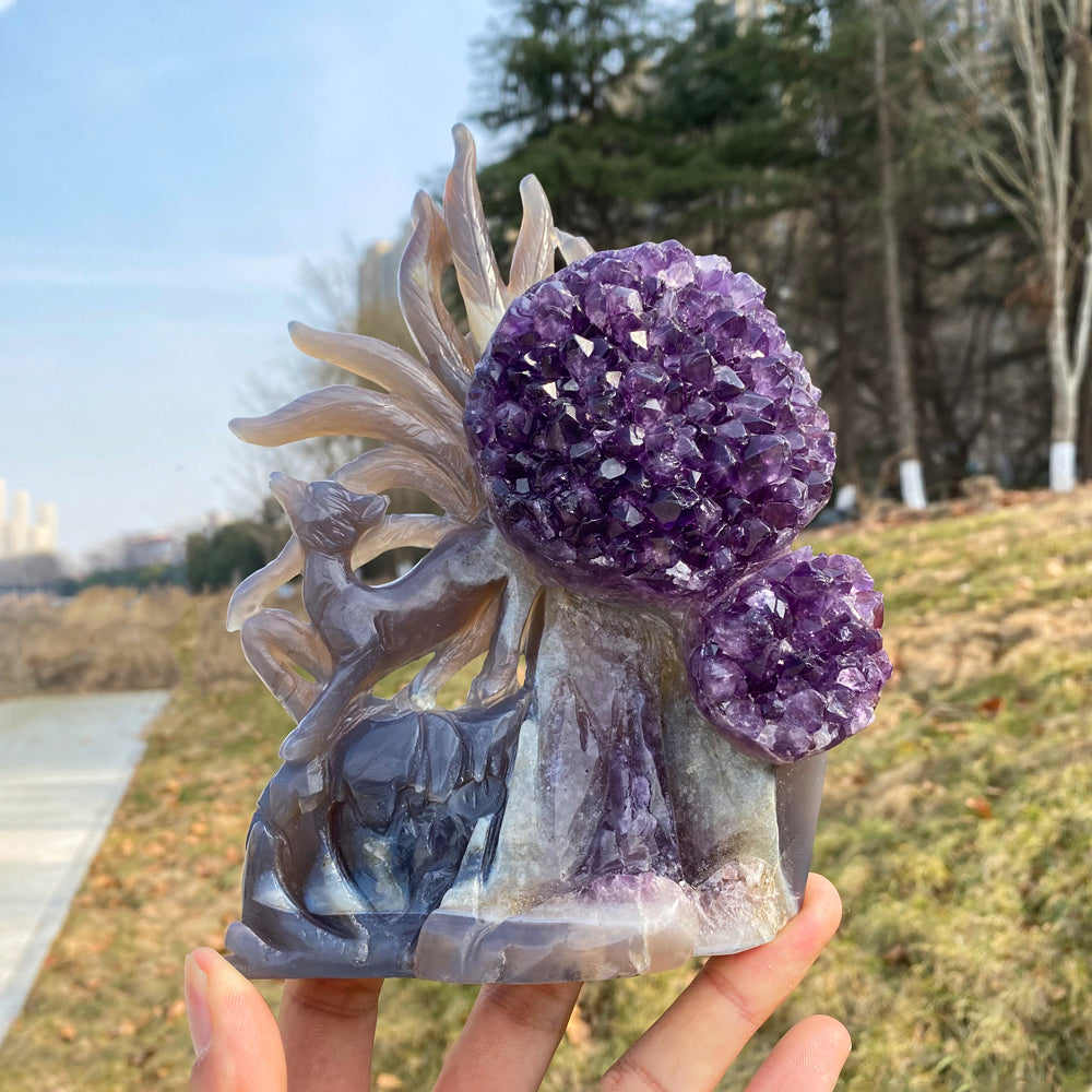 Natural Carving Agate With Amethyst Geode Nine-Tailed Fox