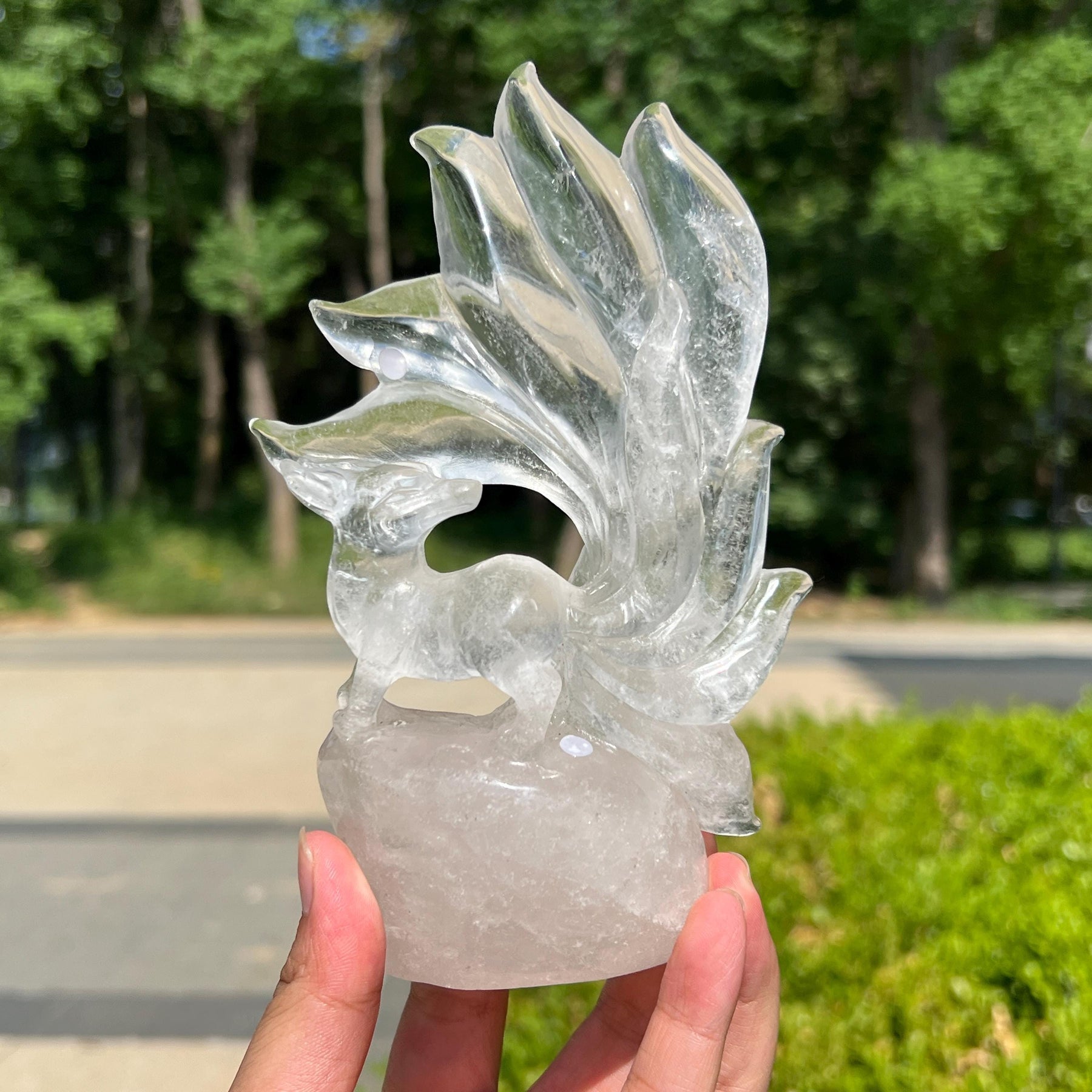 Care Tips: Wipe gently with a soft dry cloth. Avoid harsh impacts or extreme temperature changes to preserve its intricate tail details and the brilliant translucency of the natural Clear Quartz.