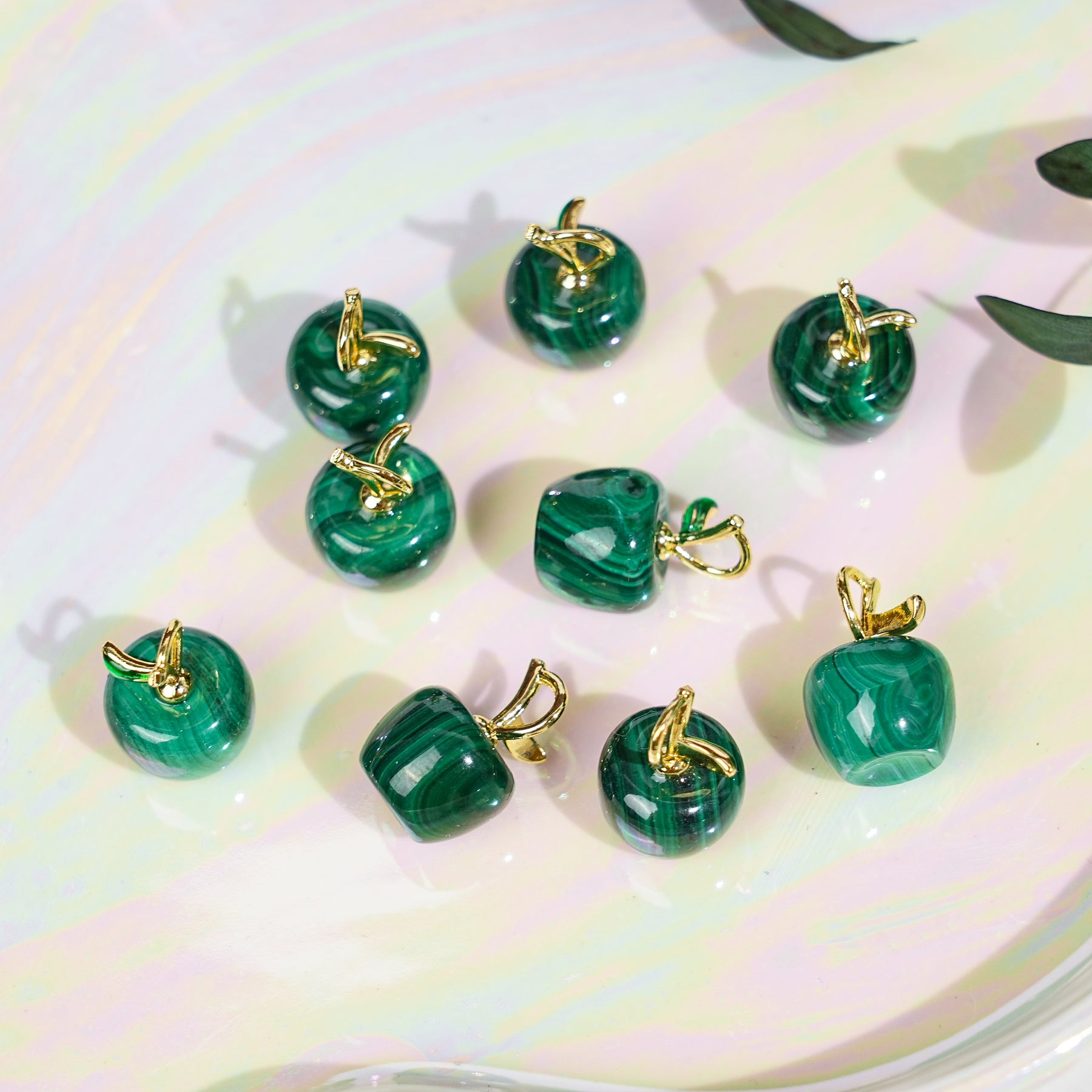 Crafted from vibrant natural Malachite, these apple ornaments showcase striking green banded patterns (like swirling forest foliage 🌿) paired with sleek gold accents—each tiny, polished apple is uniquely detailed, making it a charming gift for jewelry makers or decor lovers 🍎✨. They’re perfect for adding a pop of earthy elegance to necklaces, keychains, or holiday displays.