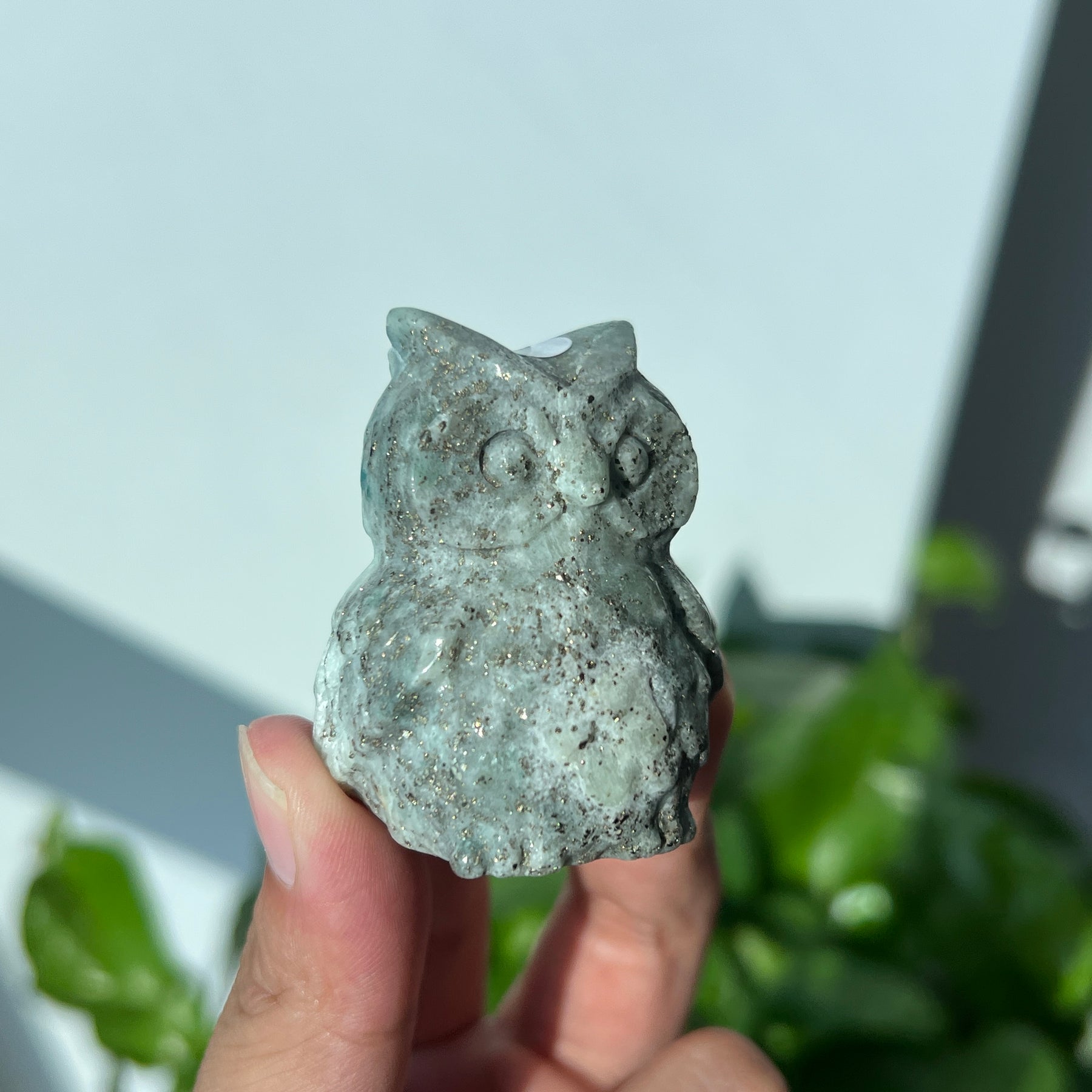 These are owl carvings from natural Green Sodalite with Pyrite 🦉. They have a muted green color with glittering pyrite flecks, and detailed features like round eyes and textured feathers, looking lifelike.
