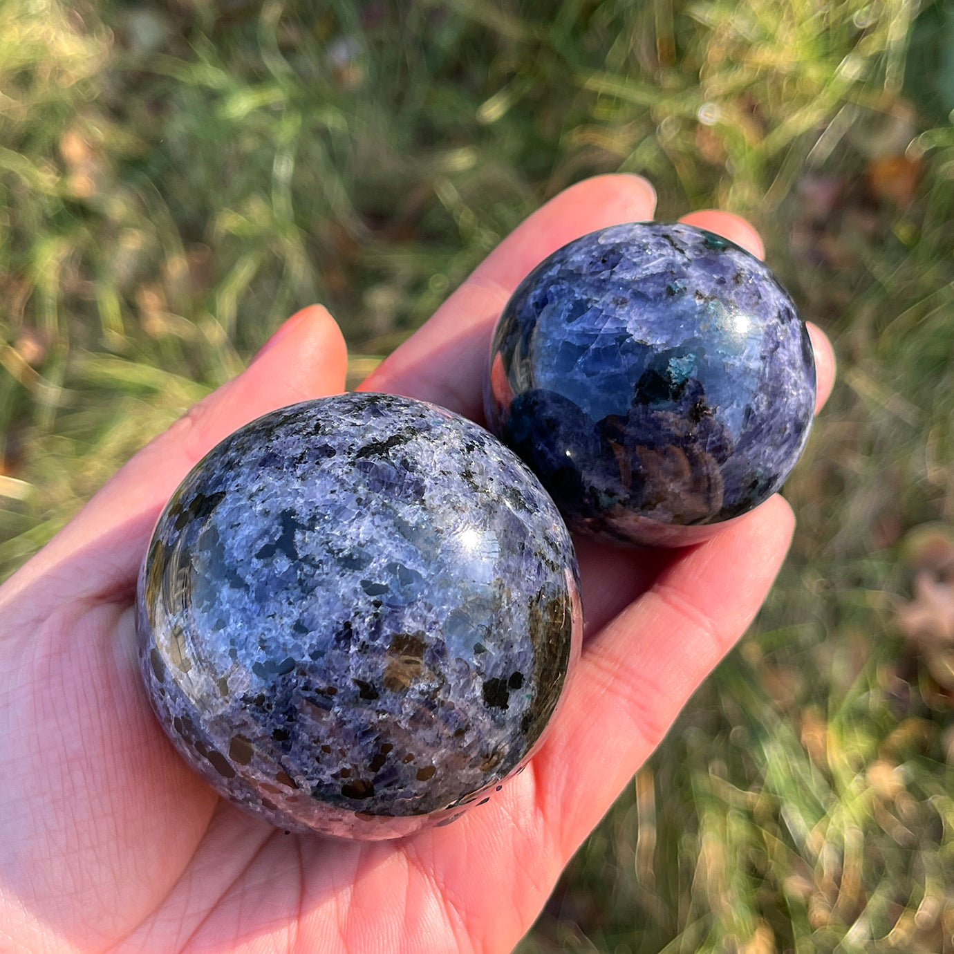 🌟Features:Inspired by celestial depth and earth’s hidden beauty: Iolite’s moody blue-lavender hues evoke the quiet mystery of the night sky , while the sphere shape symbolizes wholeness and flow. These are natural bi-color iolite smooth, luminous spheres—boasting a dramatic blend of deep royal blue, soft lavender, and subtle teal like a starry night sky swirled with twilight mist ✨!  The bi-color patterns swirled veins and patchwork hues high light iolite’s iconic "watercolor" texture—no two spheres share identical color blends, making every piece a one-of-a-kind cosmic treasure.