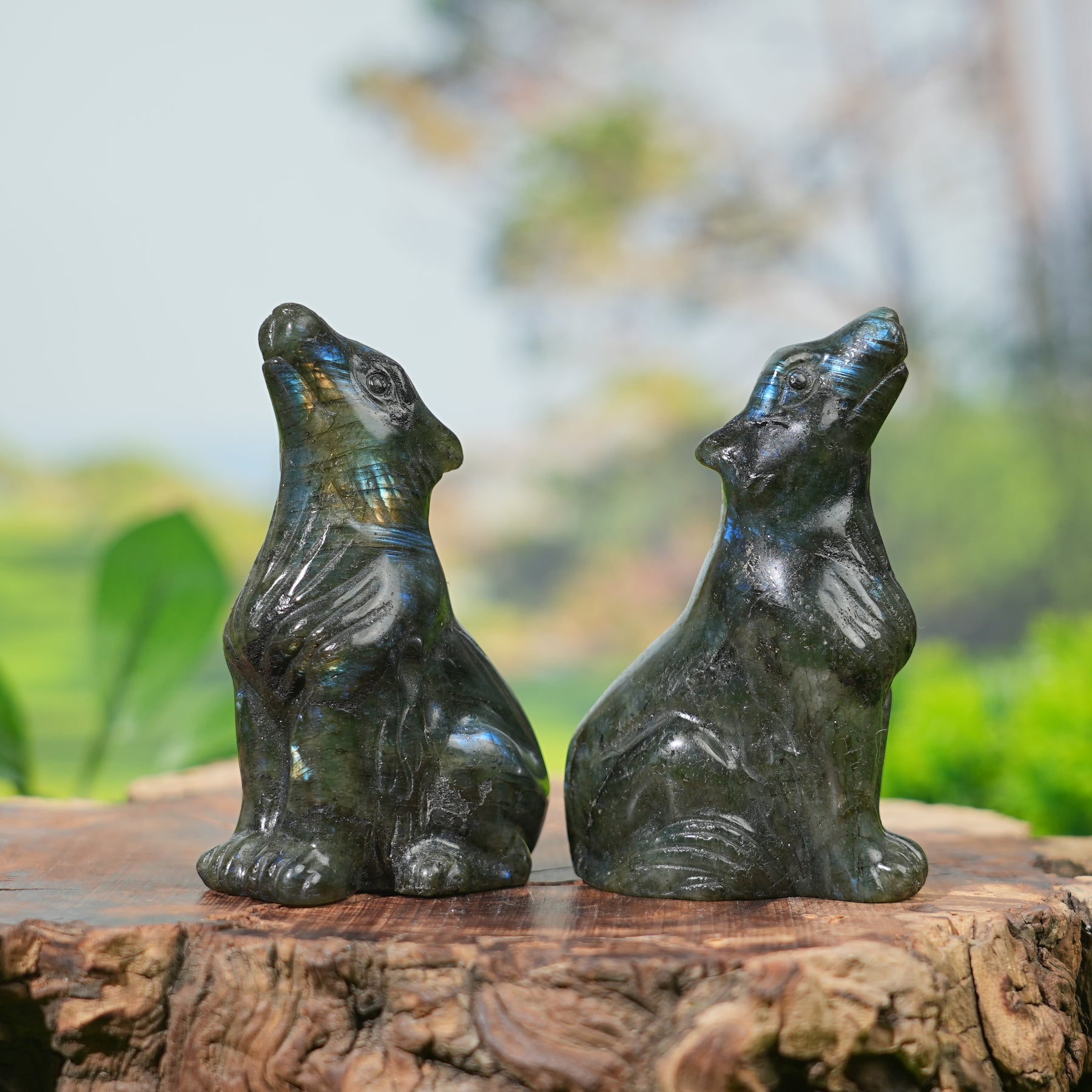 🌟Features:These are natural Labradorite carvings shaped like skyward-howling wolves—boasting the stone’s iconic moody gray-black base, paired with iridescent "flash" that shifts between shimmering blues, greens, and golds as light hits it ✨! Each wolf features vivid details: a tilted head, open howling mouth, and sleek, muscular body carved to feel tactile and lifelike in the palm.