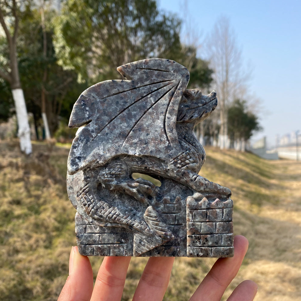 Unique Natural Crystal Carved Yooperlite Flying Dragon Castle