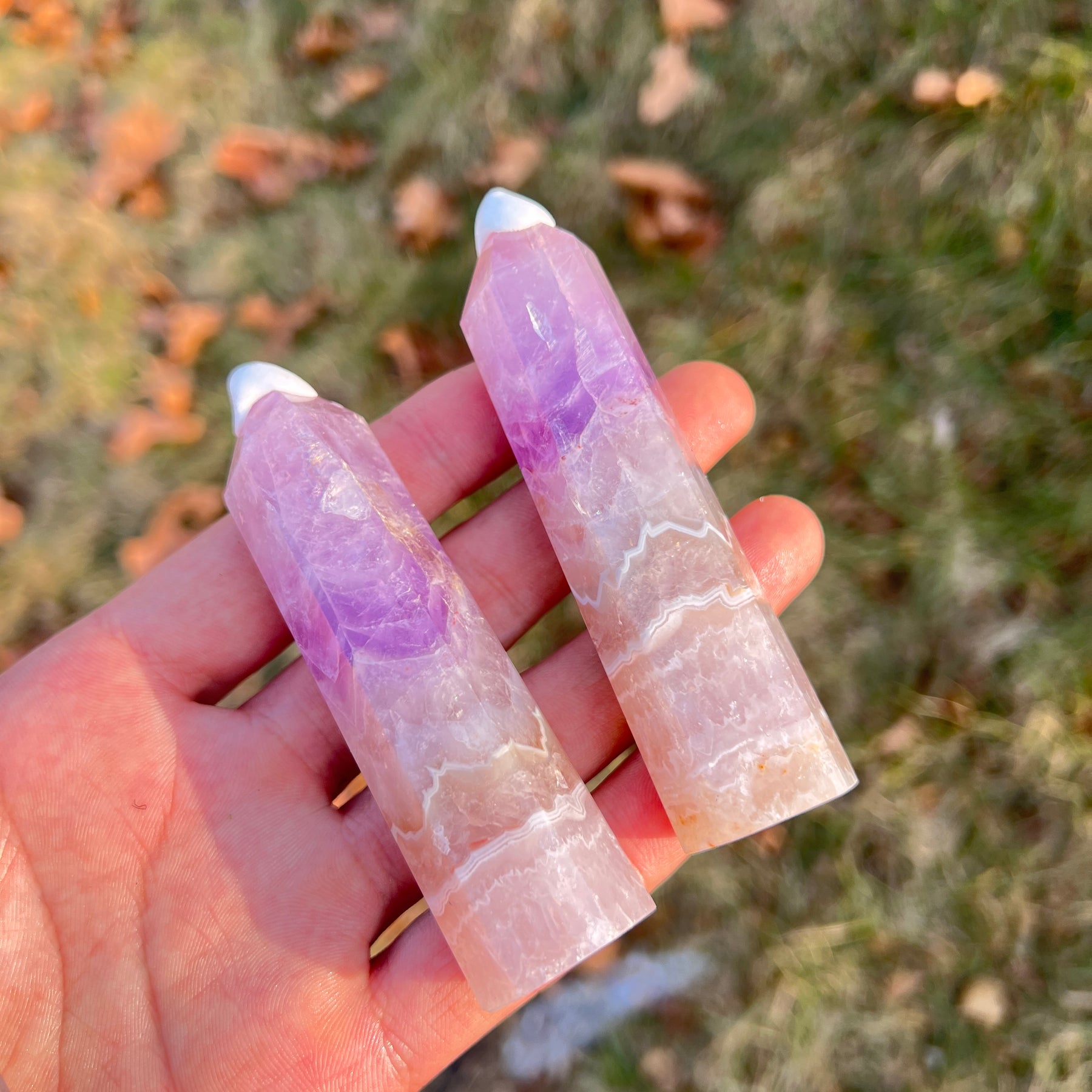 Crafted from amethyst and agate, these Amethyst Agate Points show a mesmerizing mix of purple amethyst and agate's intricate bands, like a nature - painted landscape 🌄💜. Each is unique, with amethyst's crystalline tip and agate's swirling layers below.