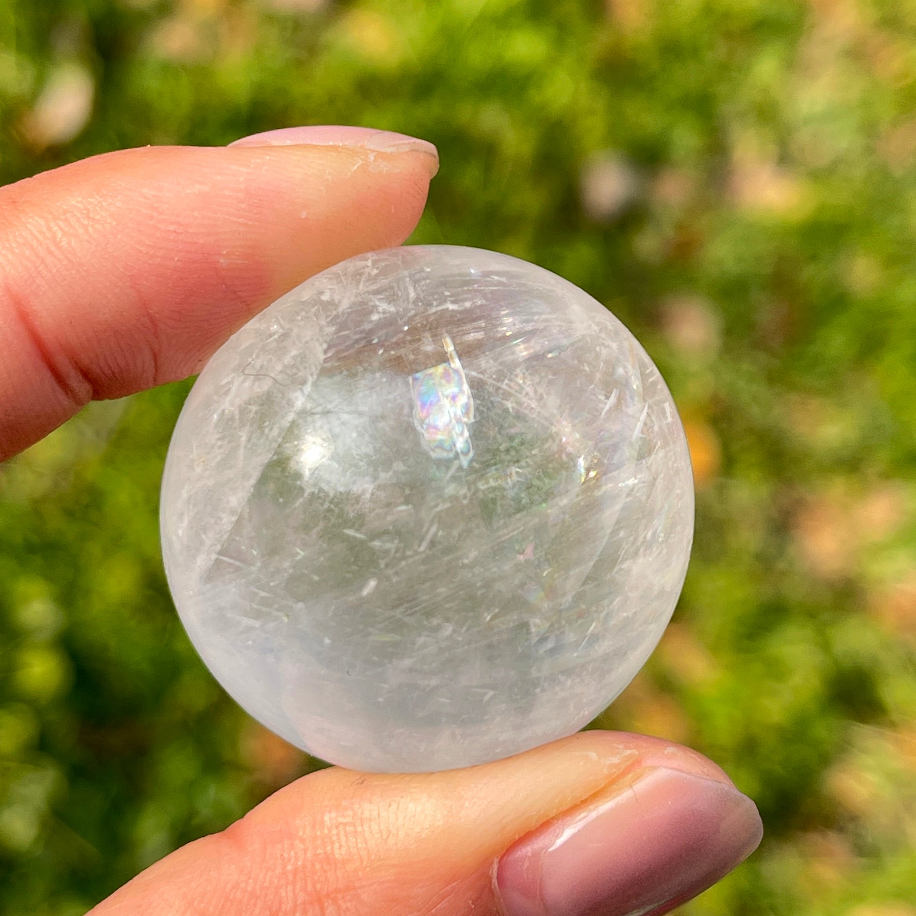 🌟Features:These luminous, ethereal pieces are crafted from natural Optical Calcite—a translucent, ice-like mineral with a clear, milky base that bends light to create delicate rainbow prisms, like sunlight filtering through frost ❄️. Each sphere features subtle, wavy striations and tiny iridescent flecks, making every piece unique. Shaped into perfectly smooth spheres that fit comfortably in the palm, they create a tangible symbol of clarity and light.Inspired by the sphere’s symbolism of wholeness, harmony, and energetic flow,this design blends amplifying energy with celestial beauty: the clear surface evokes the purity of a winter sky, while the rainbow prisms mirror the magic of finding clarity in life’s complexity.