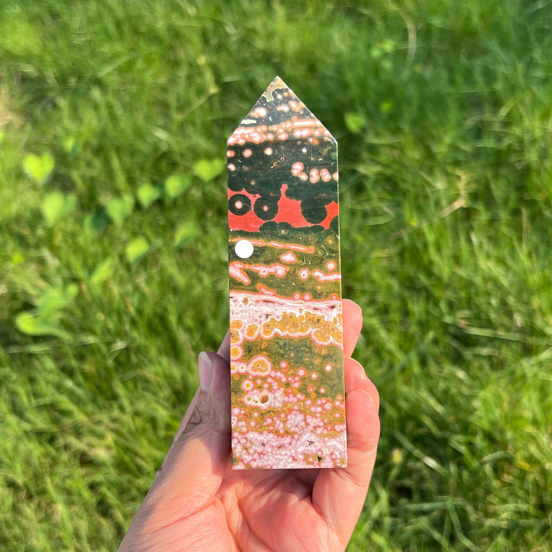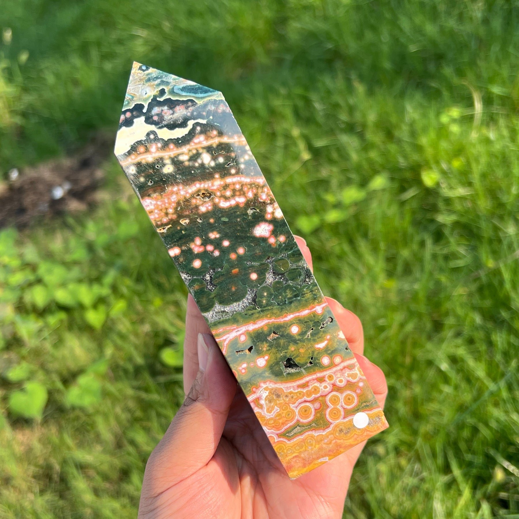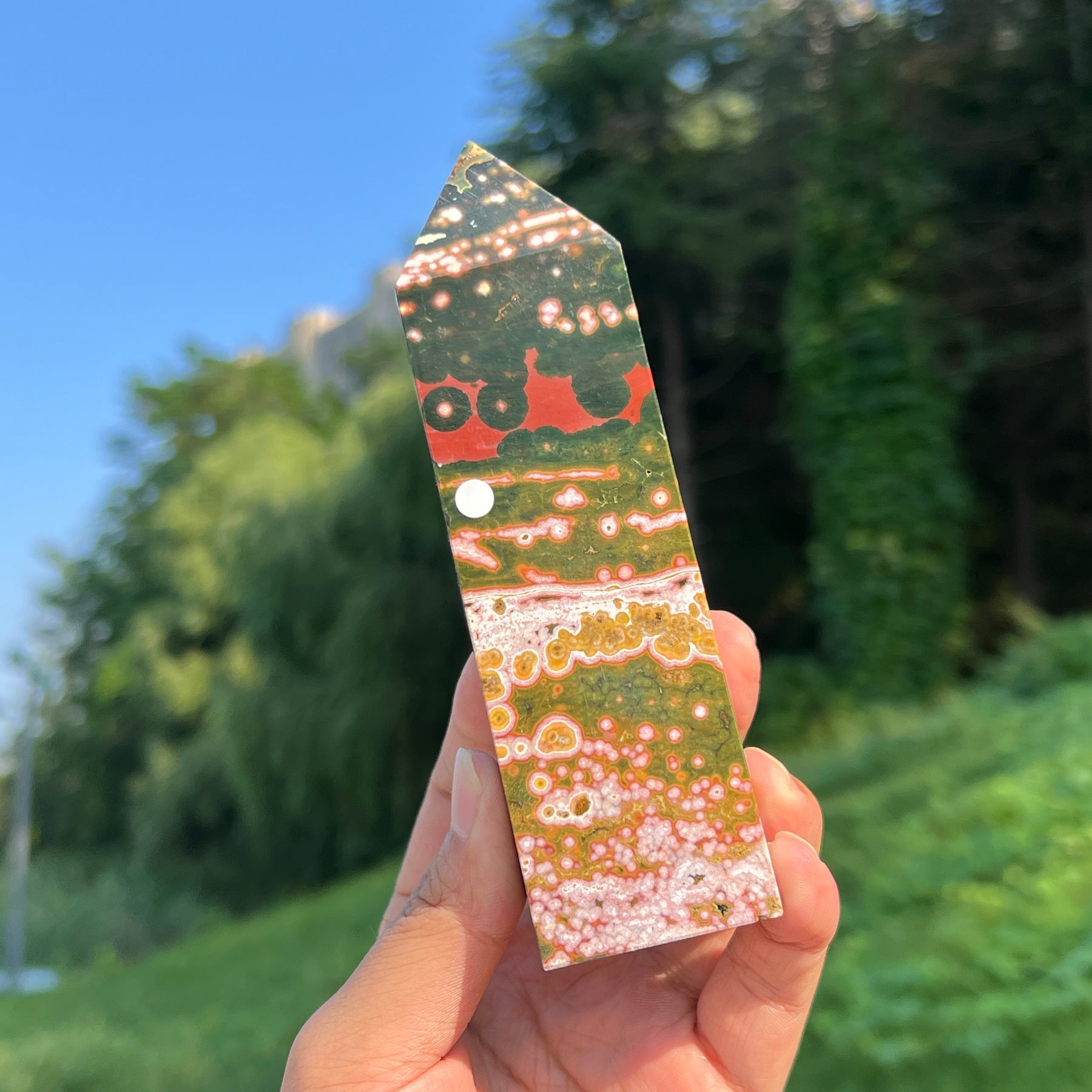 Features 🔮: Hand - carved from natural Ocean Jasper, this point showcases stunning swirls of green, pink, and earthy tones. The tall, sleek shape with a pointed top looks like a little tower of natural art, super eye - catching!
