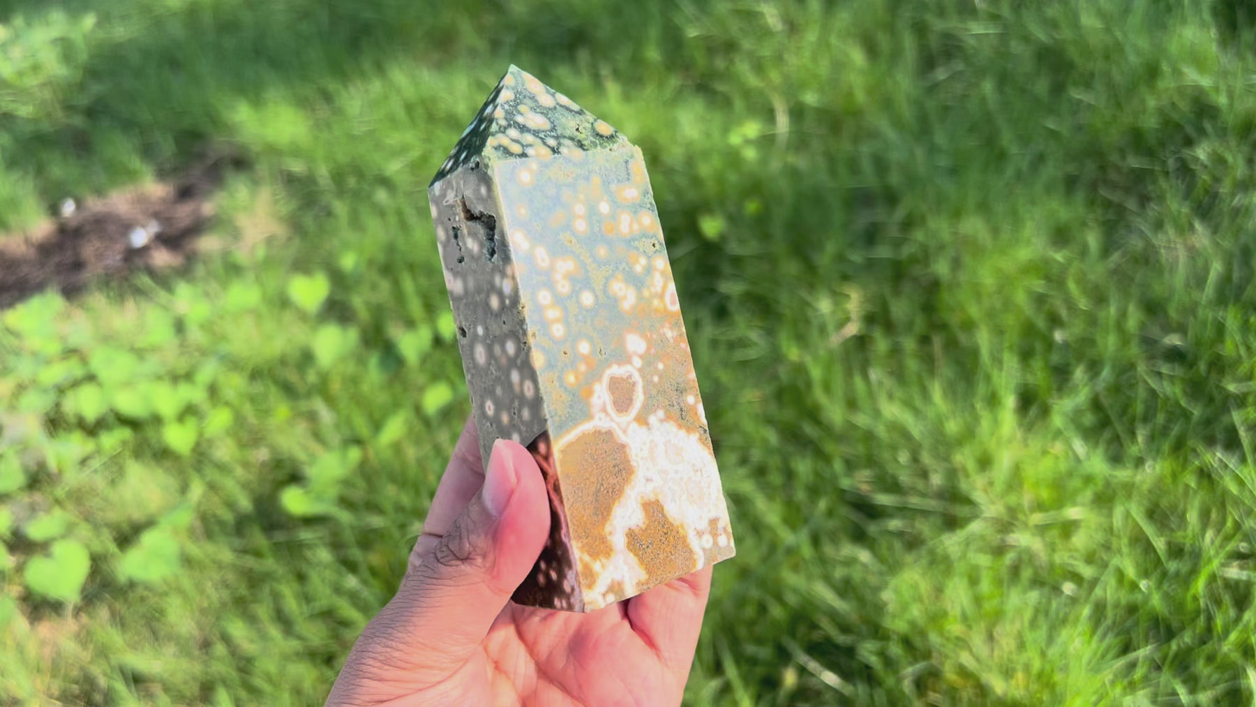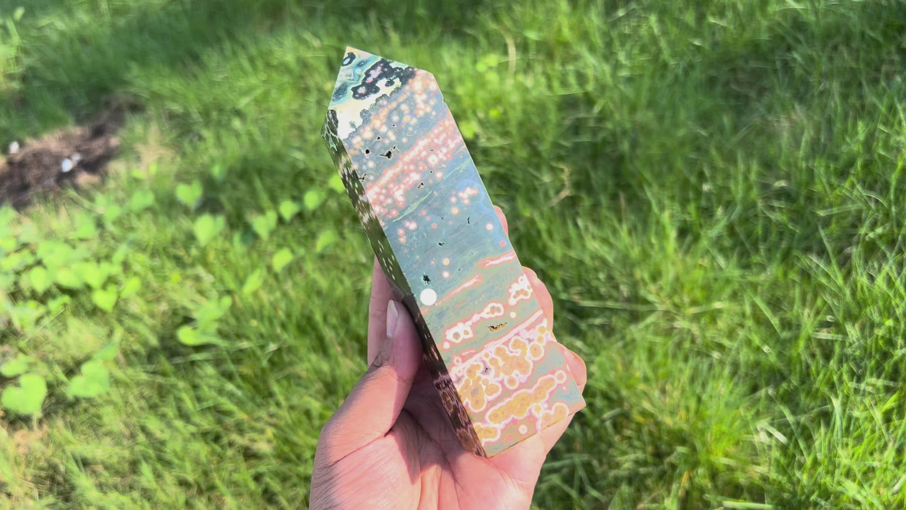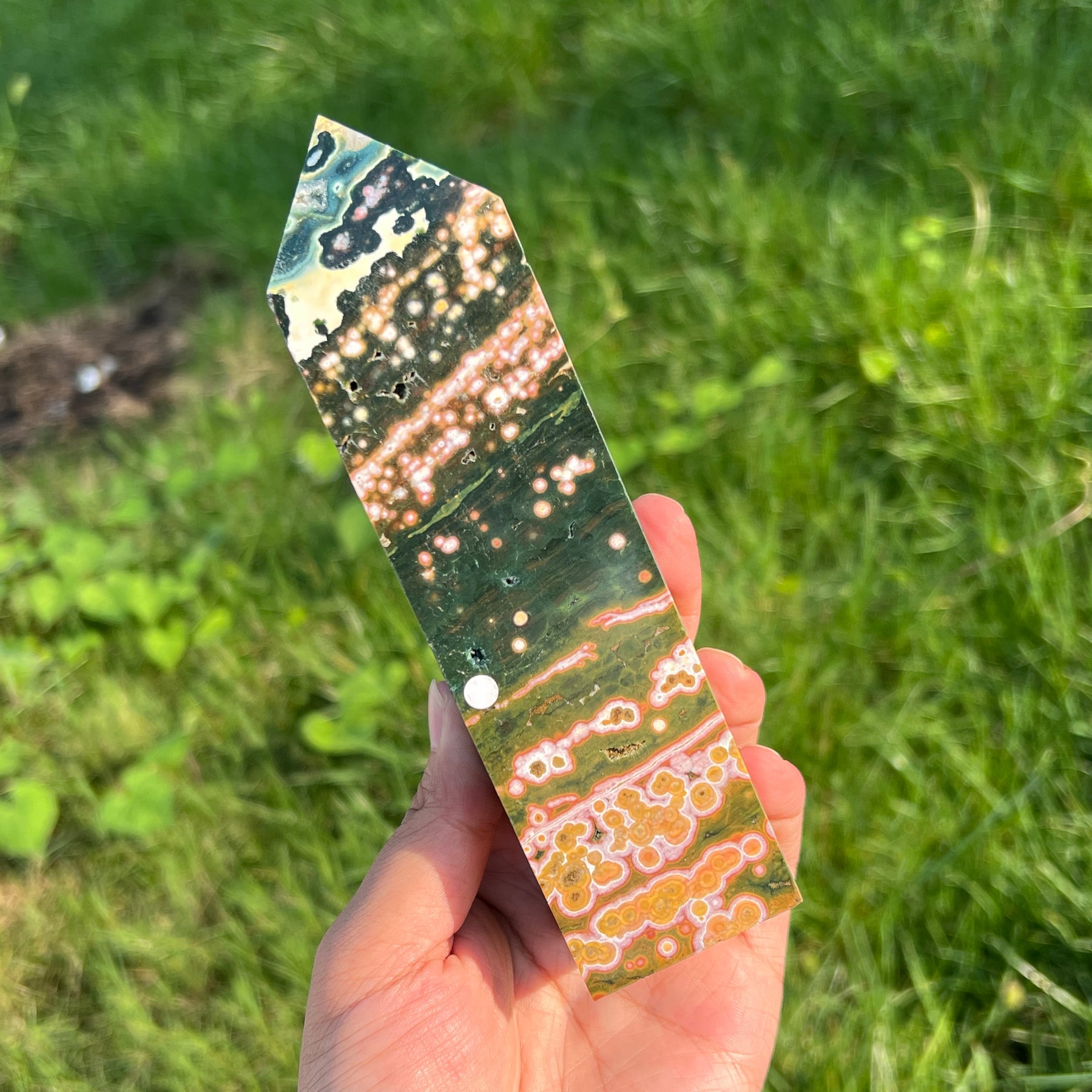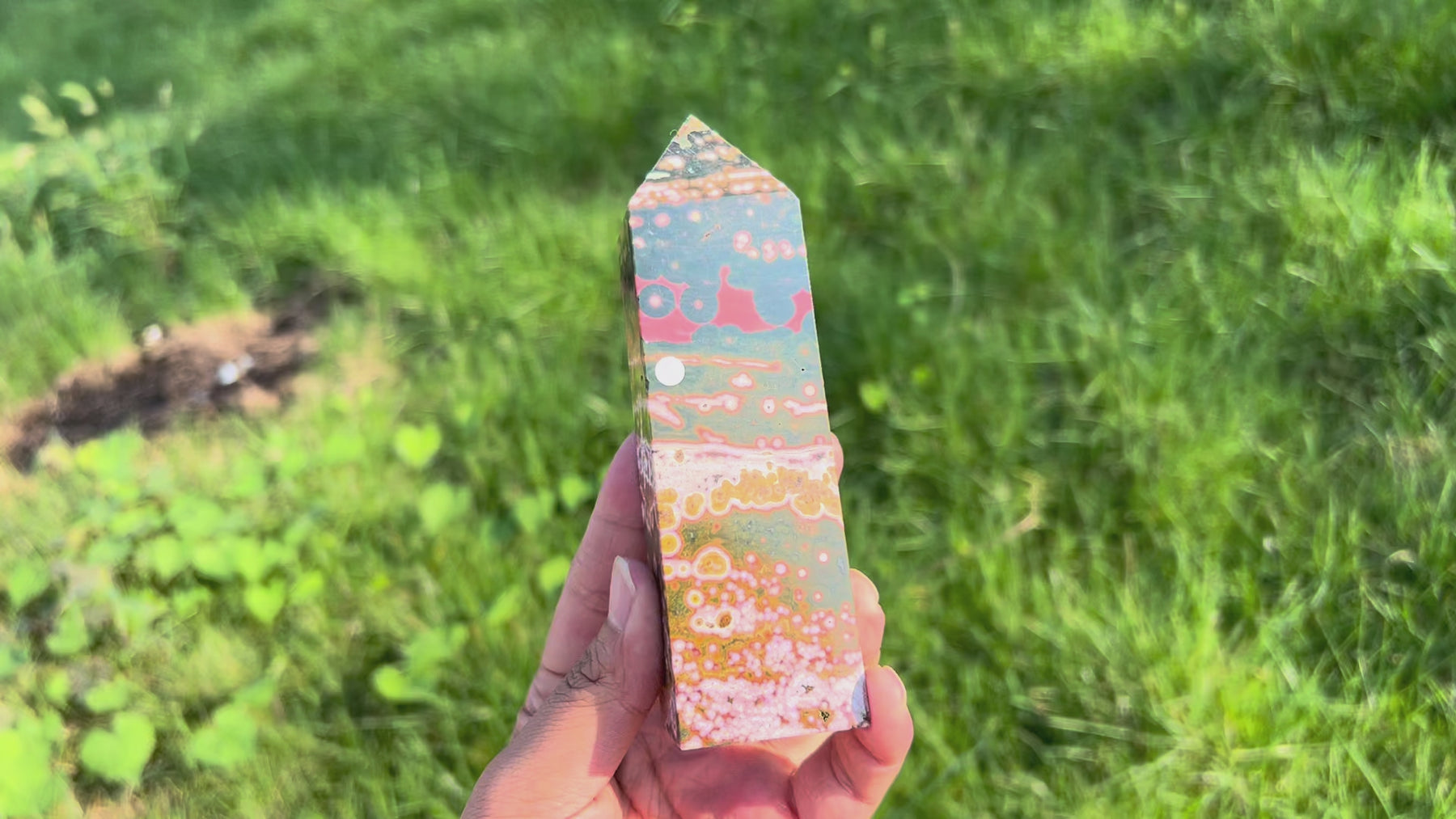 Features 🔮: Hand - carved from natural Ocean Jasper, this point showcases stunning swirls of green, pink, and earthy tones. The tall, sleek shape with a pointed top looks like a little tower of natural art, super eye - catching!