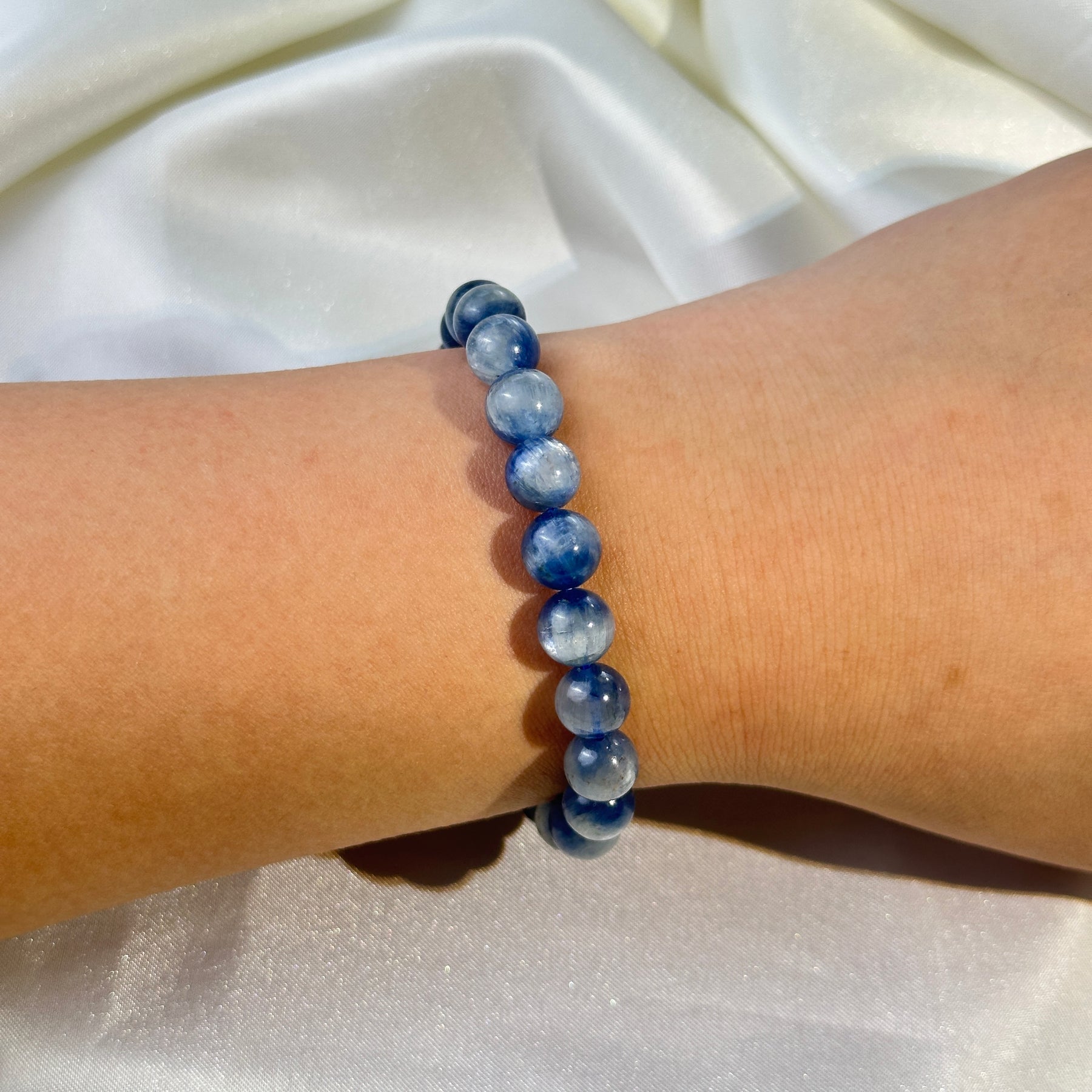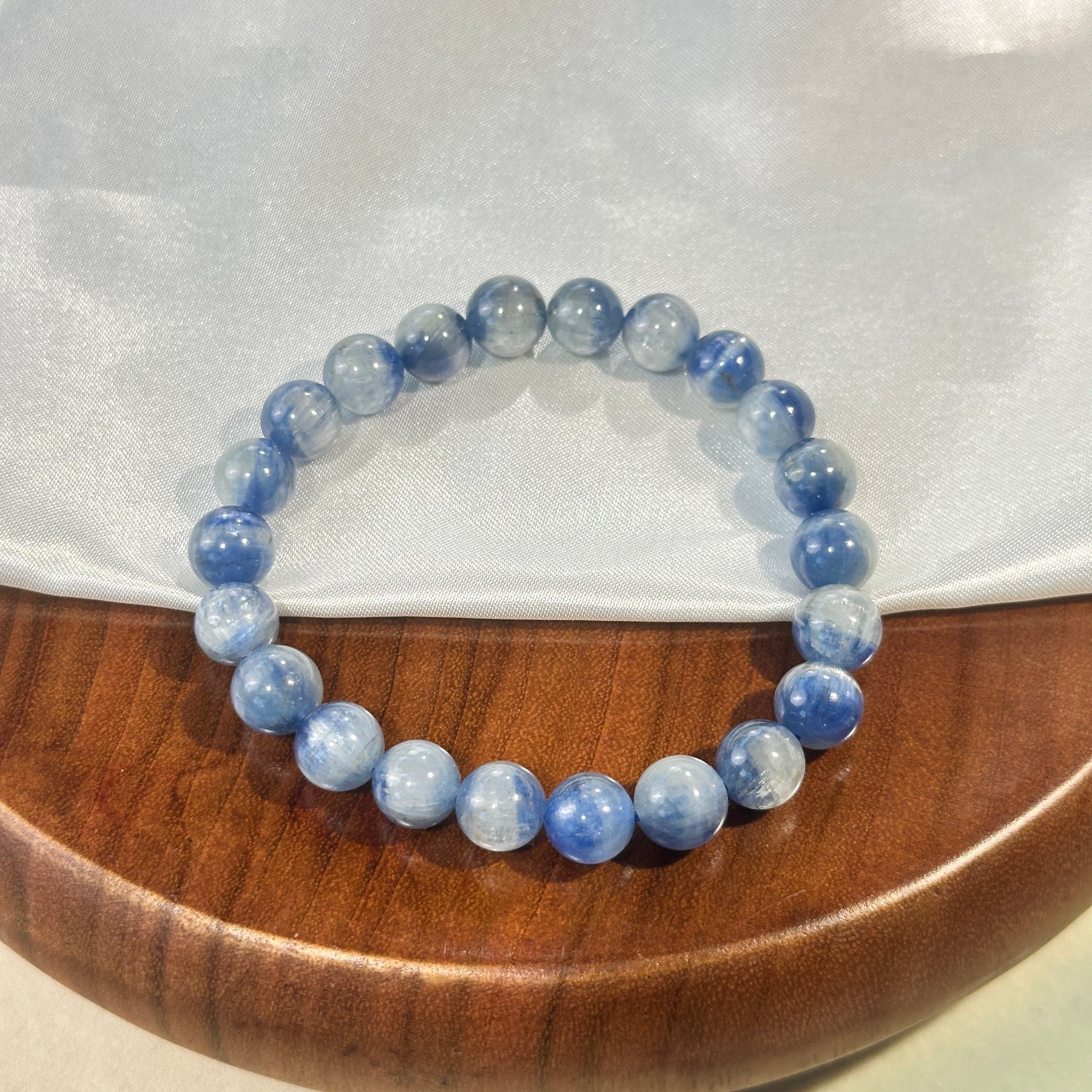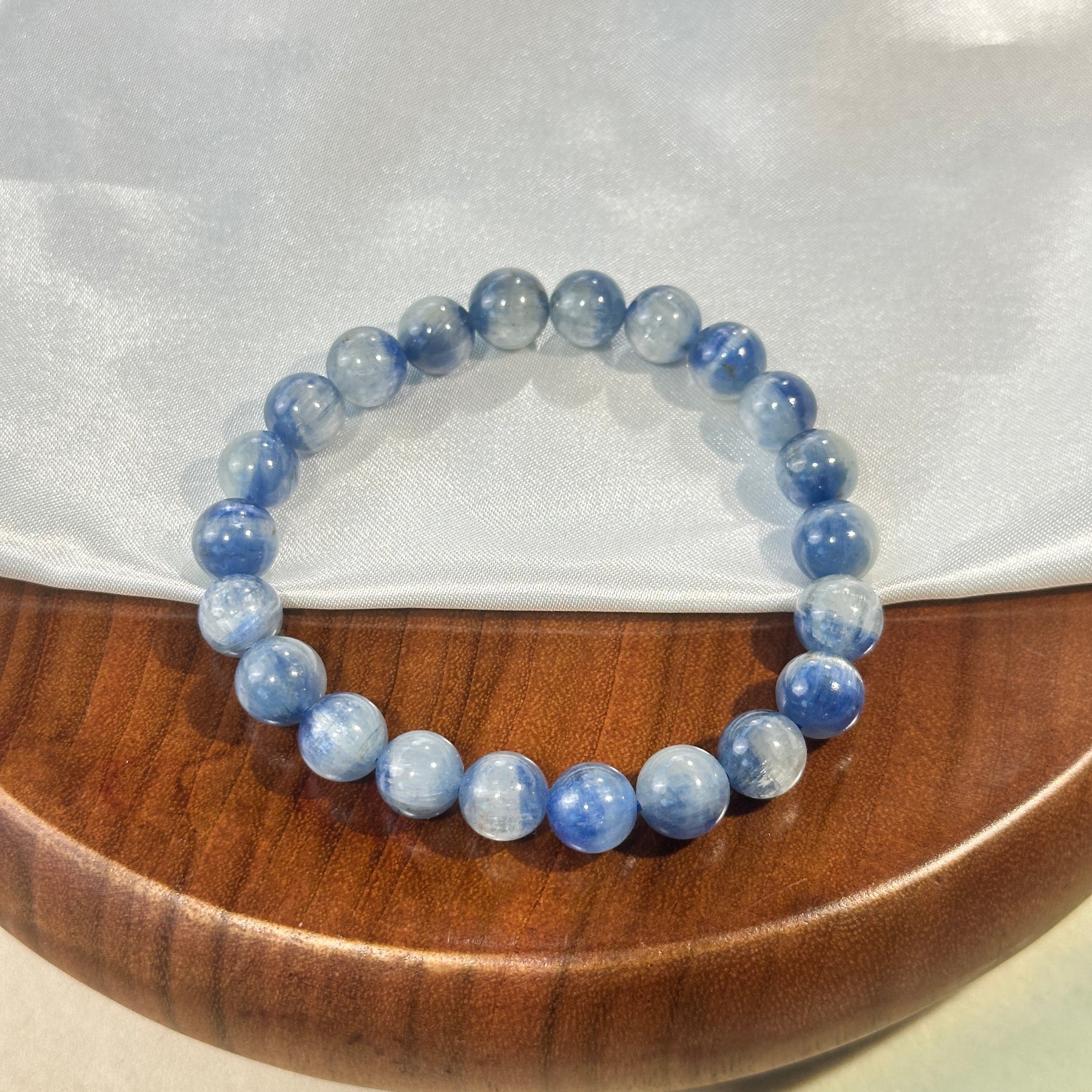 Crafted from natural blue kyanite, this 8.6mm bracelet features translucent sky-blue round beads with delicate white fibrous inclusions—each polished sphere holds unique linear textures, radiating a cool, clear and spiritually aligned charm 📿💙.