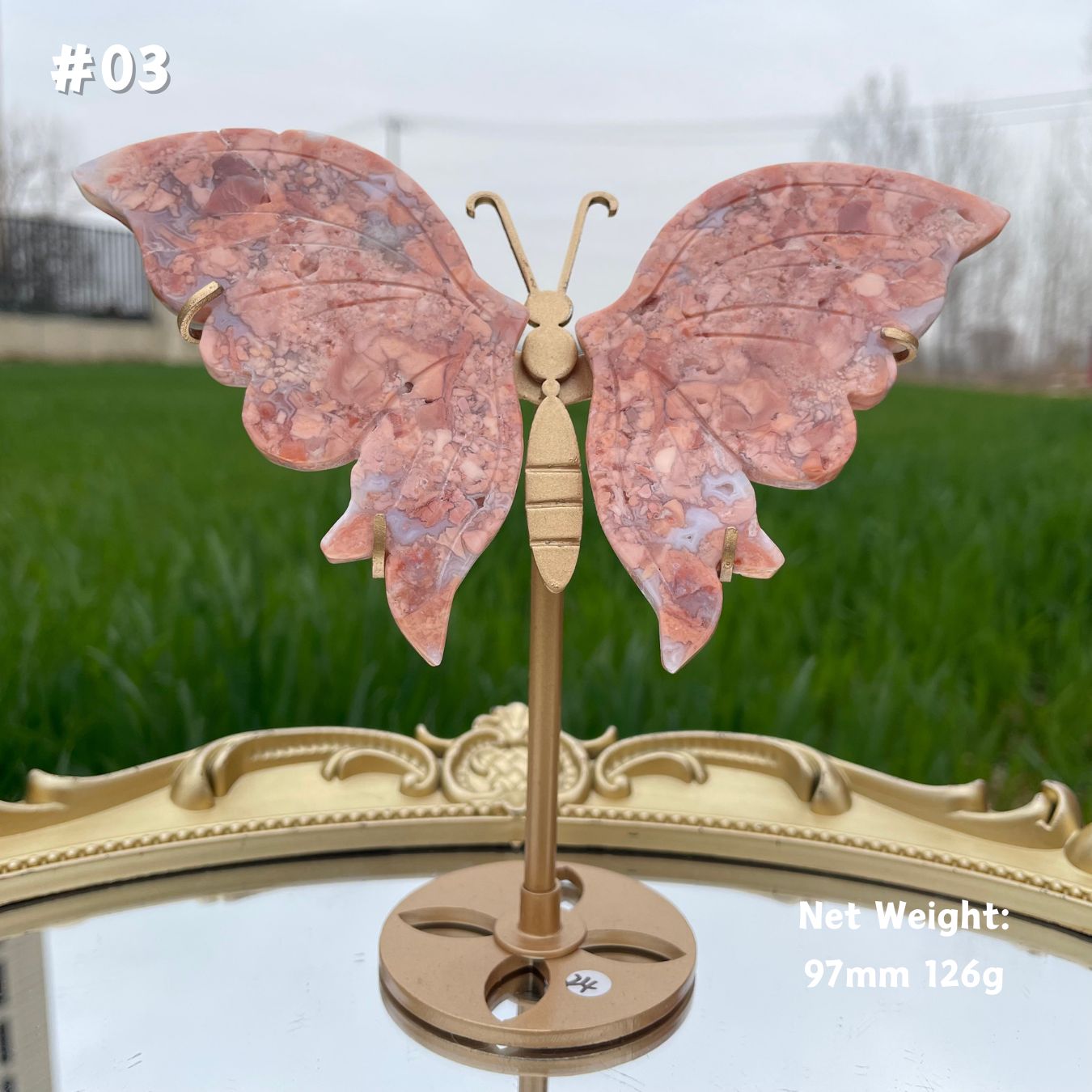 🌟Features:The design mirrors the delicate silhouette of a butterfly’s wings: scalloped, curved edges with gentle vein-like contours, and a flat, polished surface that catches light to highlight the stone’s natural translucency. Paired with a sleek golden metal stand, the wings are held in a graceful, open position—perfect for display on shelves, altars, or vanity tables.Inspired by Pink Agate’s reputation as a “stone of gentle love and stability” and the butterfly wings’ symbolic meaning of transformation, freedom, and lightness, this design celebrates the beauty of soft strength. It reminds us that growth doesn’t have to be loud—just as the butterfly emerges from its cocoon with quiet grace, and the agate’s warm hues wrap around the heart, we can evolve into our most authentic selves with patience and self-compassion.