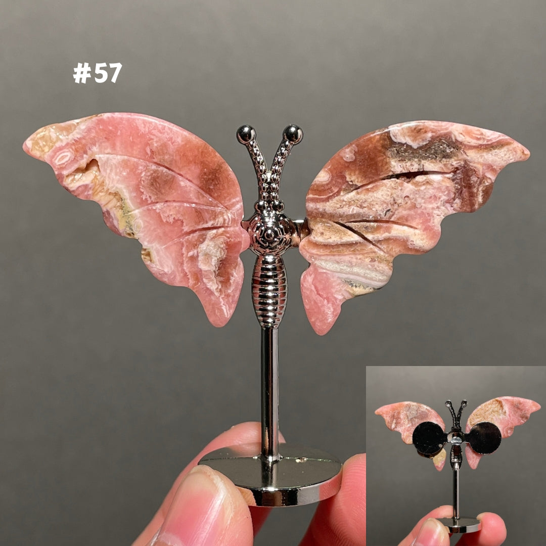The Butterfly wings are crafted from natural Rhodochrosite, with a metal framework supporting them. The wings are securely attached to the frame, and a small amount of adhesive may be visible at the base, which is a normal feature of the design.