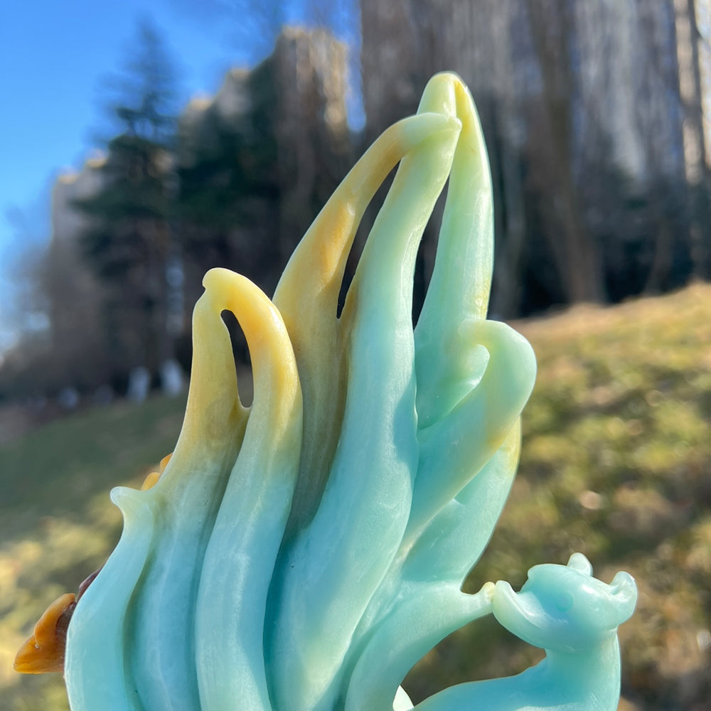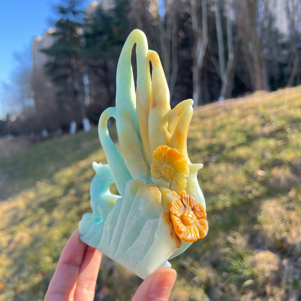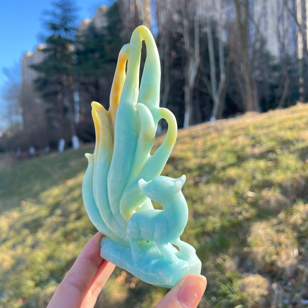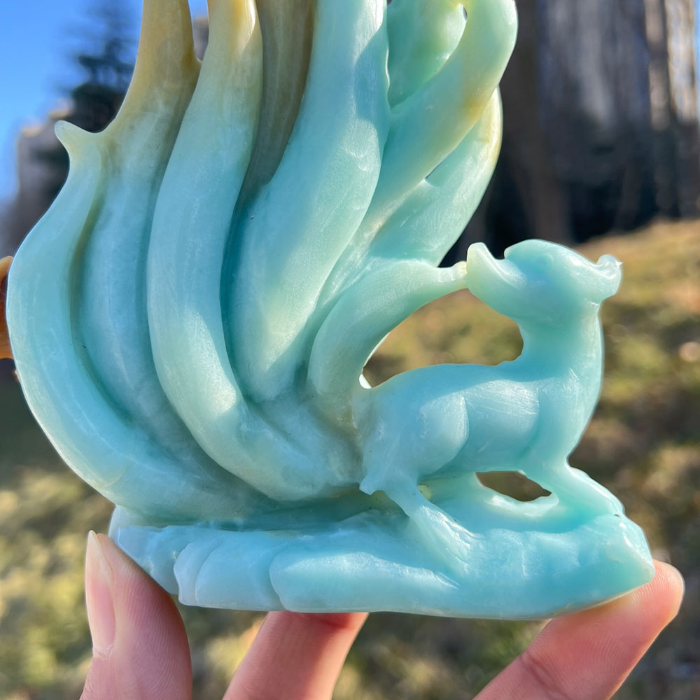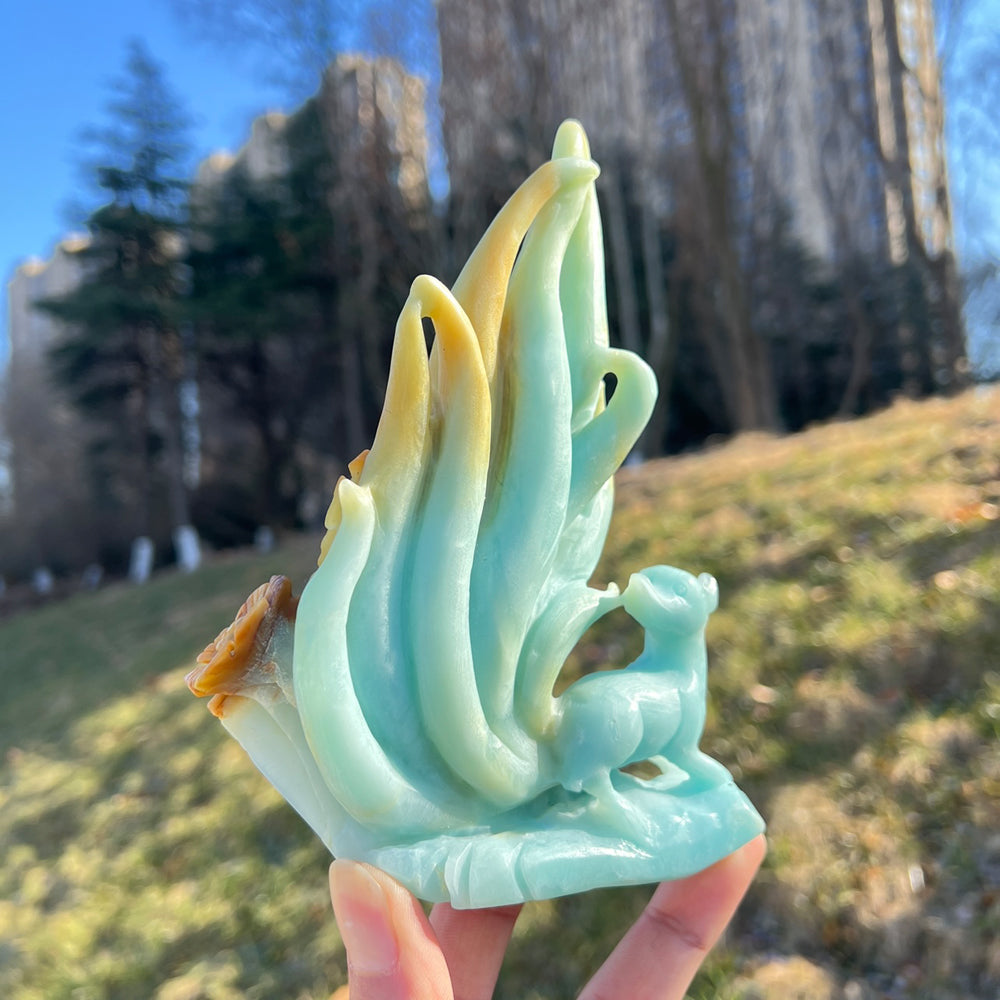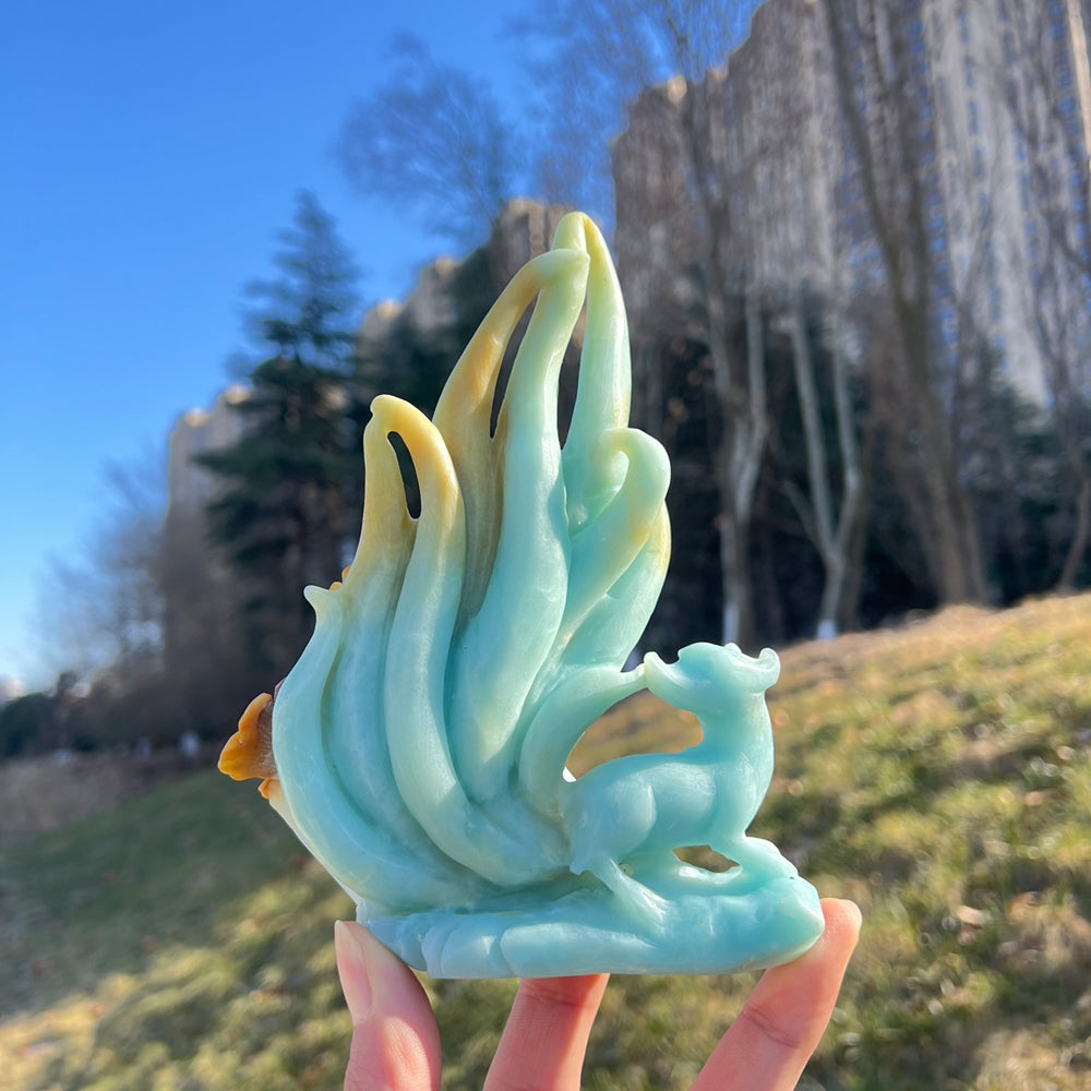 🌟Features:This crafted from natural Blue Quartzite—a mineral with a soft, milky turquoise hue and warm honey-yellow gradients, like a sunlit coastal lagoon captured in stone 🌊. It depicts a nine-tailed fox in a dynamic, flowing pose, with layered tails that rise dramatically behind it, paired with a delicate, seated fox companion and intricate floral details. The stone’s smooth, gentle texture and gradient hues create a sense of ethereal grace, as if holding a tiny fragment of mythic serenity.This design blends mystical charm with intentional warmth: the flowing tails evoke the beauty of embracing change, while the turquoise-yellow gradient mirrors the balance of peaceful calm and vibrant vitality.