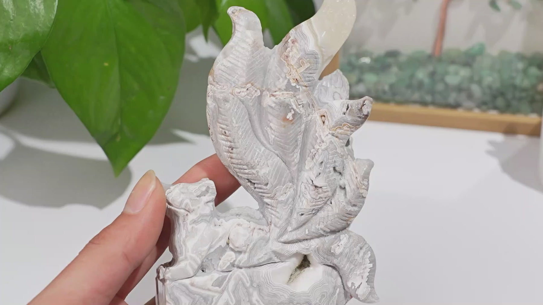 🌟Features:This crafted from natural Mexican Agate—a mineral with delicate, swirling white, gray, and soft terracotta bands, like a misty landscape captured in stone 🌫️. It depicts a nine-tailed fox in a poised, seated position, with flowing, layered tails that rise dramatically behind it, set atop a smooth, patterned base. The stone’s unique banding is highlighted by intricate cutouts and textured details, creating a sense of depth and movement, as if holding a tiny fragment of mythic grace.Inspired by the nine-tailed fox’s symbolism of wisdom, transformation, and spiritual insight,this design blends cultural charm with intentional depth: the fox’s flowing tails evoke the beauty of embracing change, while the agate’s banded patterns mirror the harmony of opposing forces.