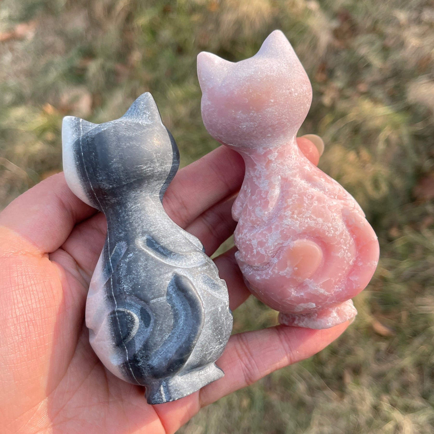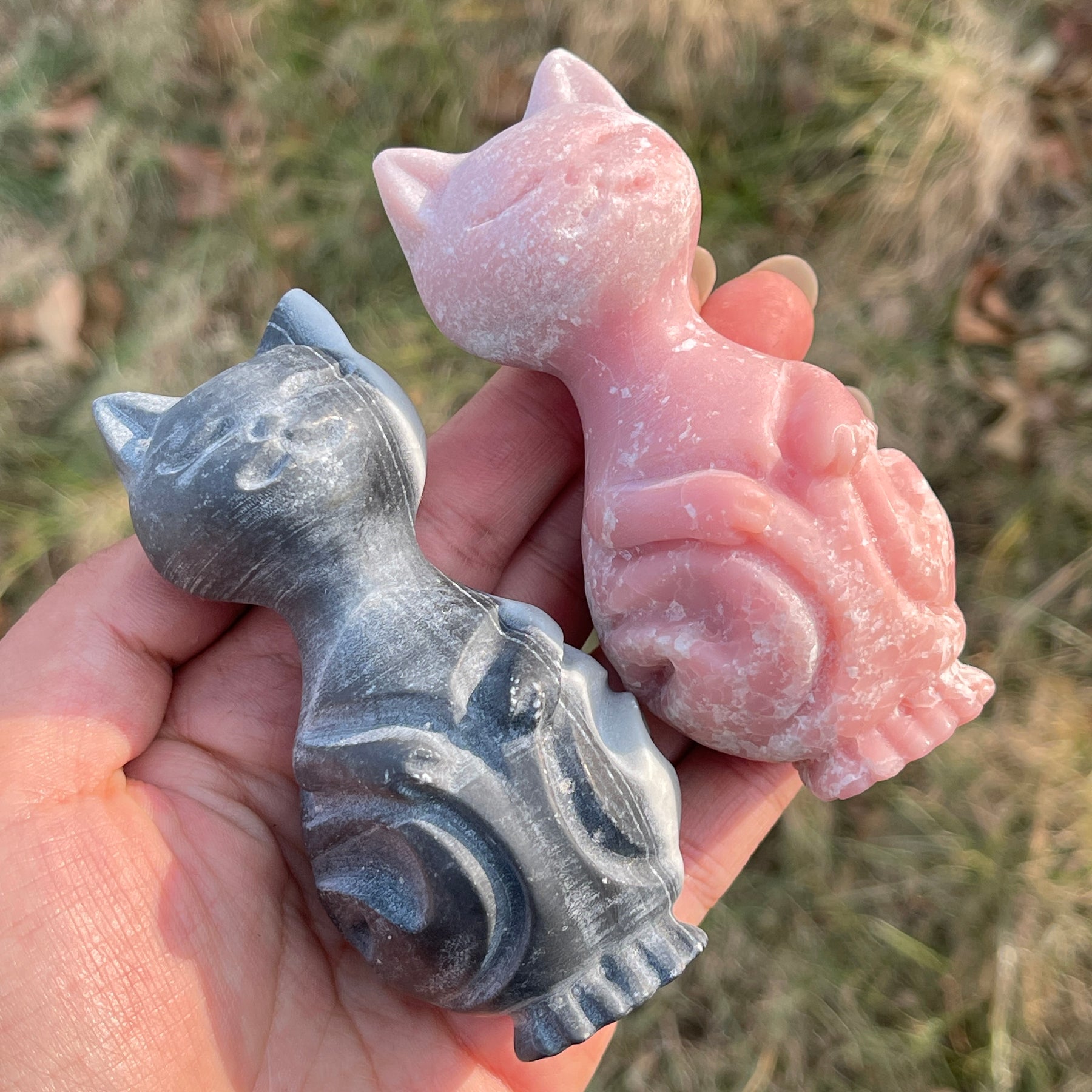 🌟Features:These charming pieces are crafted from natural crystal, shaped into a playful, upright cat with perked ears, a rounded body, and a curled, detailed tail that fits perfectly in the palm. Each cat showcases unique natural hues and textures—from soft, matte pink to deep, smooth black—creating a collection of tiny, expressive feline companions.Inspired by the cat’s symbolism of independence, intuition, and gentle warmth, this design leans into the beauty of quiet confidence and cozy comfort: the cat’s upright posture evokes the peace of being present in the moment, while its varied hues mirror the richness of embracing both your playful and grounded sides. No two carvings are identical, making your piece a one-of-a-kind accent for desks, shelves, or any nook that needs a dose of gentle, joyful energy.