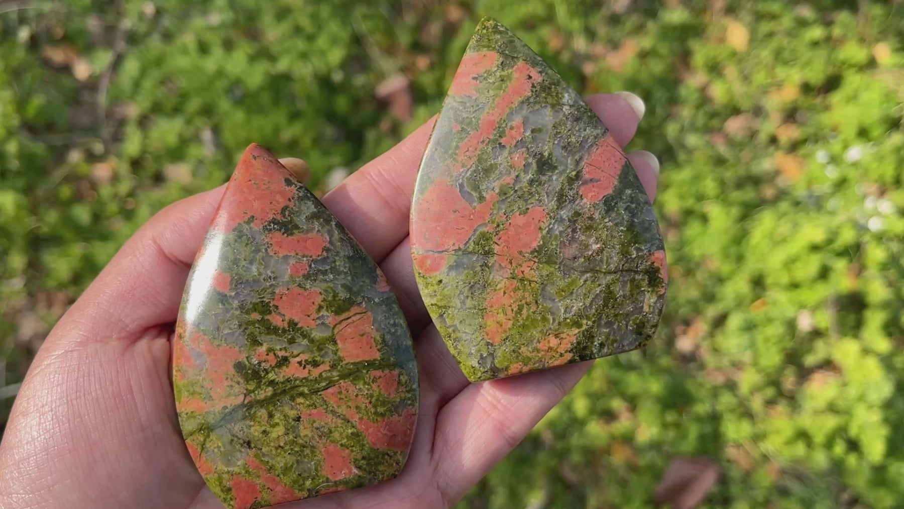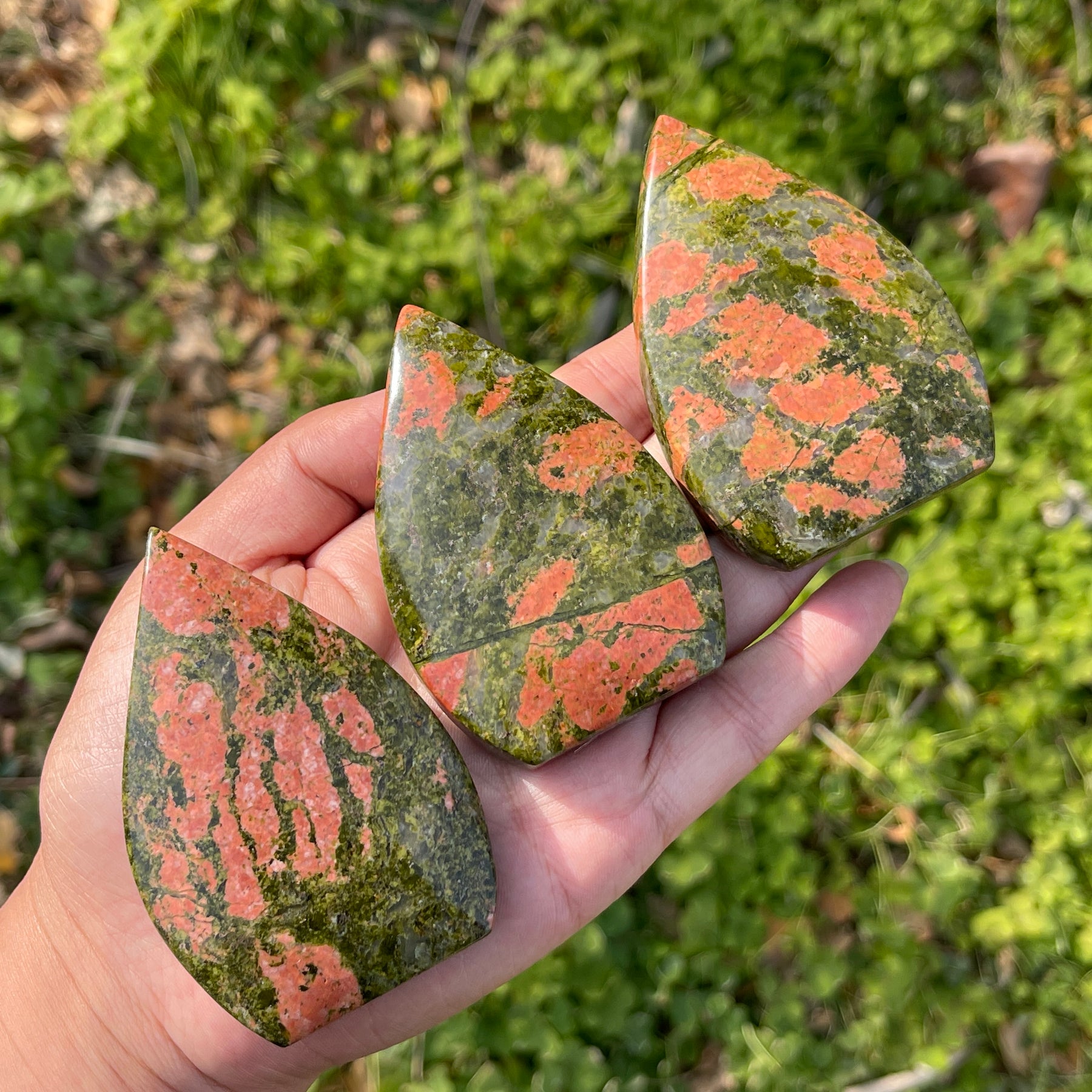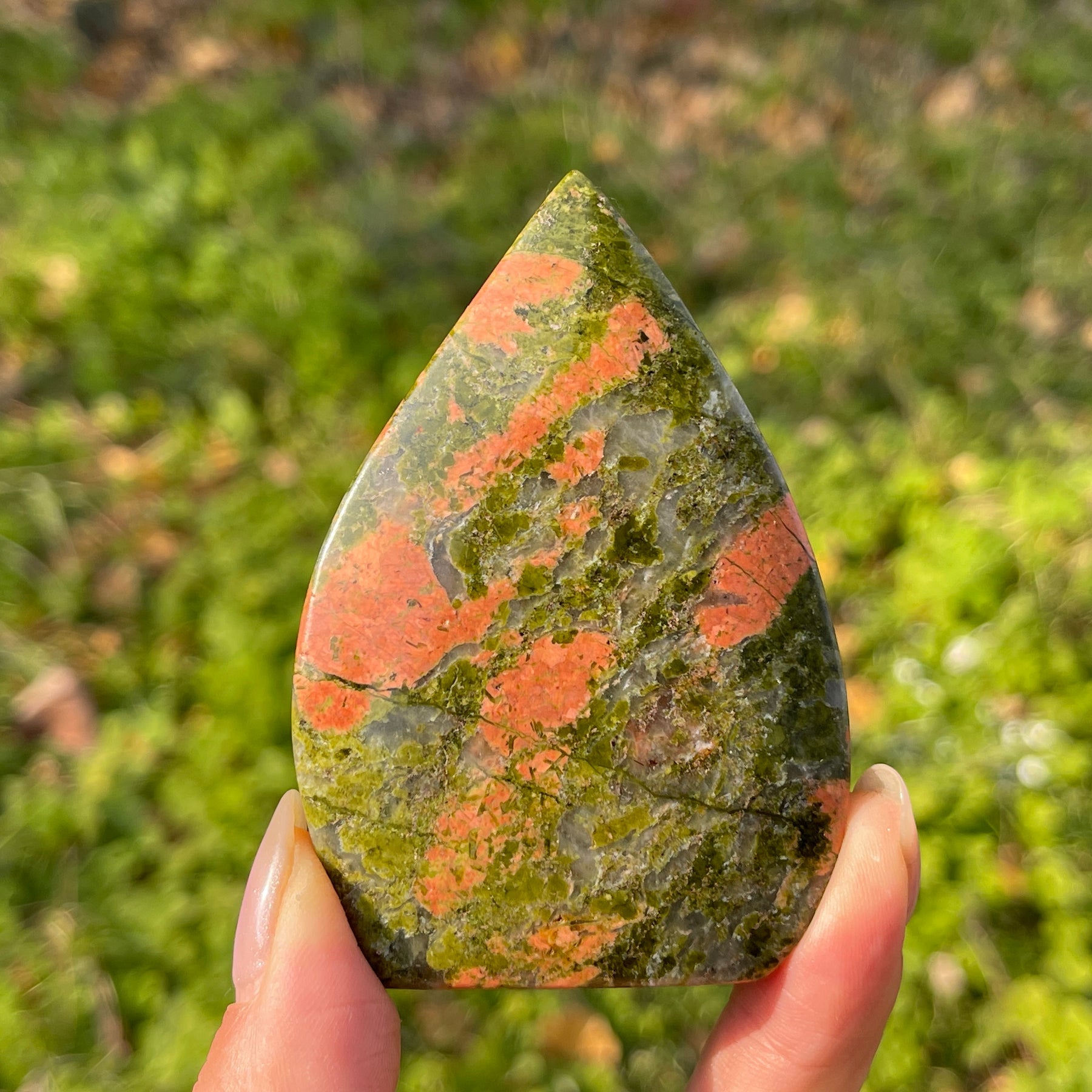 🌟Features:These striking pieces are crafted from natural Unakite—a mineral with a rich mossy green base, flecked with vibrant salmon-pink inclusions that resemble sun-warmed wildflowers, like a blooming meadow captured in stone 🌸. They are shaped into smooth, teardrop forms with a pointed tip and rounded base, creating a tactile, portable piece that fits perfectly in the palm.This design blends earthy warmth with intentional energy: the teardrop’s flowing shape evokes the release of what no longer serves you, while the unakite’s hues mirror the harmony of nature’s healing and life-giving force.