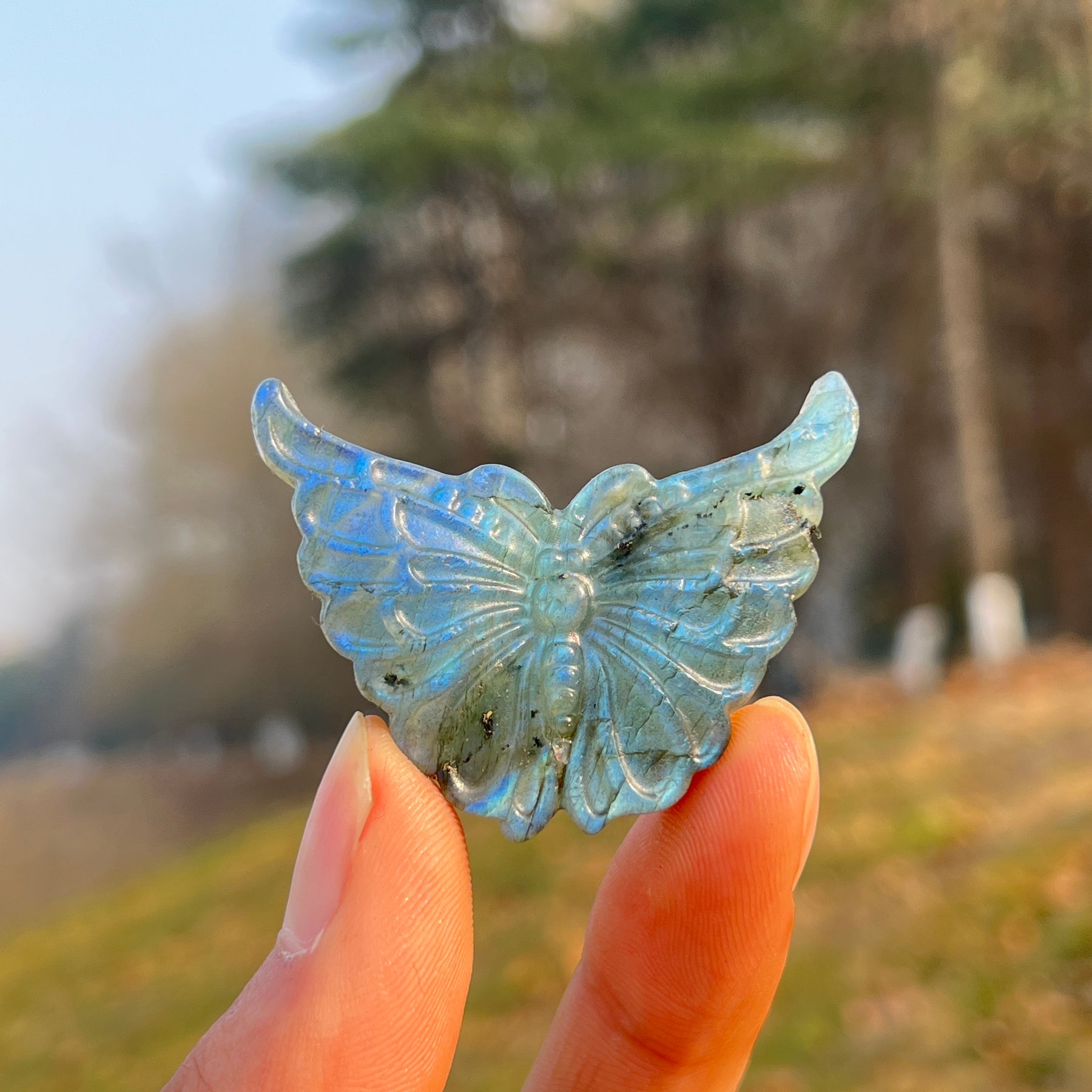 🌟Features:These crafted from natural Labradorite—a mineral with a deep, smoky base and a vivid iridescent sheen that shifts from electric blue to golden green, like a fragment of a twilight sky captured in stone 🌌. They are shaped into delicate butterflies with intricately detailed wings and a compact body, creating a lightweight, tactile charm that fits perfectly in the palm.This design blends ethereal beauty with intentional energy: the butterfly’s detailed wings evoke the grace of embracing change, while the labradorite’s iridescence mirrors the magic of nurturing your inner intuition.