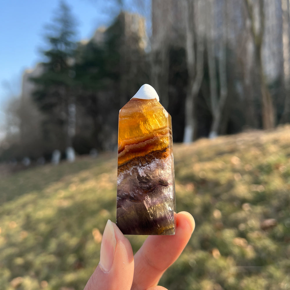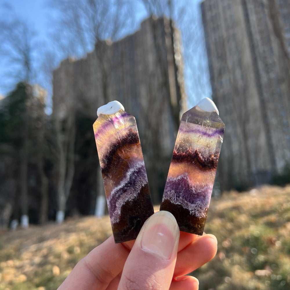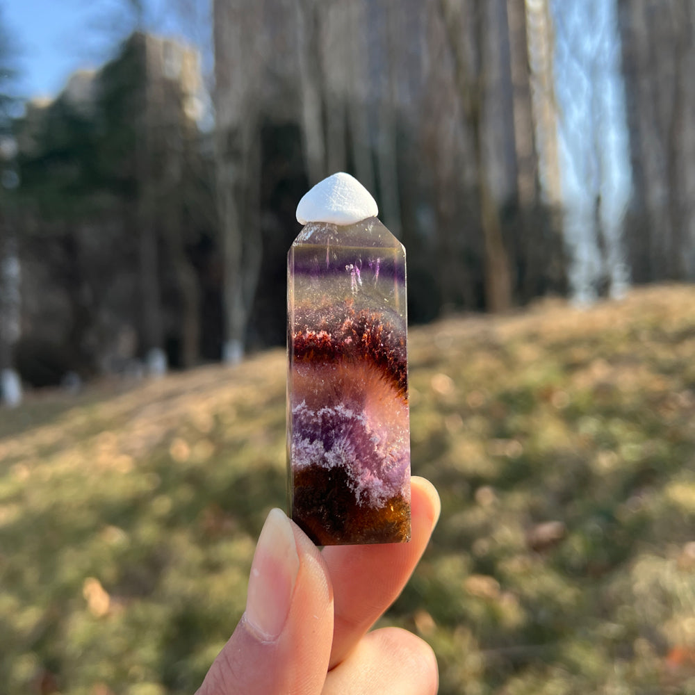 🌟Features:This crafted from natural Fluorite infused with Pyrite and Hematite inclusions—like a twilight canyon swirled with deep purple, warm amber, and rich rust-red, dotted with tiny metallic flecks 🌄. Shaped into a sleek, faceted point,each one carries the stone’s signature "layered glow" charm: light catches its translucent bands and sparkling inclusions to create a dynamic, shimmering effect, as if holding a tiny fragment of balanced earth and sky.Inspired by the point’s symbolism of "directed clarity"paired with the unique properties of the three minerals,this design blends mystical depth with intentional purpose: the pointed tip evokes channeling focused energy, while the Fluorite’s purple hues, Pyrite’s sparkles, and Hematite’s rich tones mirror the harmony of mental sharpness, energetic resilience, and emotional stability.