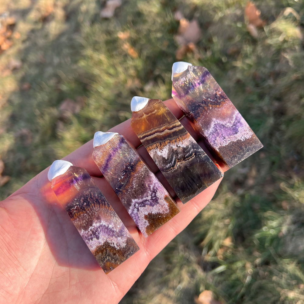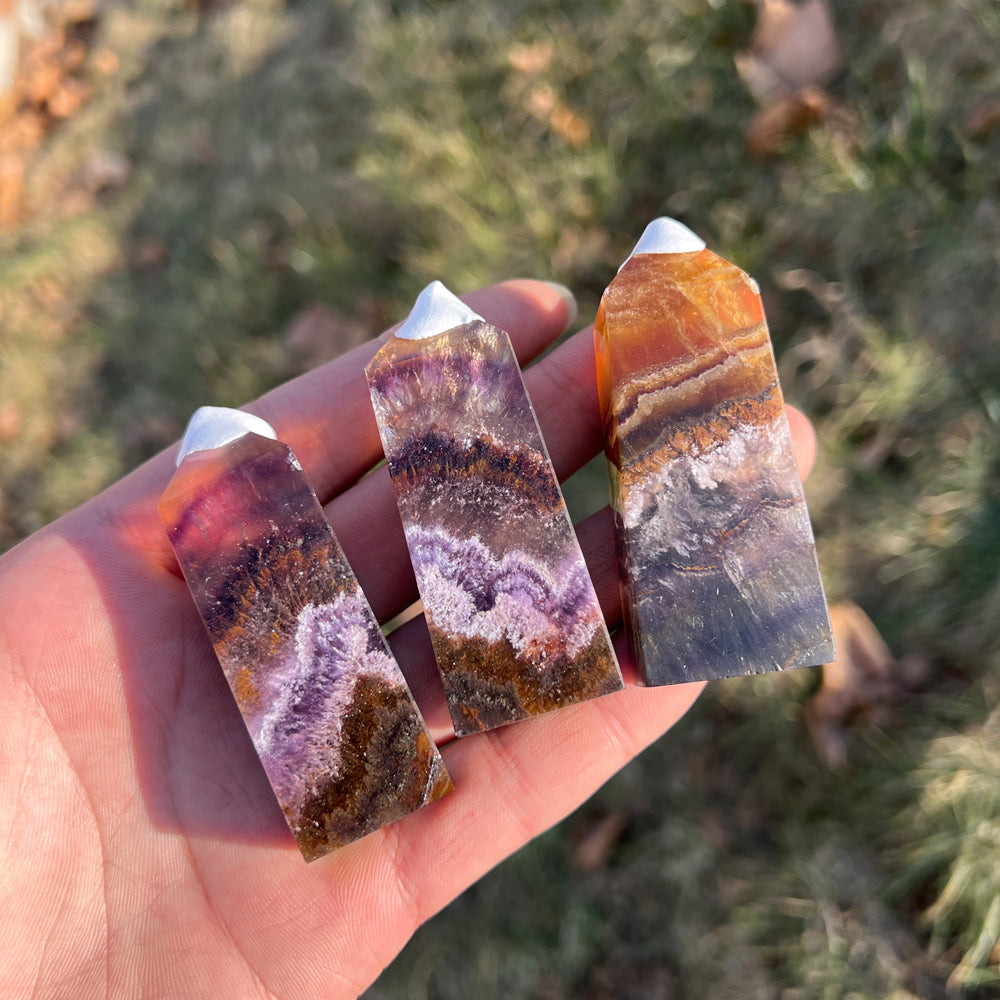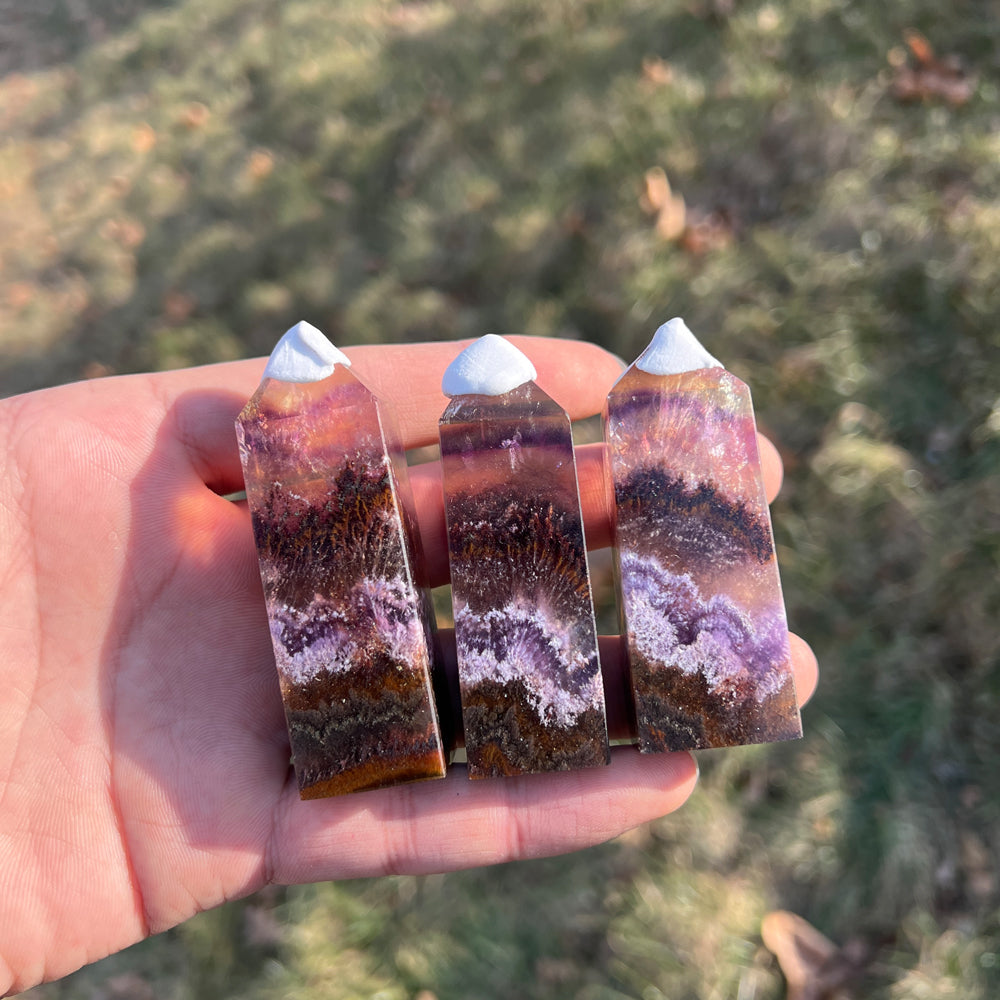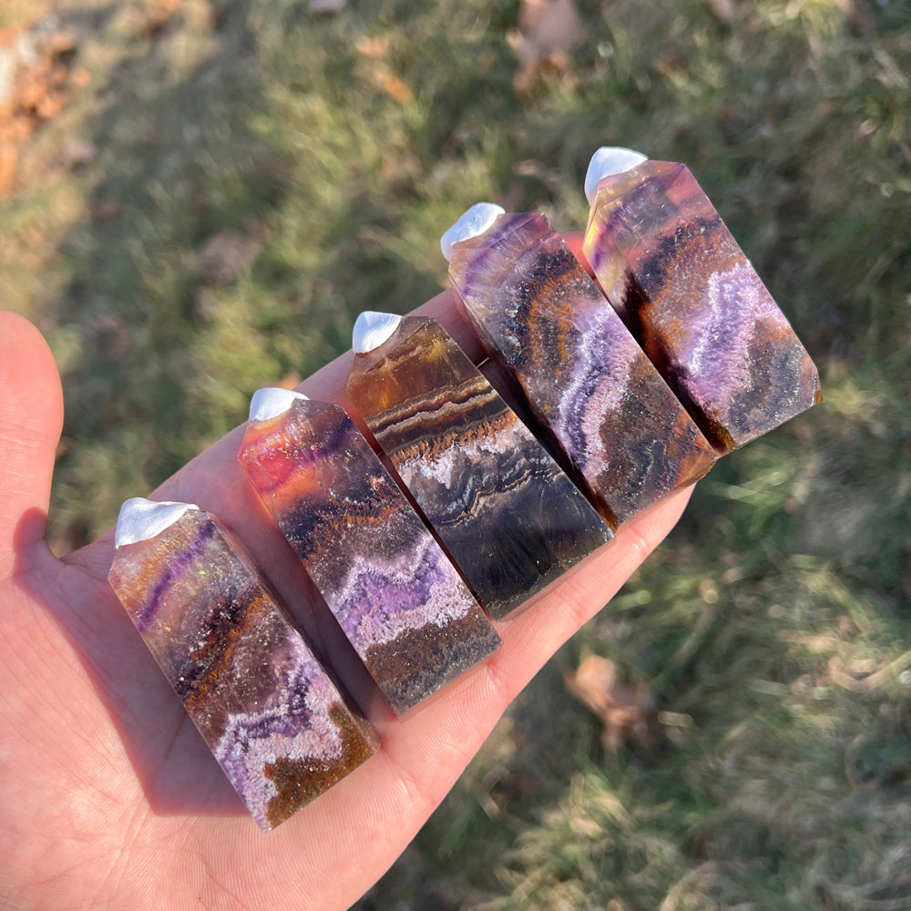🌟Features:This crafted from natural Fluorite infused with Pyrite and Hematite inclusions—like a twilight canyon swirled with deep purple, warm amber, and rich rust-red, dotted with tiny metallic flecks 🌄. Shaped into a sleek, faceted point,each one carries the stone’s signature "layered glow" charm: light catches its translucent bands and sparkling inclusions to create a dynamic, shimmering effect, as if holding a tiny fragment of balanced earth and sky.Inspired by the point’s symbolism of "directed clarity"paired with the unique properties of the three minerals,this design blends mystical depth with intentional purpose: the pointed tip evokes channeling focused energy, while the Fluorite’s purple hues, Pyrite’s sparkles, and Hematite’s rich tones mirror the harmony of mental sharpness, energetic resilience, and emotional stability.