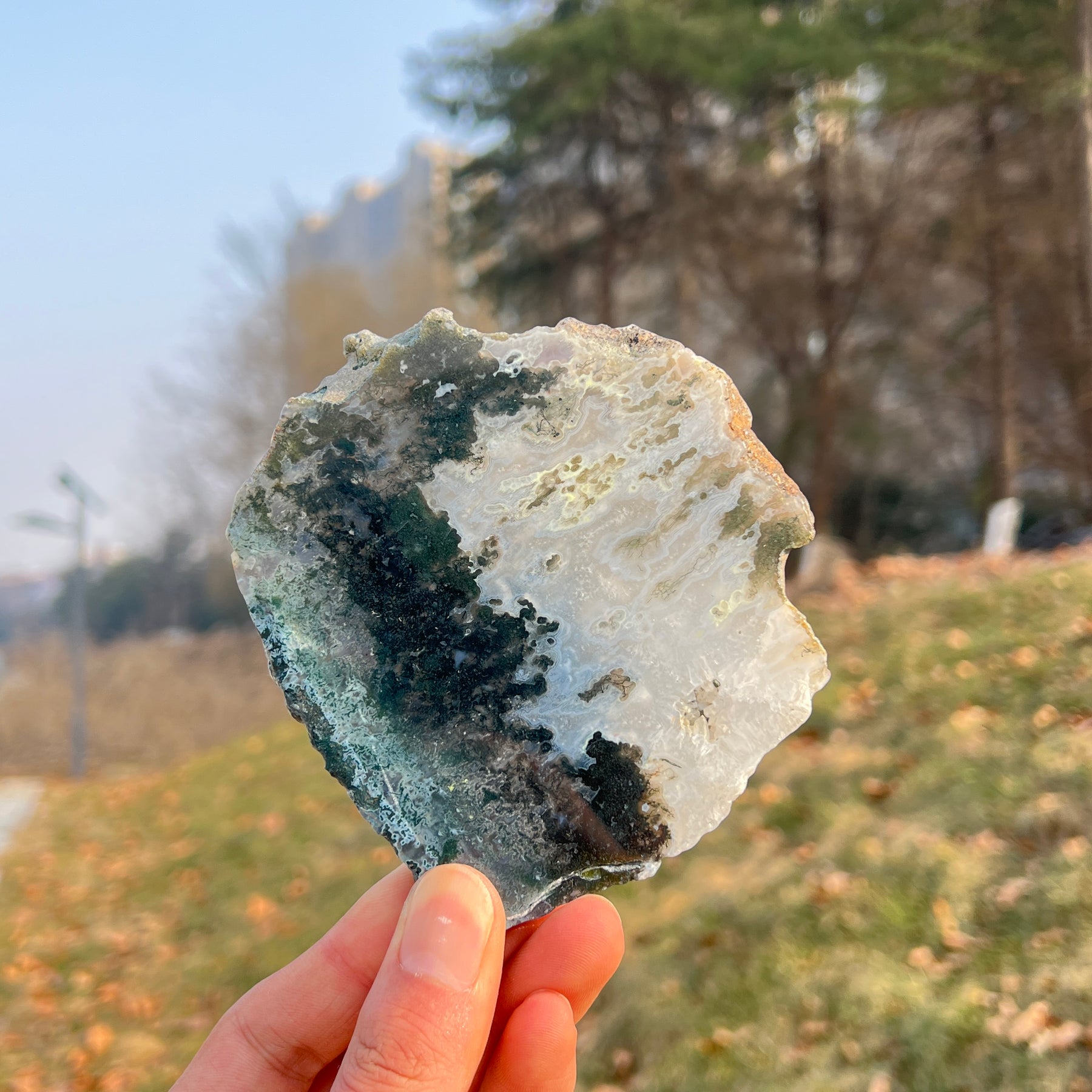 🌟Features:These striking pieces are crafted from natural Moss Agate—a mineral with a translucent white base and swirling green inclusions that resemble mossy forest floors or misty riverbanks, like a fragment of a hidden woodland captured in stone 🌳. They feature thin, flat, organic slices with raw, irregular edges, creating a tactile, earthy display piece that fits comfortably in the palm.This design blends earthy warmth with intentional calm: the organic shape evokes the beauty of embracing life’s natural rhythm, while the agate’s mossy hues mirror the harmony of nature’s healing and life-giving force.