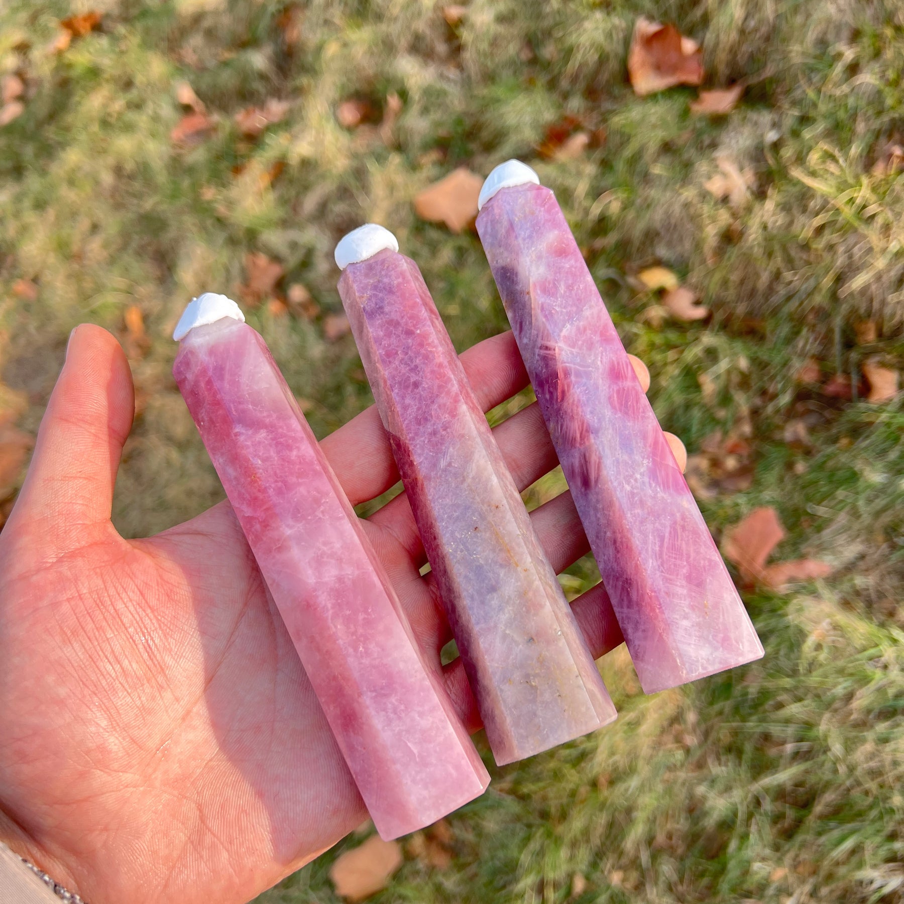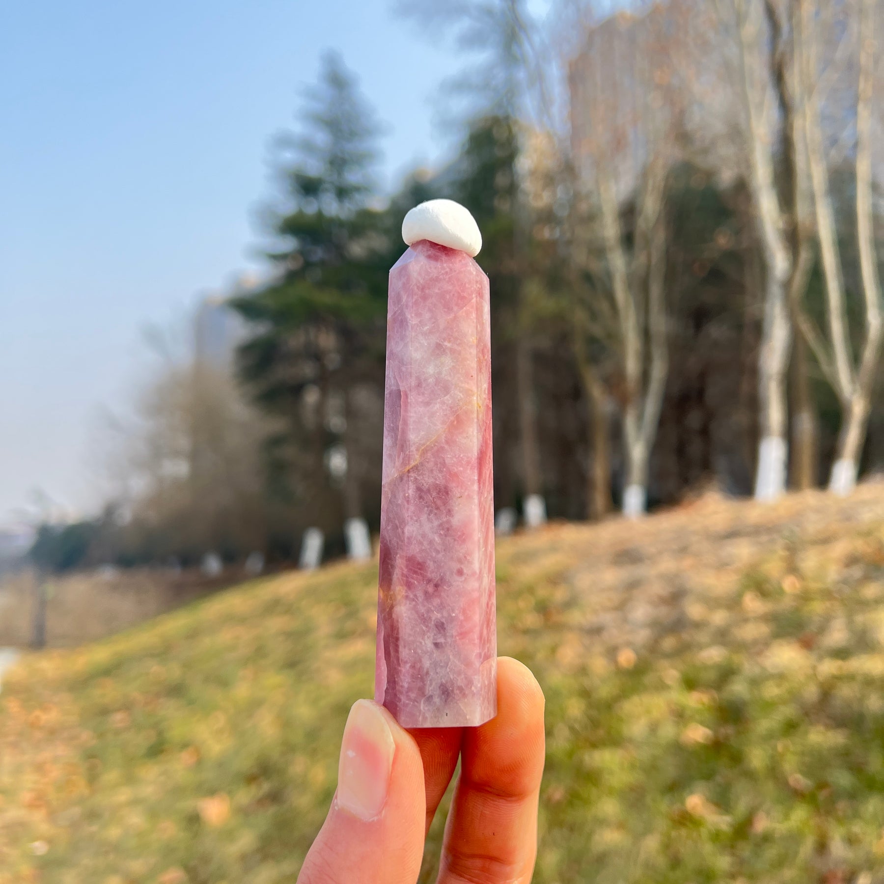 🌟Features:These striking pieces are crafted from natural Purple Rose Quartz—a mineral with a soft, lavender-pink hue and subtle, wavy white inclusions, like a fragment of a twilight garden captured in stone 🌷. They are shaped into tall, hexagonal points with a sharp, faceted tip, topped with a delicate white resin cap, creating a powerful display piece that fits comfortably in the palm.This design blends gentle warmth with intentional energy: the sharp tip evokes the clarity to move forward with purpose, while the quartz’s lavender hues mirror the harmony of nurturing self-love and heartfelt connection.