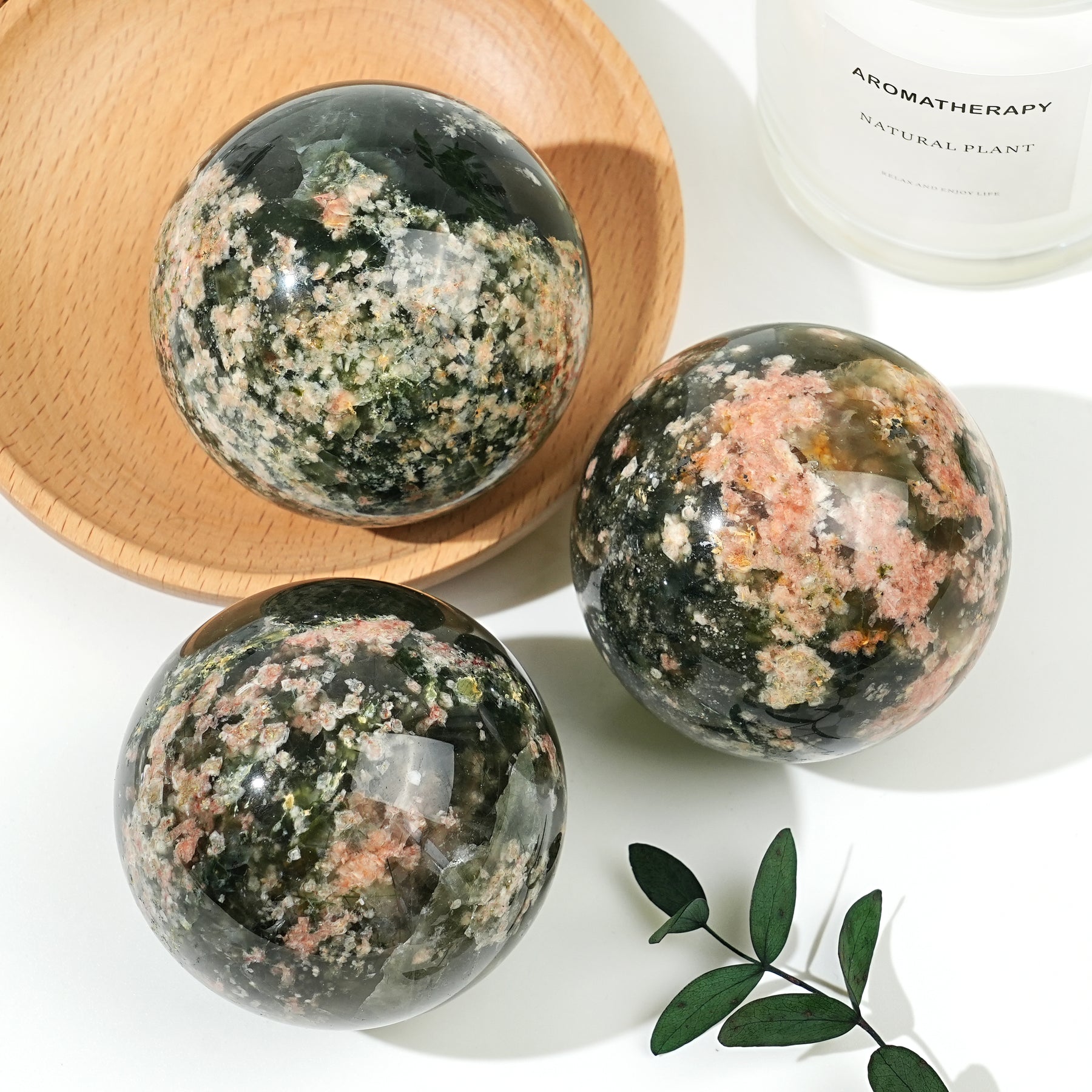 🌟Features: These Natural Green Rutilated Spheres are showstoppers! Featuring a stunning blend of deep green and delicate pinkish flecks, each orb looks like a tiny, glittering universe you can hold in your hand 🌌. No two are alike, making them unique decor statement pieces or mystical spiritual treasures.
