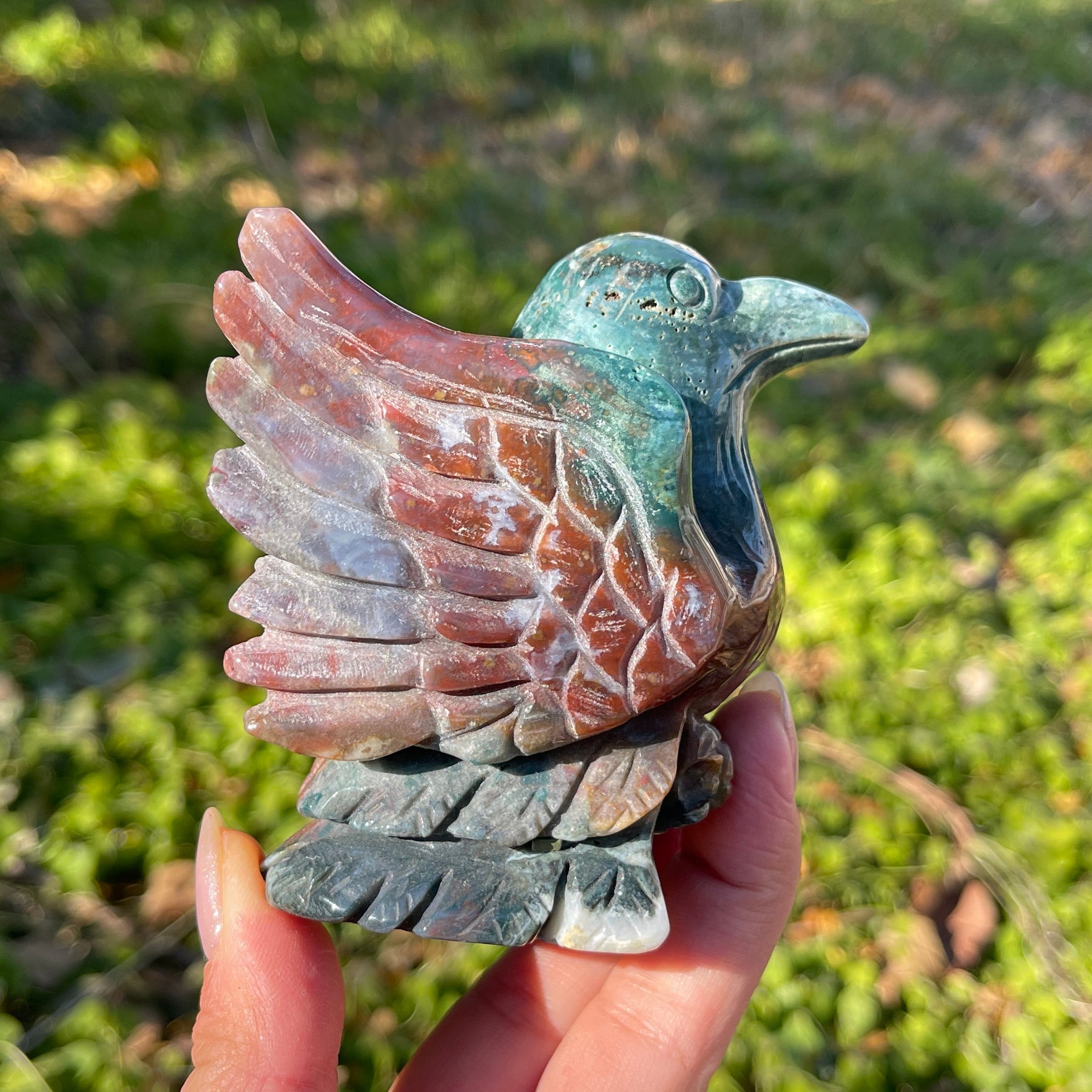 🌟Features:This crafted from natural Ocean Jasper—a mineral with rich, swirling bands of mossy green, warm terracotta, and soft lavender, like a sunlit coastal meadow captured in stone 🌊. It depicts a poised bird with detailed, layered wings and a sharp, alert beak, creating a sense of dynamic, grounded grace. The stone’s unique marbled patterns highlight the intricate feather textures and lifelike posture, making it feel like a tiny fragment of coastal serenity and wild freedom.This design blends earthy warmth with intentional energy: the bird’s poised form evokes the courage to rise above challenges, while the jasper’s varied hues mirror the harmony of both grounded stability and elevated vision. No two carvings are identical, making your piece a one-of-a-kind accent for altars, desks, or any nook that needs a dose of uplifting, balanced energy.