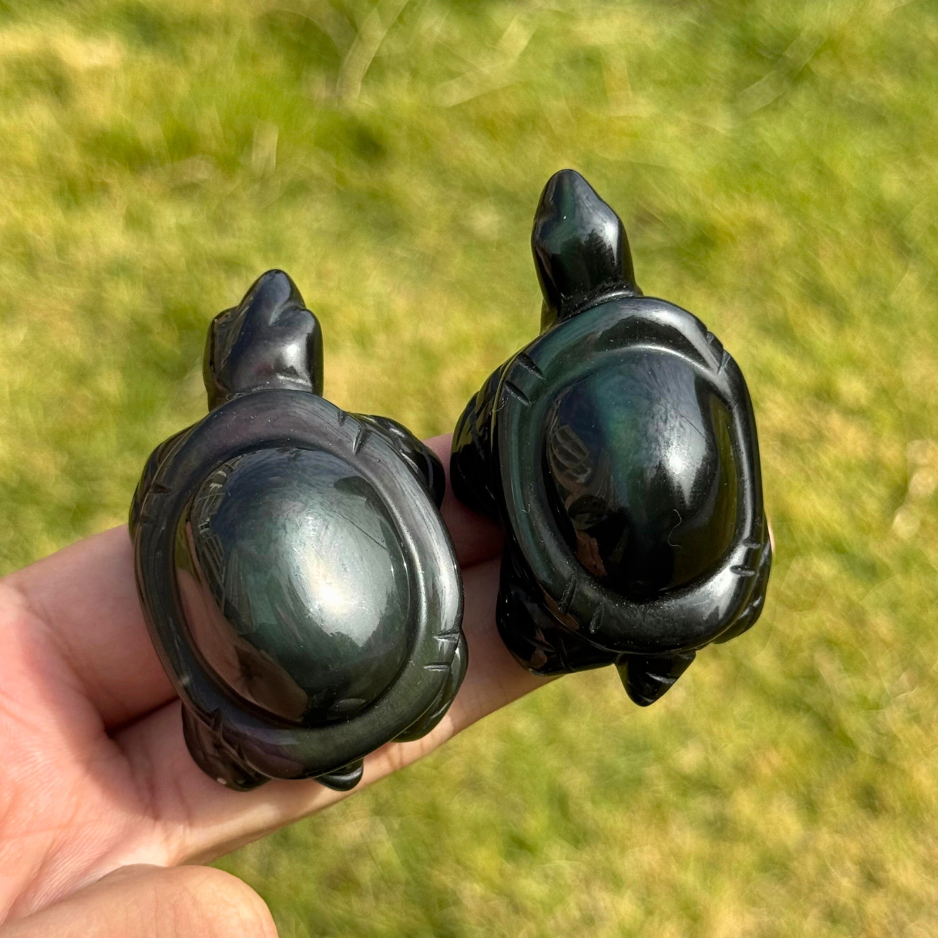 Genuine rainbow obsidian carved into a charming turtle—boasts iridescent rainbow sheen and unique patterns (no two alike). The turtle symbolizes wisdom and patience, inspiring steady progress and trust in life’s journey.