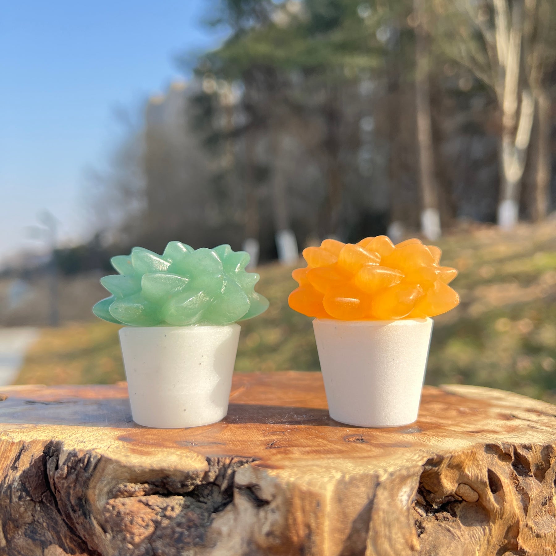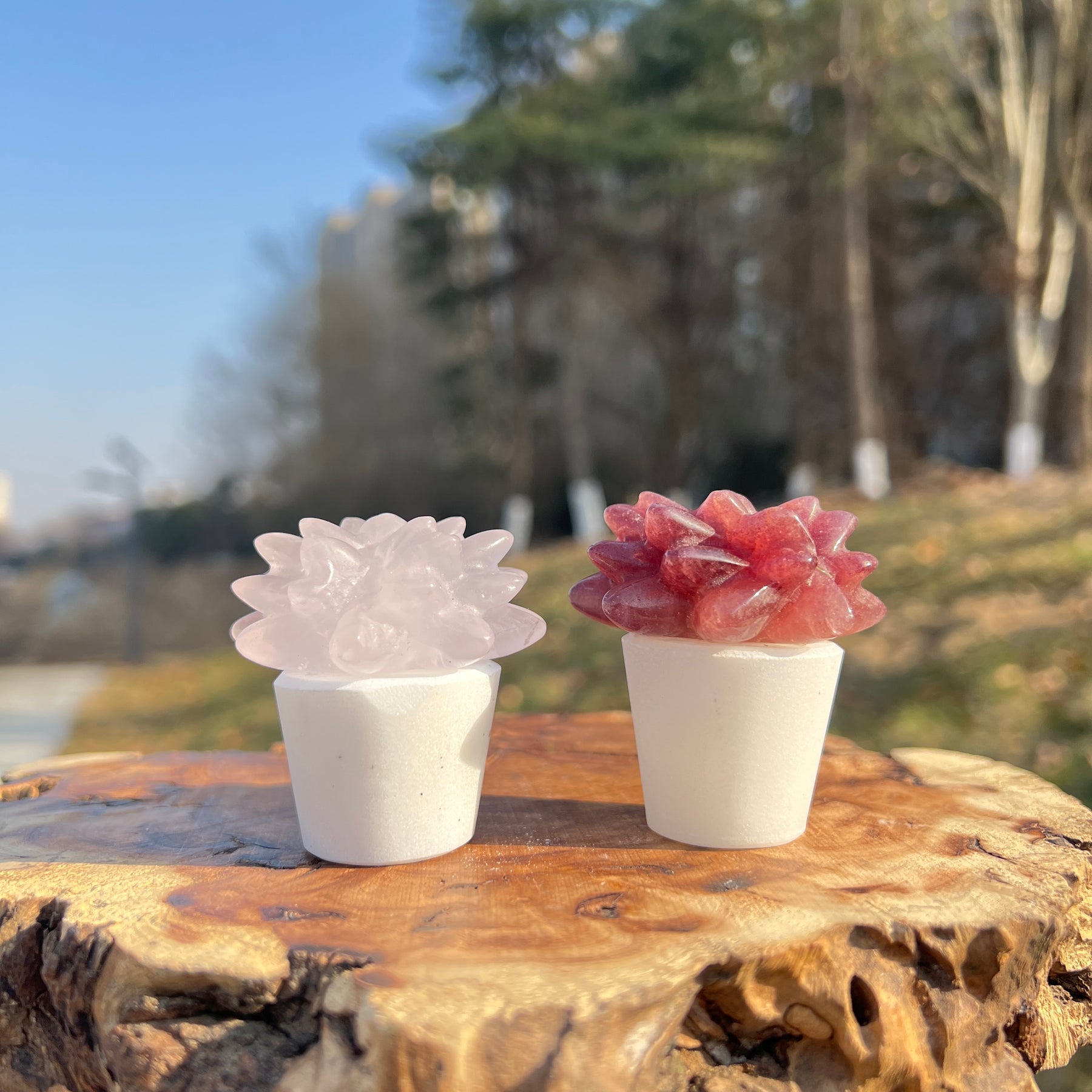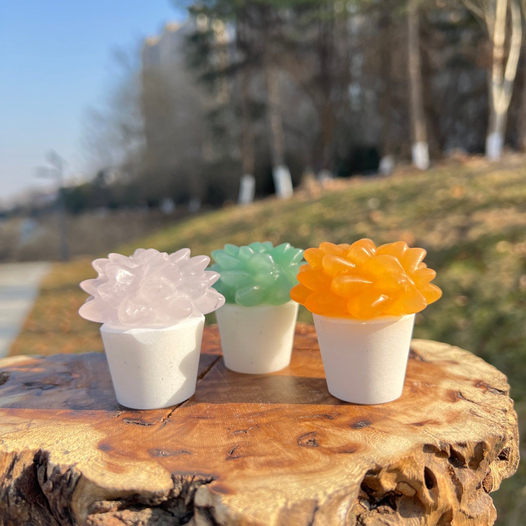 🌟Features:These crafted from natural crystal, shaped into lifelike succulent rosettes and nestled in smooth, white stone pots. Each succulent features unique natural hues—from soft pink and sunny orange to gentle green and translucent white—creating a collection of tiny, vibrant potted plants that fit perfectly in the palm of your hand.Inspired by the succulent’s symbolism of resilience, growth, and gentle nourishment, this design celebrates the beauty of thriving in small, steady ways. The layered, fleshy leaves evoke the strength to endure and grow, while the varied natural hues mirror the richness of embracing life’s quiet, consistent moments. No two carvings are identical, making your piece a one-of-a-kind accent for desks, windowsills, or any nook that needs a dose of cheerful, grounded energy.