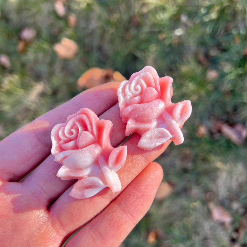 🌟Features: Hand-carved from natural Pink Opal, these rose flower pieces showcase soft, blushing pink hues with subtle white mineral veining—each bloom’s delicate, layered petals are uniquely textured! Their romantic, lifelike design sparks inspiration for self-love and gentle grace, adding a tender, whimsical charm to any space 🌸✨.