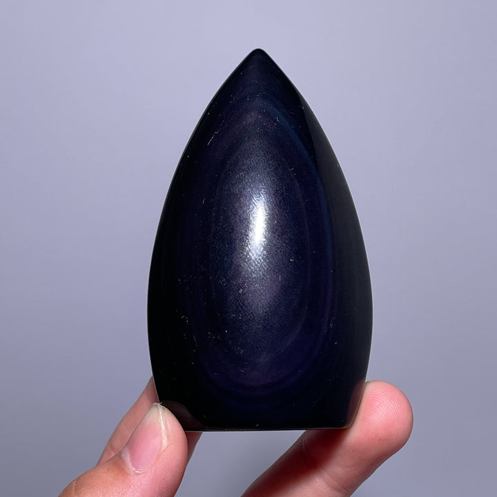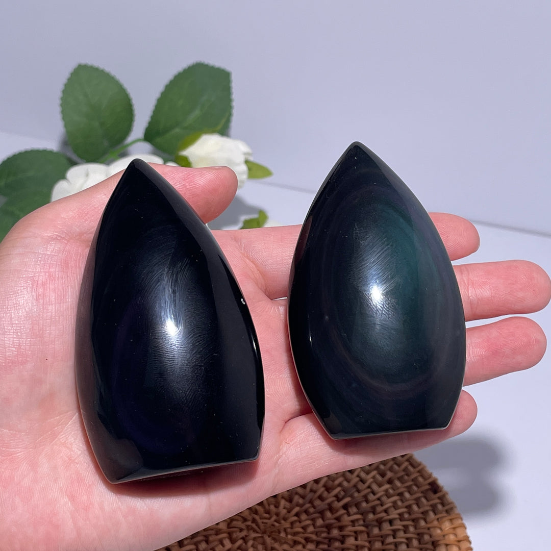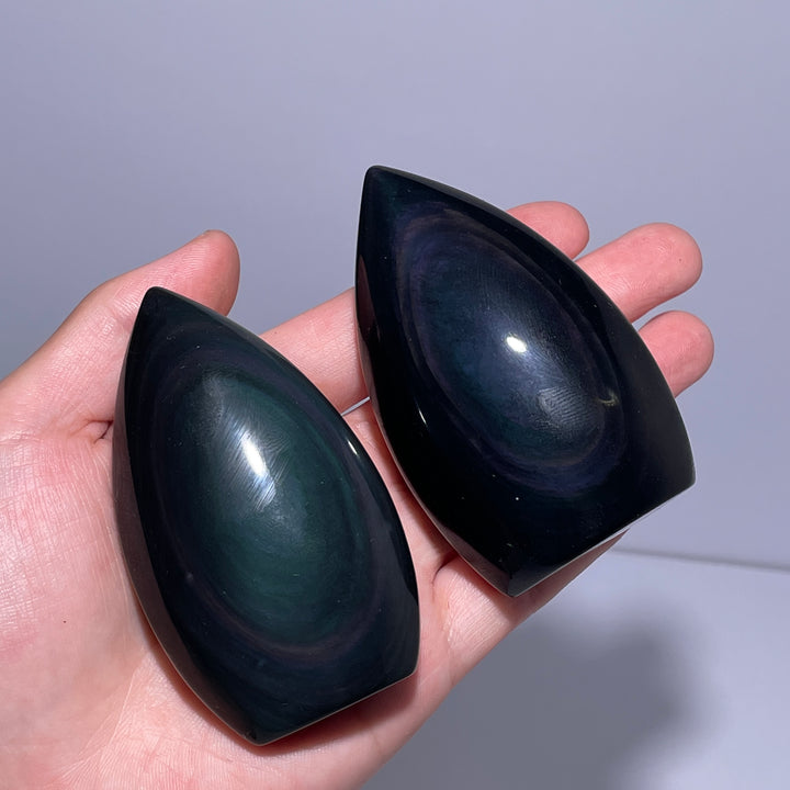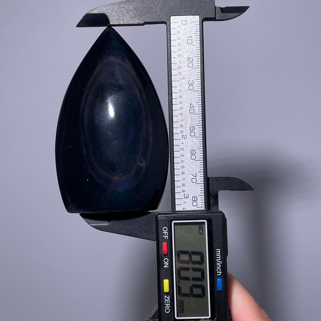 Discover the mesmerizing beauty of the Rainbow Obsidian WaterDrop. Hand-polished to perfection, this teardrop-shaped stone showcases obsidian's natural iridescence, with swirls of vibrant green and subtle flashes of rainbow hues. Measuring approximately 80mm tall, it fits comfortably in the palm of your hand, inviting touch and contemplation.